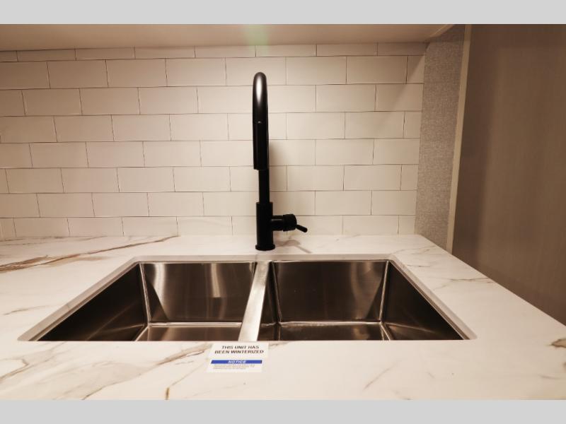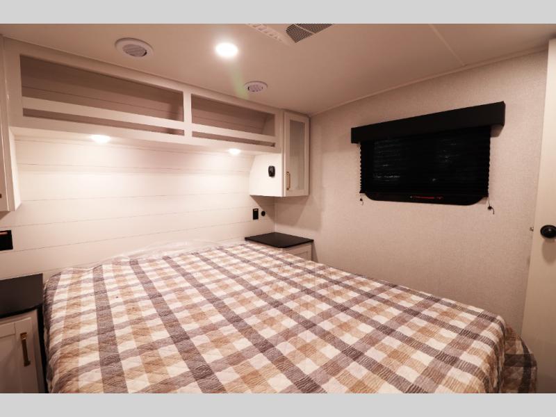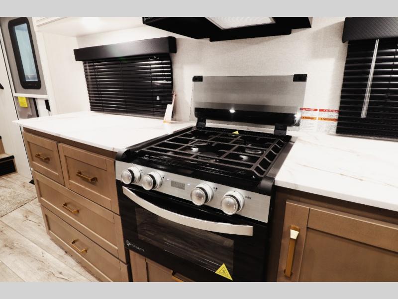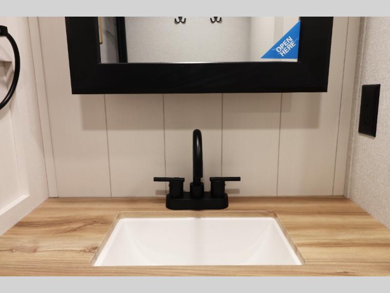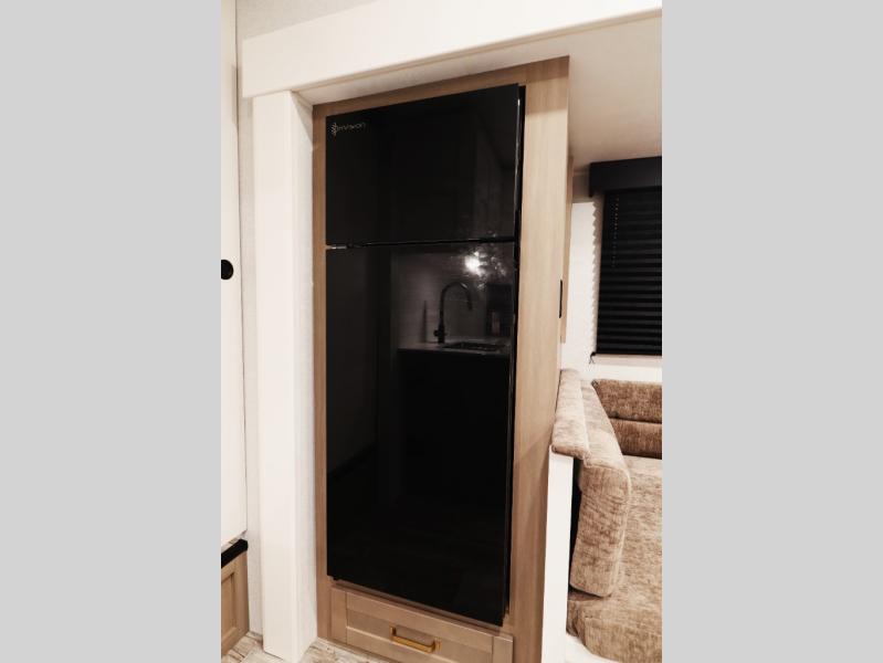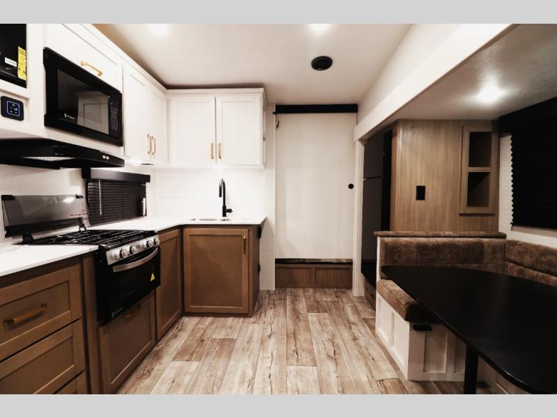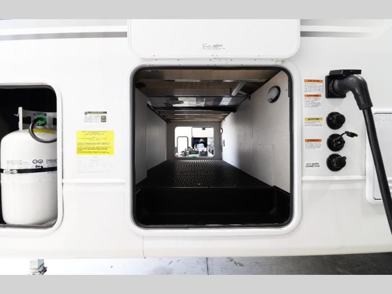 Mandatory Customer Value Package: 60K BTU on-demand water heater, 8 cu ft 12V fridge, 50-amp service, Bluetooth audio, dual A/C prep, LED awning, keyed-alike locks.