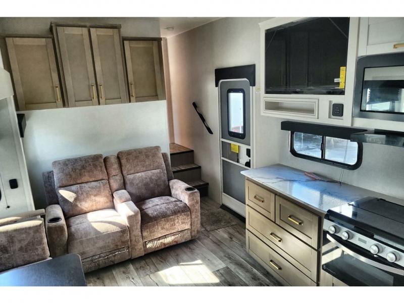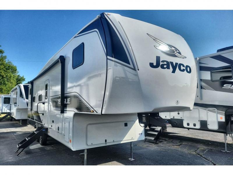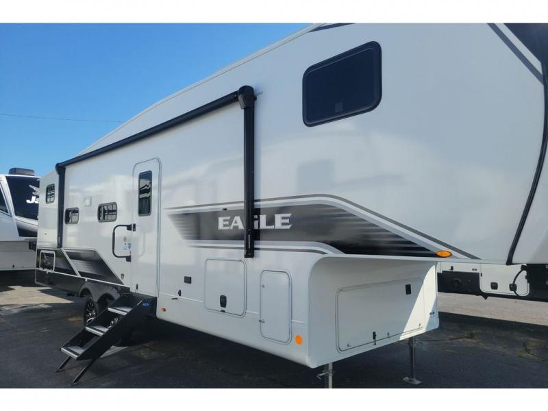 With any Eagle SLE fifth wheel by Jayco, you will enjoy a lighter tow weight, high-end finishes, and the same quality construction you've come to expect from Jayco! There is an Alpha Ply TPO roof membrane, a fully enclosed and heated underbelly, plus Stronghold VBL walls for added durability. There is also a rear 2" towing receiver outside, along with metal slam latch baggage doors, MORryde Step Above entry steps, and a Winegard Air 360 antenna with router prep if you want to stay connected as you camp. Once inside you'll enjoy the handcrafted and glazed door/drawer fronts, blackout pleated shades throughout, and residential vinyl flooring throughout with no carpet for an easier clean. The on-demand water heater, 30K BTU furnace, and 15K BTU "Whisper Quiet" A/C will ensure your comfort year around, and the optional Overland 1 Solar Package can be added if you need off-grid capabilities!