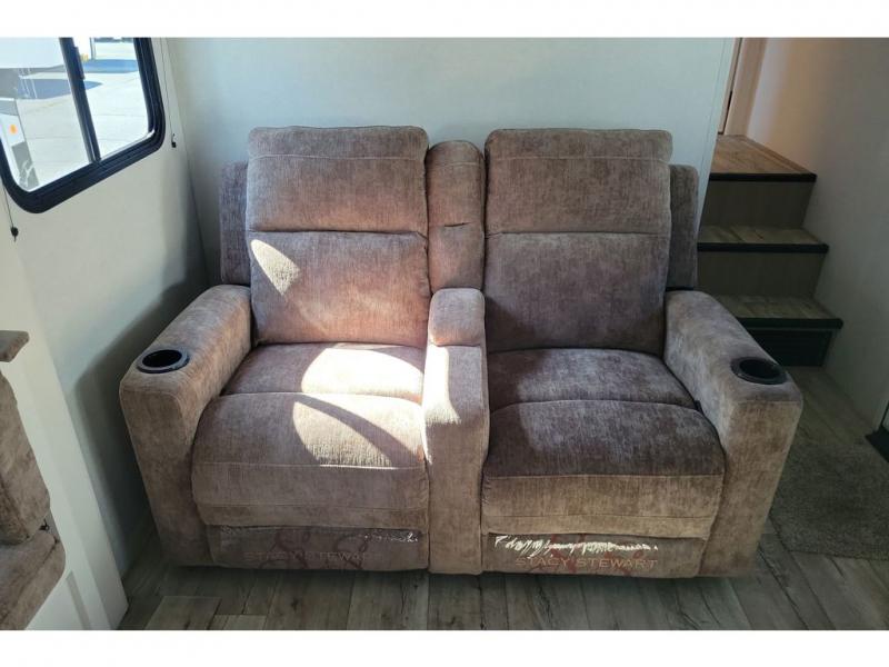 If you enjoy camping with a larger group, this fifth wheel is perfect for you! The rear bunkhouse includes double-size bunks, bunk storage and a wardrobe to keep this space tidy. You'll have the front private bedroom all to yourselves with a queen bed, and if you have any other guests, they can sleep on the tri-fold sofa and U-shaped dinette in the main living area. This space is also shared with the full kitchen, complete with a microwave and range, 12V refrigerator, and plenty of overhead cabinets for storage. After dinner, head outdoors to enjoy the 19' power awning with LED lights as you relax in your camp chairs!