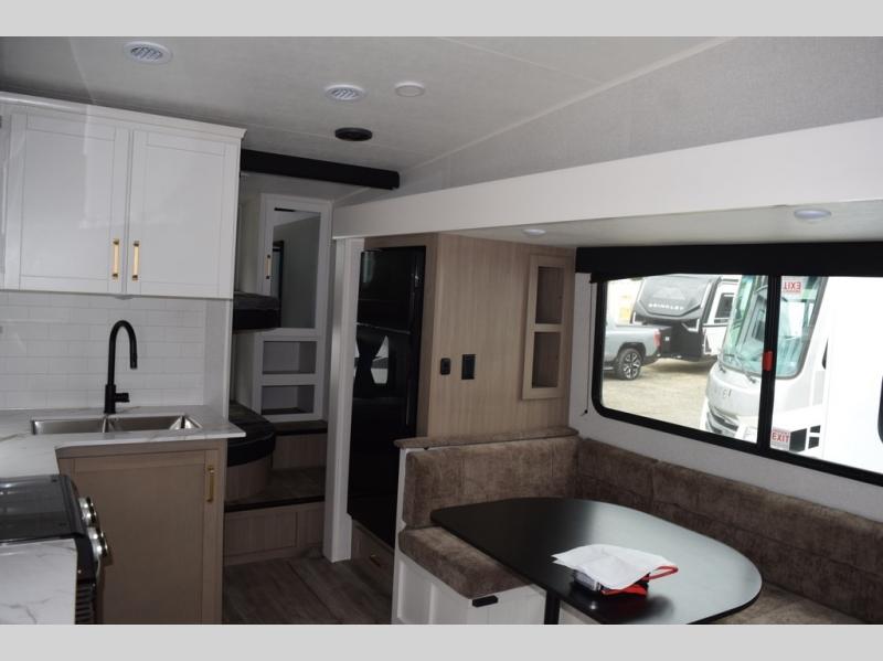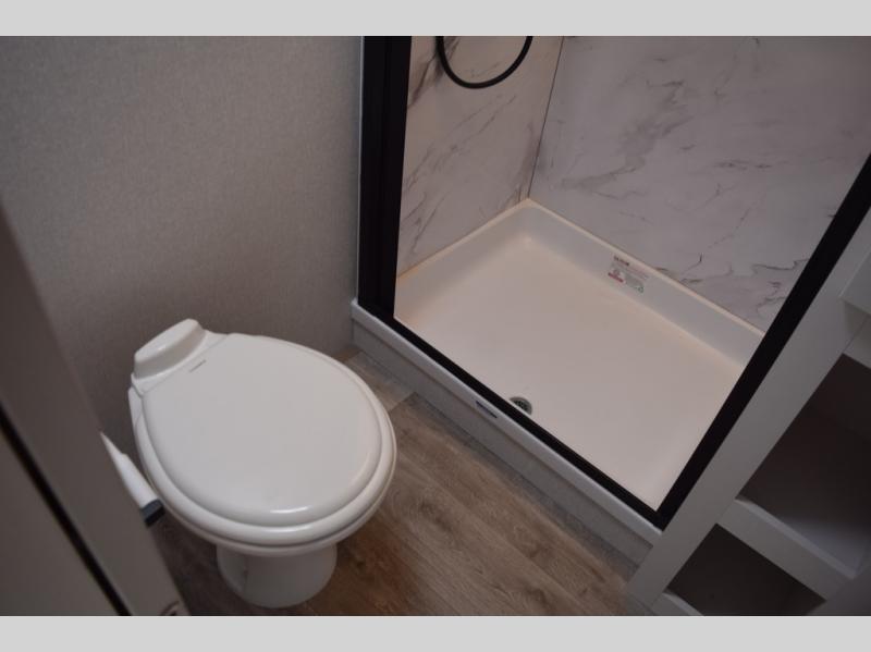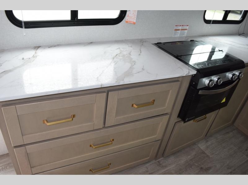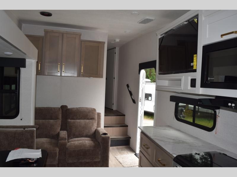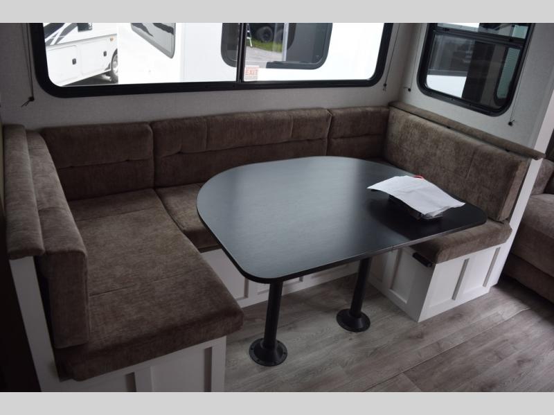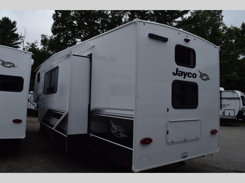 With any Eagle SLE fifth wheel by Jayco, you will enjoy a lighter tow weight, high-end finishes, and the same quality construction you've come to expect from Jayco! There is an Alpha Ply TPO roof membrane, a fully enclosed and heated underbelly, plus Stronghold VBL walls for added durability. There is also a rear 2" towing receiver outside, along with metal slam latch baggage doors, MORryde Step Above entry steps, and a Winegard Air 360 antenna with router prep if you want to stay connected as you camp. Once inside you'll enjoy the handcrafted and glazed door/drawer fronts, blackout pleated shades throughout, and residential vinyl flooring throughout with no carpet for an easier clean. The on-demand water heater, 30K BTU furnace, and 15K BTU "Whisper Quiet" A/C will ensure your comfort year around, and the optional Overland 1 Solar Package can be added if you need off-grid capabilities!