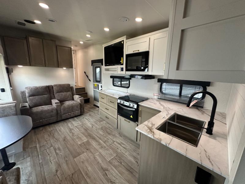 With any Eagle SLE fifth wheel by Jayco, you will enjoy a lighter tow weight, high-end finishes, and the same quality construction you've come to expect from Jayco! There is an Alpha Ply TPO roof membrane, a fully enclosed and heated underbelly, plus Stronghold VBL walls for added durability. There is also a rear 2" towing receiver outside, along with metal slam latch baggage doors, MORryde Step Above entry steps, and a Winegard Air 360 antenna with router prep if you want to stay connected as you camp. Once inside you'll enjoy the handcrafted and glazed door/drawer fronts, blackout pleated shades throughout, and residential vinyl flooring throughout with no carpet for an easier clean. The on-demand water heater, 30K BTU furnace, and 15K BTU "Whisper Quiet" A/C will ensure your comfort year around, and the optional Overland 1 Solar Package can be added if you need off-grid capabilities!