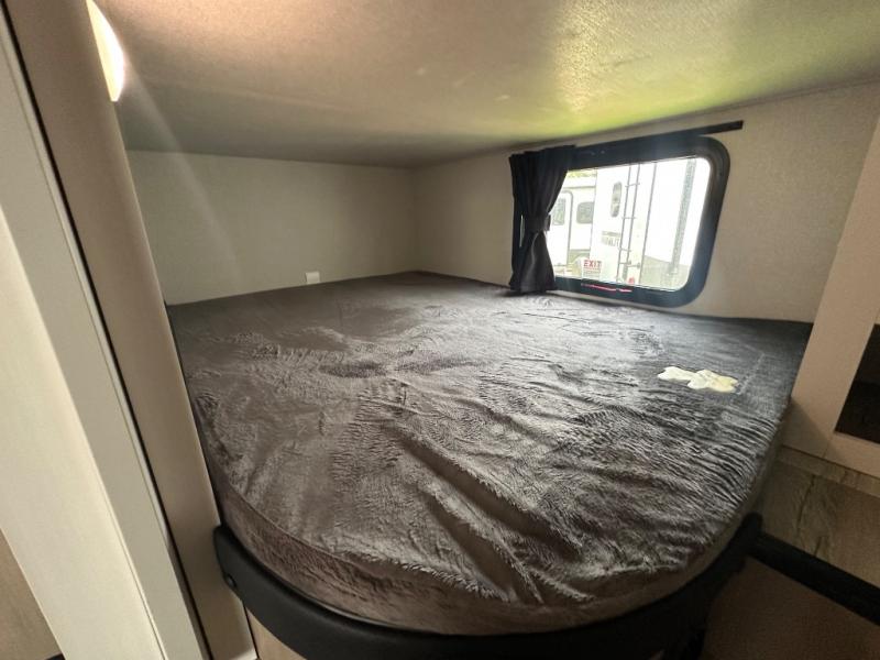 If you enjoy camping with a larger group, this fifth wheel is perfect for you! The rear bunkhouse includes double-size bunks, bunk storage and a wardrobe to keep this space tidy. You'll have the front private bedroom all to yourselves with a queen bed, and if you have any other guests, they can sleep on the tri-fold sofa and U-shaped dinette in the main living area. This space is also shared with the full kitchen, complete with a microwave and range, 12V refrigerator, and plenty of overhead cabinets for storage. After dinner, head outdoors to enjoy the 19' power awning with LED lights as you relax in your camp chairs!