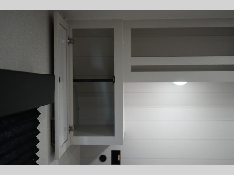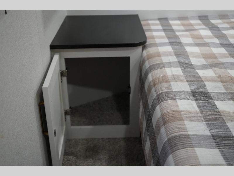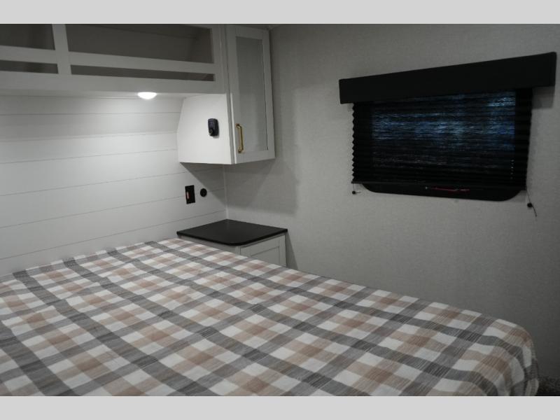 Front Private Bedroom: Relax in your own retreat with a queen bed, wardrobe storage, and overhead cabinets.