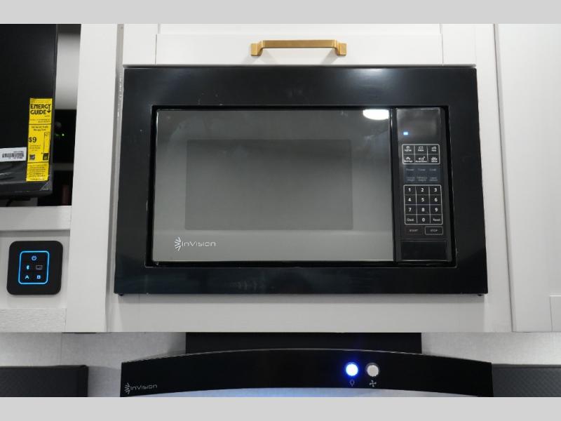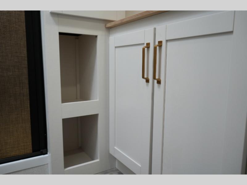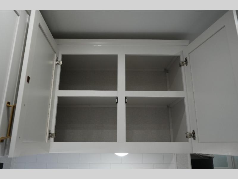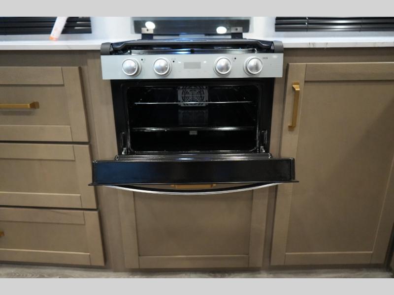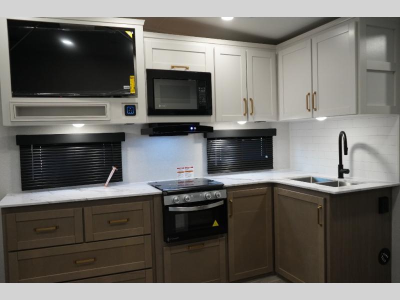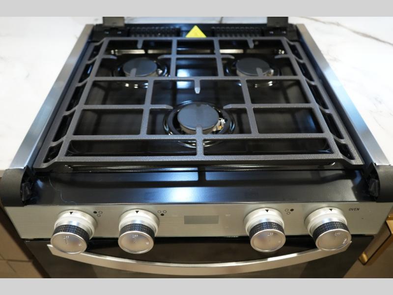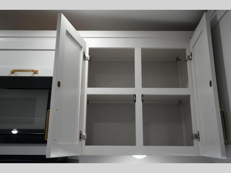 Fully Equipped Kitchen: Enjoy a 12V refrigerator, microwave, three-burner range, and abundant cabinet storage for all your camping essentials.