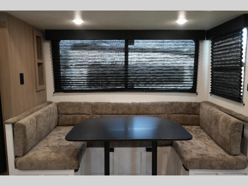 Open Living Area: The tri-fold sofa and U-shaped dinette offer extra sleeping space and a comfortable spot to gather.