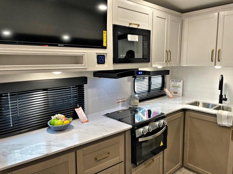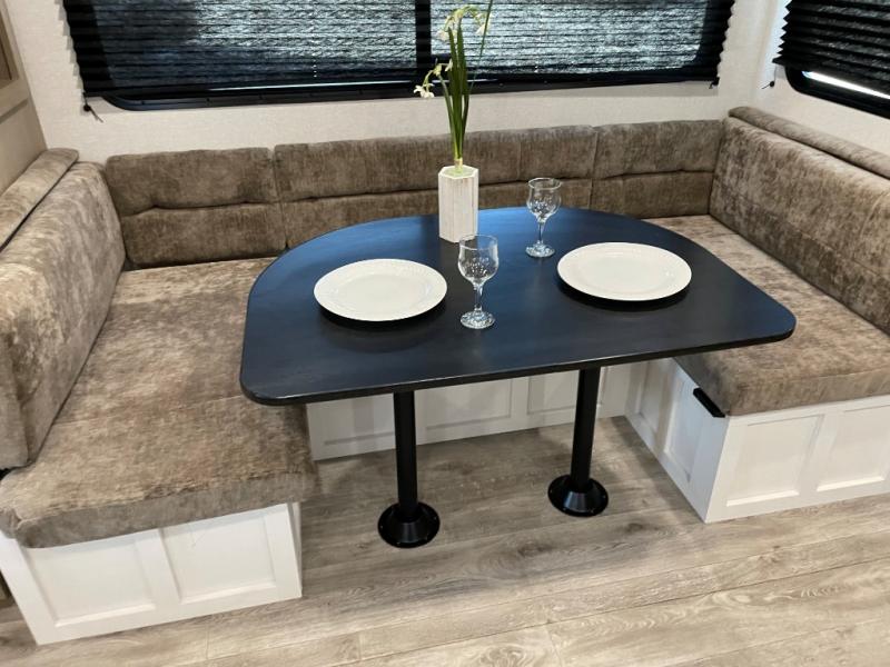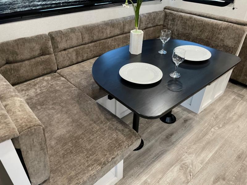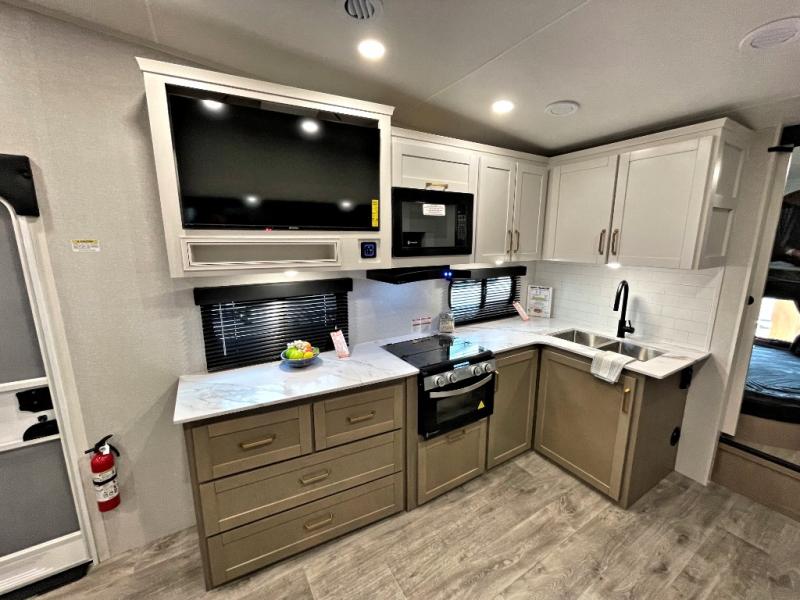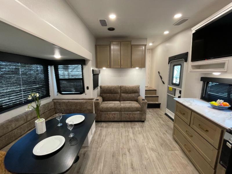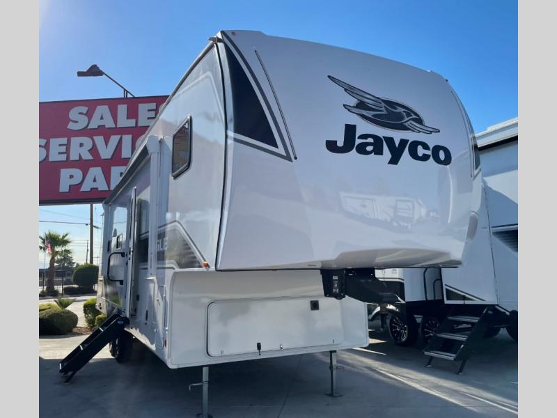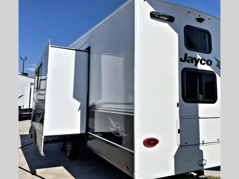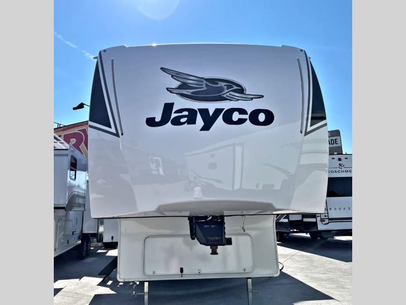 With any Eagle SLE fifth wheel by Jayco, you will enjoy a lighter tow weight, high-end finishes, and the same quality construction you've come to expect from Jayco! There is an Alpha Ply TPO roof membrane, a fully enclosed and heated underbelly, plus Stronghold VBL walls for added durability. There is also a rear 2" towing receiver outside, along with metal slam latch baggage doors, MORryde Step Above entry steps, and a Winegard Air 360 antenna with router prep if you want to stay connected as you camp. Once inside you'll enjoy the handcrafted and glazed door/drawer fronts, blackout pleated shades throughout, and residential vinyl flooring throughout with no carpet for an easier clean. The on-demand water heater, 30K BTU furnace, and 15K BTU "Whisper Quiet" A/C will ensure your comfort year around, and the optional Overland 1 Solar Package can be added if you need off-grid capabilities!