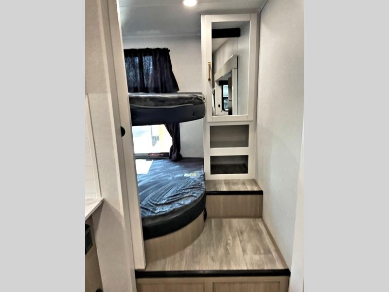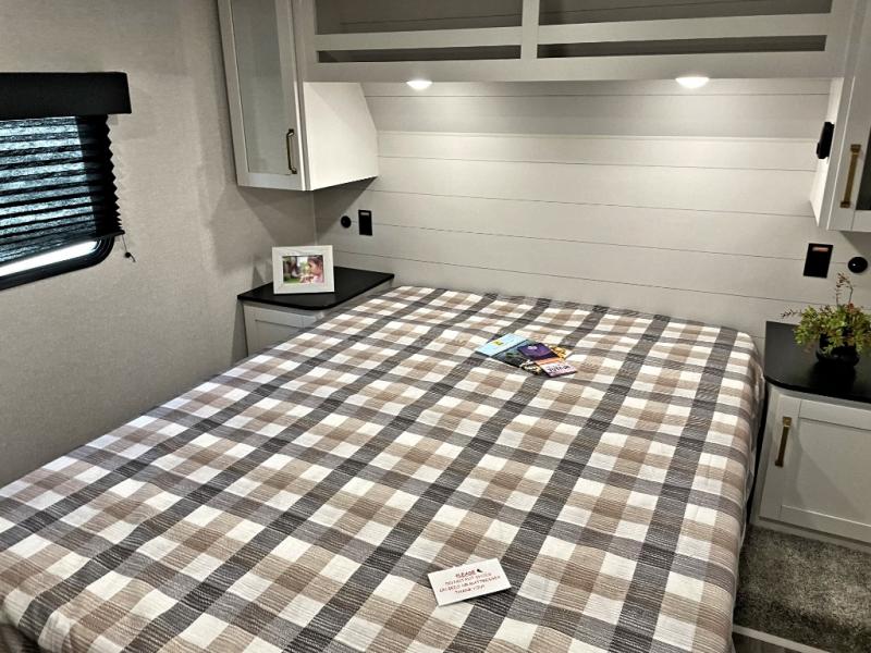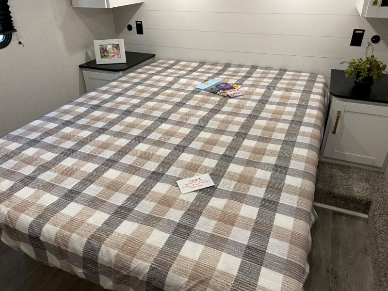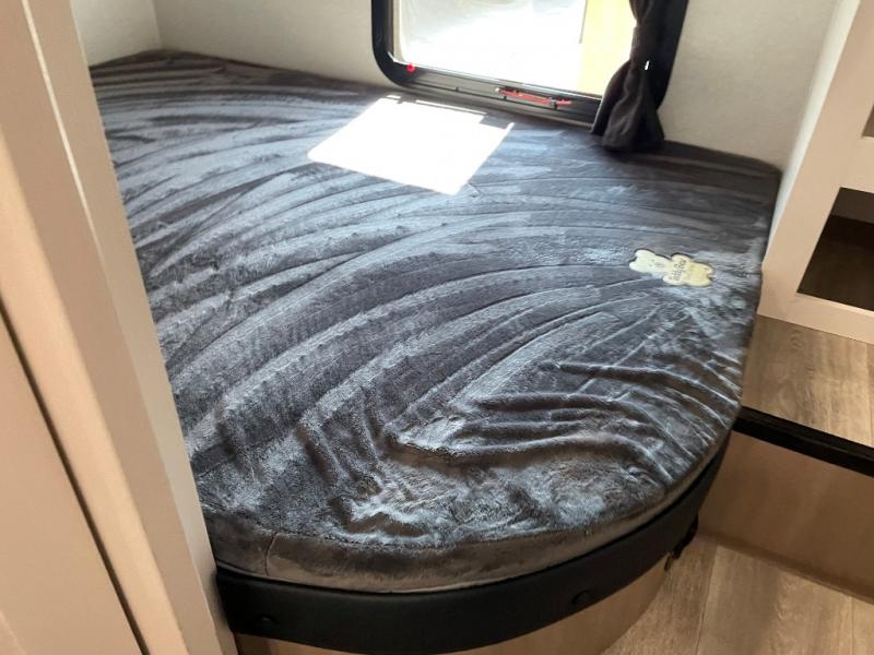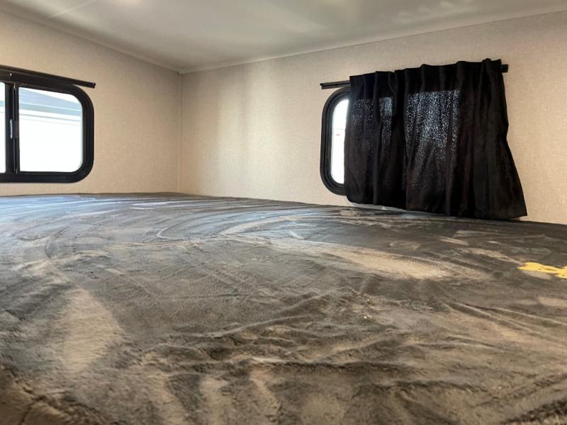 If you enjoy camping with a larger group, this fifth wheel is perfect for you! The rear bunkhouse includes double-size bunks, bunk storage and a wardrobe to keep this space tidy. You'll have the front private bedroom all to yourselves with a queen bed, and if you have any other guests, they can sleep on the tri-fold sofa and U-shaped dinette in the main living area. This space is also shared with the full kitchen, complete with a microwave and range, 12V refrigerator, and plenty of overhead cabinets for storage. After dinner, head outdoors to enjoy the 19' power awning with LED lights as you relax in your camp chairs!