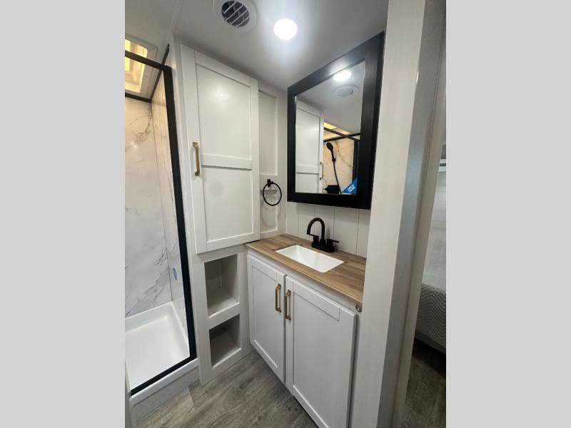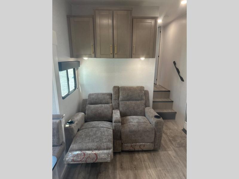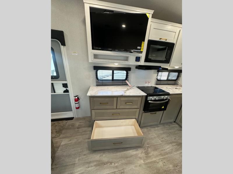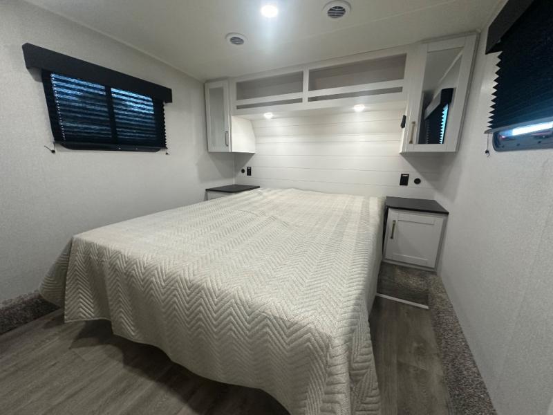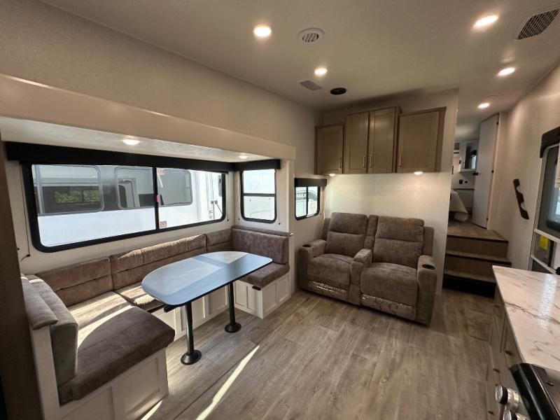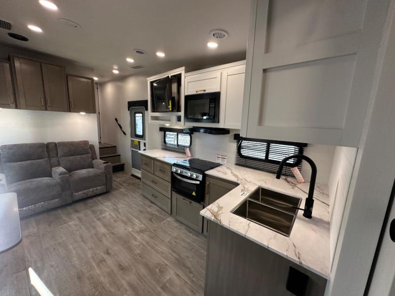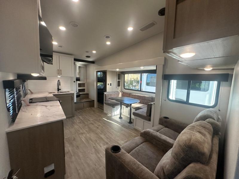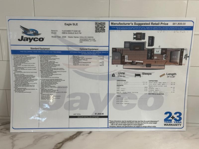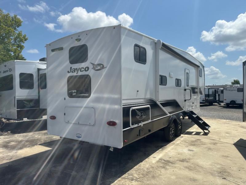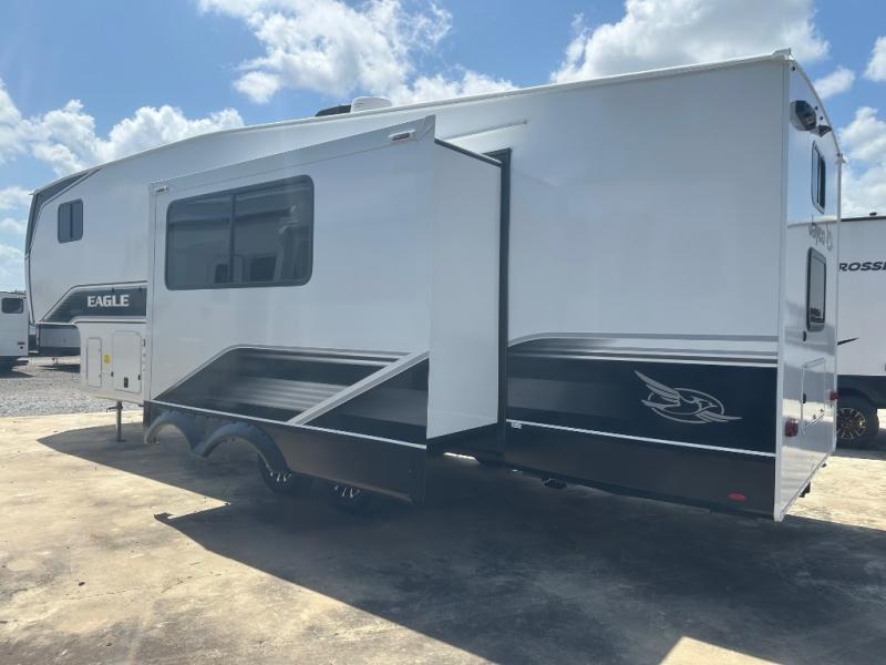 With any Eagle SLE fifth wheel by Jayco, you will enjoy a lighter tow weight, high-end finishes, and the same quality construction you've come to expect from Jayco! There is an Alpha Ply TPO roof membrane, a fully enclosed and heated underbelly, plus Stronghold VBL walls for added durability. There is also a rear 2" towing receiver outside, along with metal slam latch baggage doors, MORryde Step Above entry steps, and a Winegard Air 360 antenna with router prep if you want to stay connected as you camp. Once inside you'll enjoy the handcrafted and glazed door/drawer fronts, blackout pleated shades throughout, and residential vinyl flooring throughout with no carpet for an easier clean. The on-demand water heater, 30K BTU furnace, and 15K BTU "Whisper Quiet" A/C will ensure your comfort year around, and the optional Overland 1 Solar Package can be added if you need off-grid capabilities!