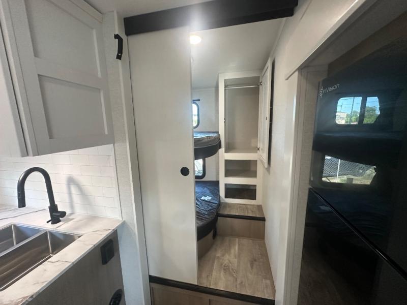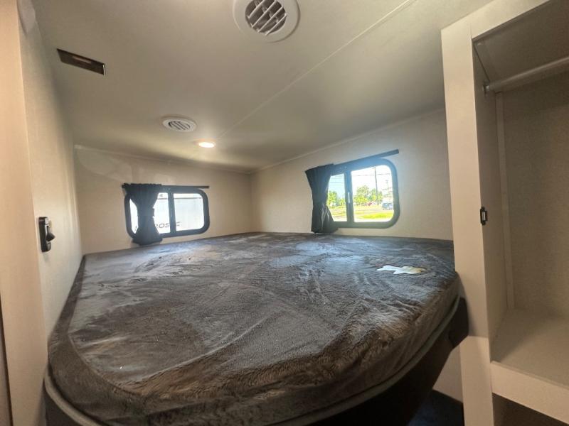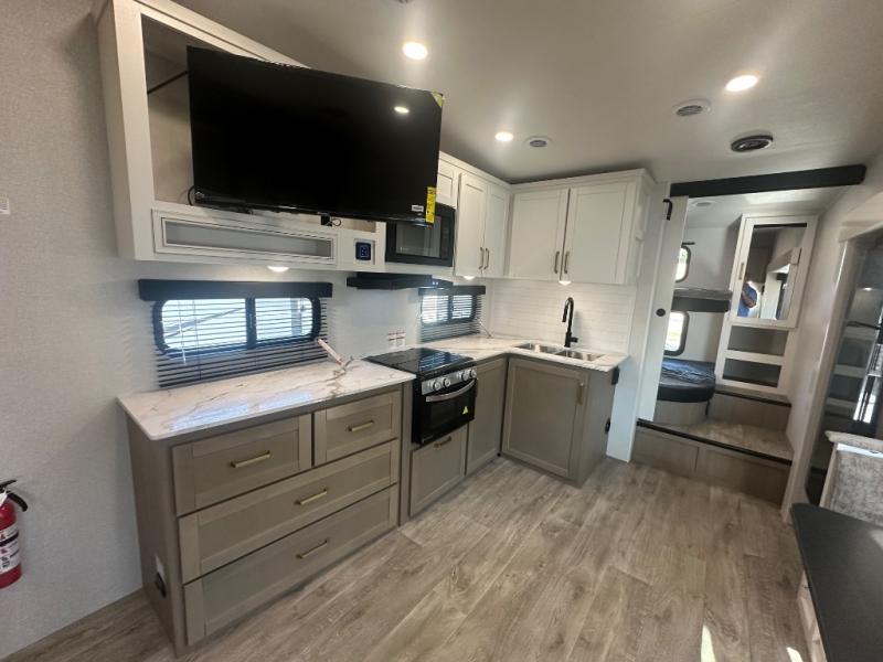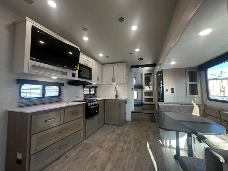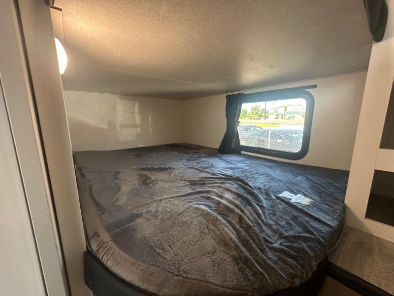 If you enjoy camping with a larger group, this fifth wheel is perfect for you! The rear bunkhouse includes double-size bunks, bunk storage and a wardrobe to keep this space tidy. You'll have the front private bedroom all to yourselves with a queen bed, and if you have any other guests, they can sleep on the tri-fold sofa and U-shaped dinette in the main living area. This space is also shared with the full kitchen, complete with a microwave and range, 12V refrigerator, and plenty of overhead cabinets for storage. After dinner, head outdoors to enjoy the 19' power awning with LED lights as you relax in your camp chairs!