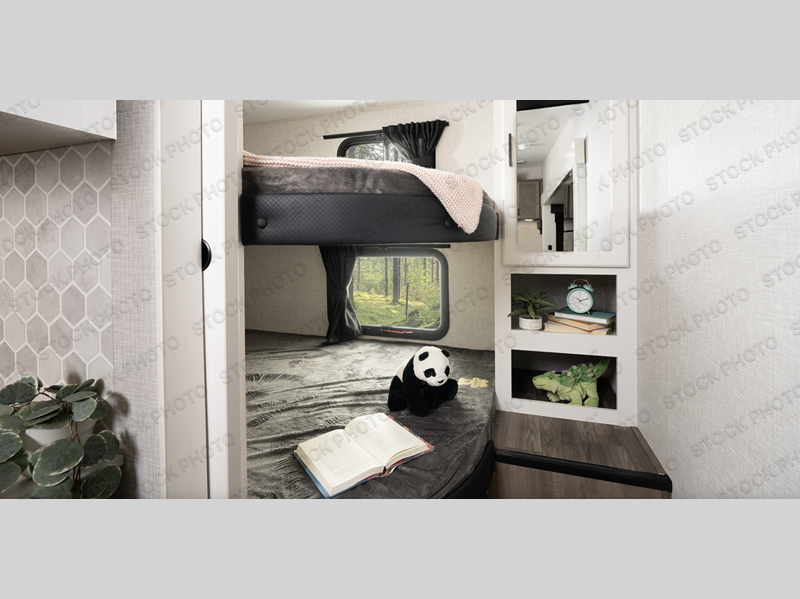 If you enjoy camping with a larger group, this fifth wheel is perfect for you! The rear bunkhouse includes double-size bunks, bunk storage and a wardrobe to keep this space tidy. You'll have the front private bedroom all to yourselves with a queen bed, and if you have any other guests, they can sleep on the tri-fold sofa and U-shaped dinette in the main living area. This space is also shared with the full kitchen, complete with a microwave and range, 12V refrigerator, and plenty of overhead cabinets for storage. After dinner, head outdoors to enjoy the 19' power awning with LED lights as you relax in your camp chairs!