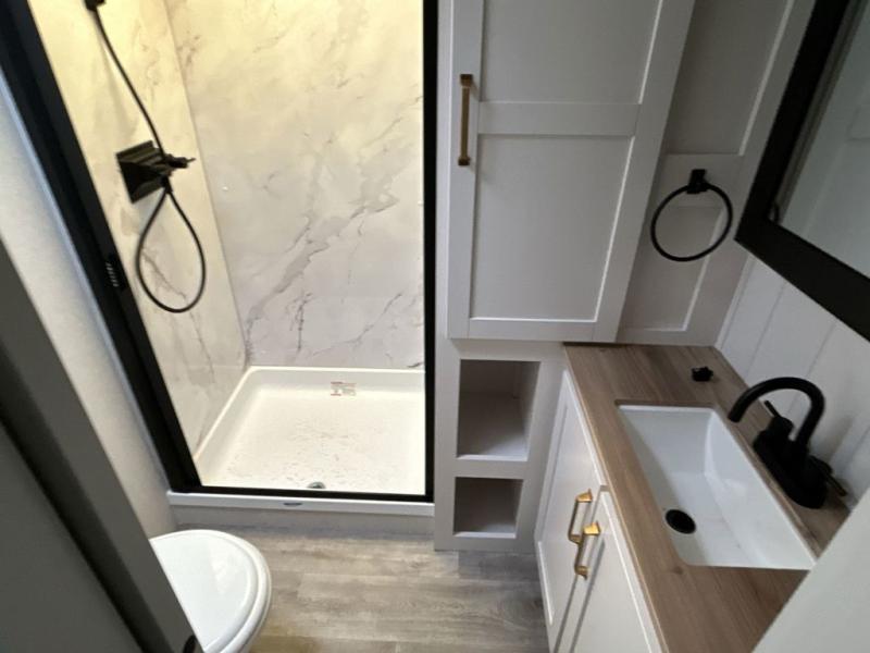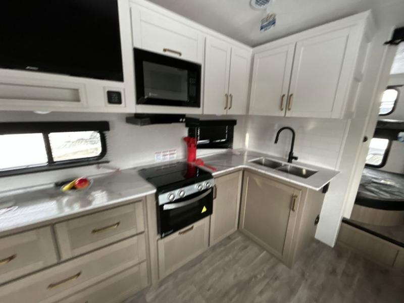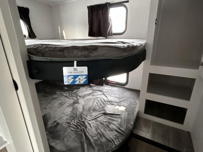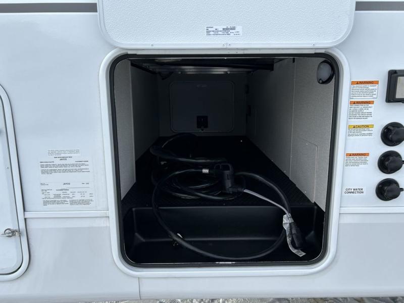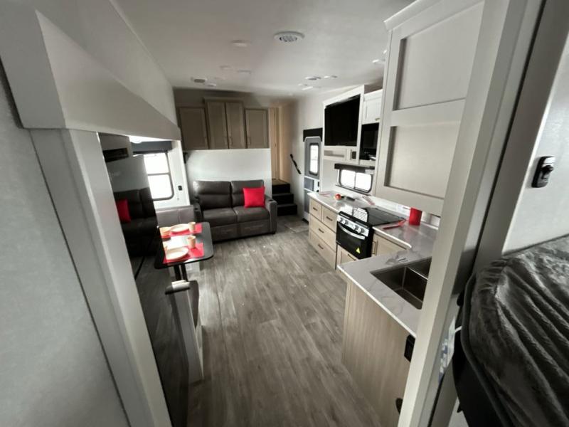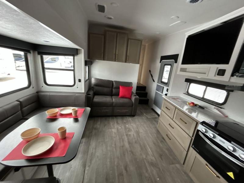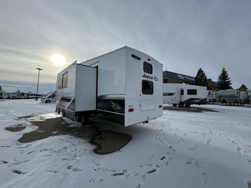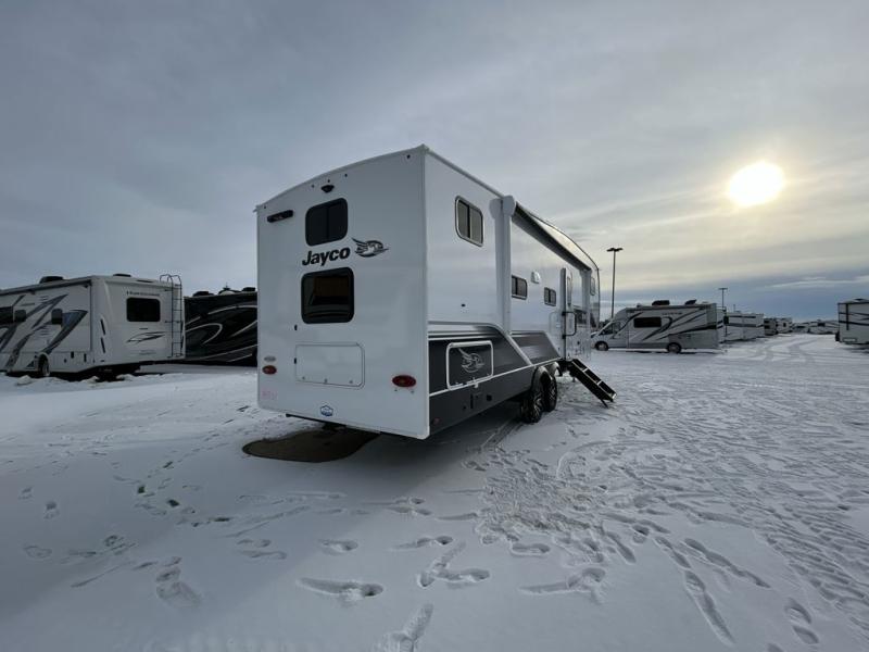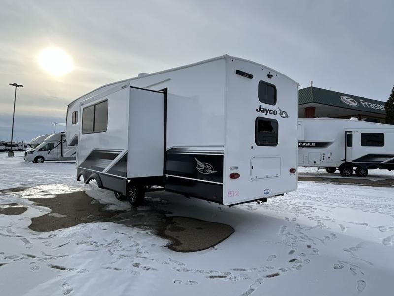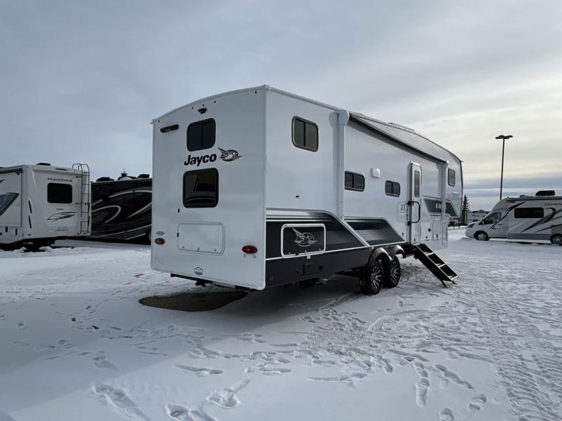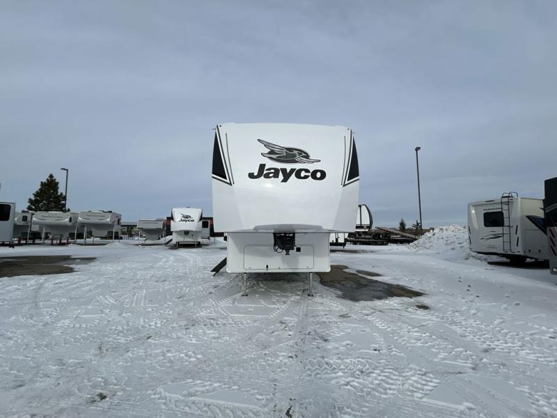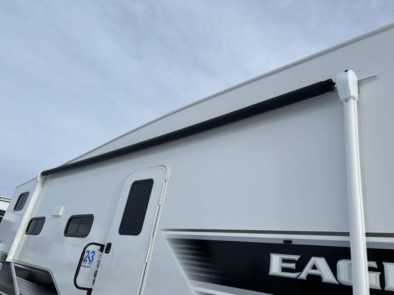 With any Eagle SLE fifth wheel by Jayco, you will enjoy a lighter tow weight, high-end finishes, and the same quality construction you've come to expect from Jayco! There is an Alpha Ply TPO roof membrane, a fully enclosed and heated underbelly, plus Stronghold VBL walls for added durability. There is also a rear 2" towing receiver outside, along with metal slam latch baggage doors, MORryde Step Above entry steps, and a Winegard Air 360 antenna with router prep if you want to stay connected as you camp. Once inside you'll enjoy the handcrafted door/drawer fronts, shower skylight, and residential vinyl flooring throughout with no carpet for an easier clean. The on-demand water heater, 30K BTU furnace, and 15K BTU "Whisper Quiet" A/C will ensure your comfort, and the Overland 1 Solar Package will provide off-grid capabilities!