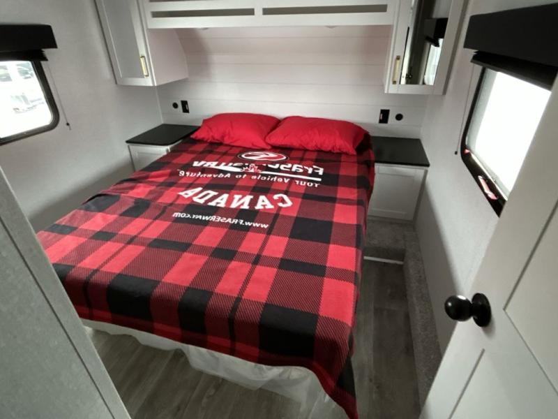 If you enjoy camping with a larger group, this fifth wheel is perfect for you! The rear bunkhouse includes double-size bunks, bunk storage and a wardrobe to keep this space tidy. You'll have the front private bedroom all to yourselves with a queen bed, and if you have any other guests, they can sleep on the tri-fold sofa and U-shaped dinette in the main living area. This space is also shared with the full kitchen, complete with a microwave and range, 12V refrigerator, and plenty of overhead cabinets for storage. After dinner, head outdoors to enjoy the 19' power awning with LED lights as you relax in your camp chairs!