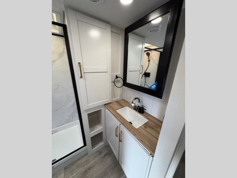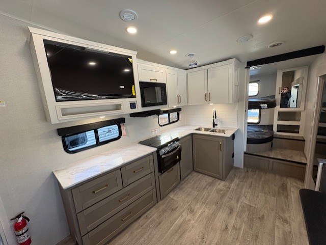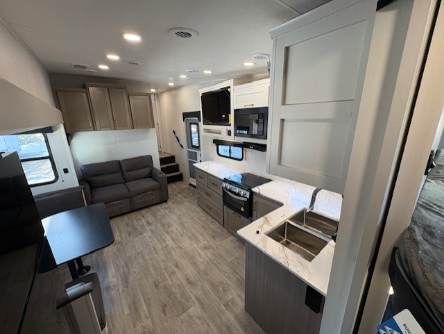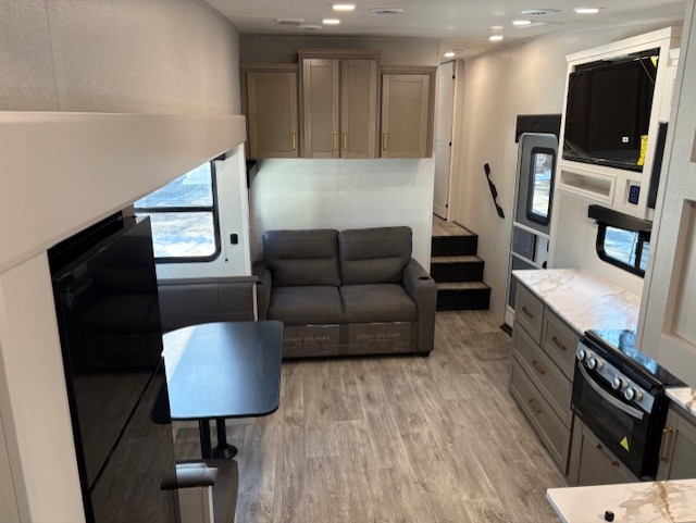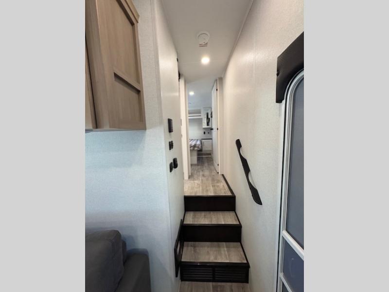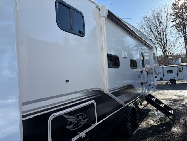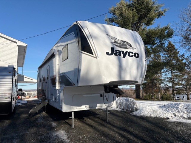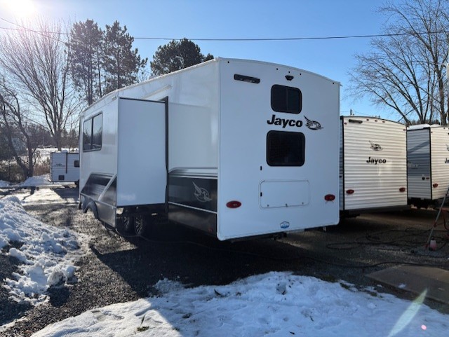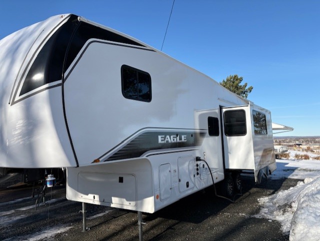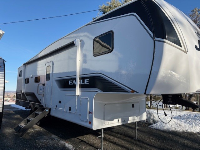 With any Eagle SLE fifth wheel by Jayco, you will enjoy a lighter tow weight, high-end finishes, and the same quality construction you've come to expect from Jayco! There is an Alpha Ply TPO roof membrane, a fully enclosed and heated underbelly, plus Stronghold VBL walls for added durability. There is also a rear 2" towing receiver outside, along with metal slam latch baggage doors, MORryde Step Above entry steps, and a Winegard Air 360 antenna with router prep if you want to stay connected as you camp. Once inside you'll enjoy the handcrafted door/drawer fronts, shower skylight, and residential vinyl flooring throughout with no carpet for an easier clean. The on-demand water heater, 30K BTU furnace, and 15K BTU "Whisper Quiet" A/C will ensure your comfort, and the Overland 1 Solar Package will provide off-grid capabilities!