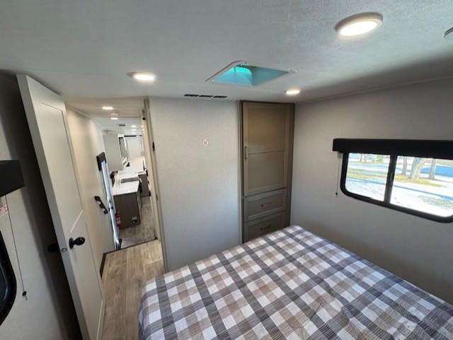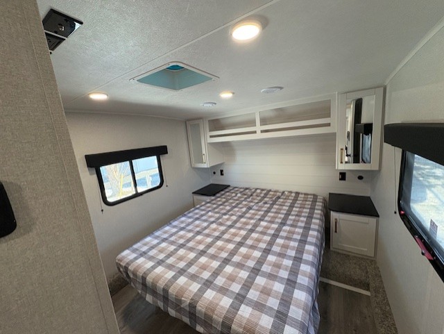 If you enjoy camping with a larger group, this fifth wheel is perfect for you! The rear bunkhouse includes double-size bunks, bunk storage and a wardrobe to keep this space tidy. You'll have the front private bedroom all to yourselves with a queen bed, and if you have any other guests, they can sleep on the tri-fold sofa and U-shaped dinette in the main living area. This space is also shared with the full kitchen, complete with a microwave and range, 12V refrigerator, and plenty of overhead cabinets for storage. After dinner, head outdoors to enjoy the 19' power awning with LED lights as you relax in your camp chairs!