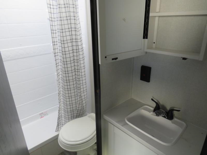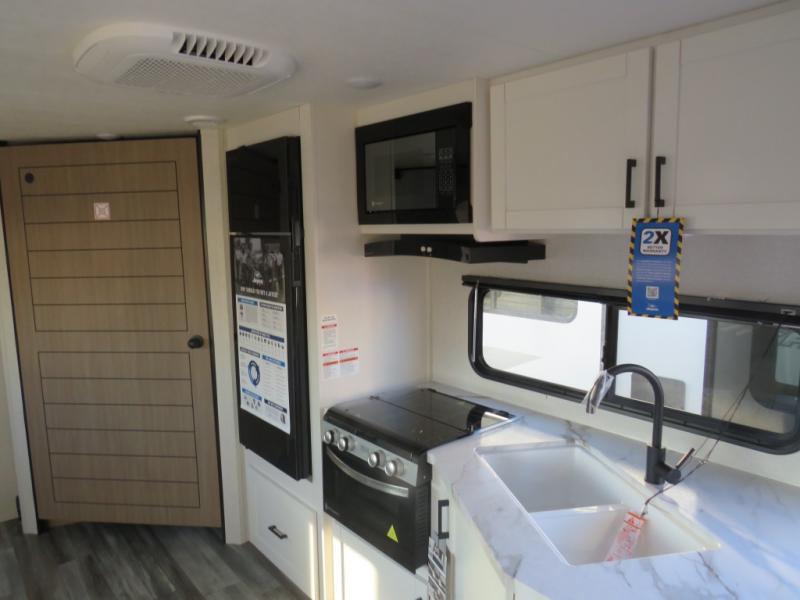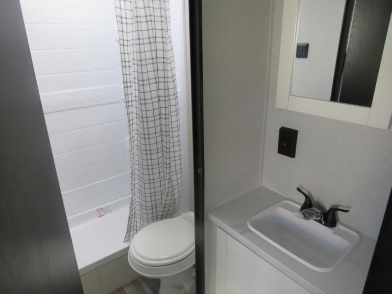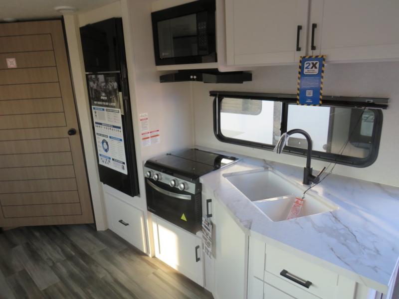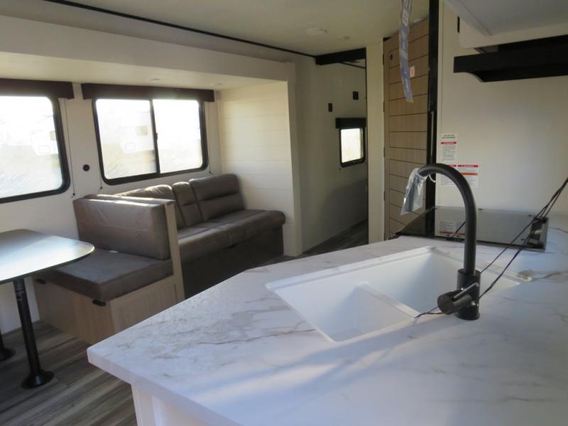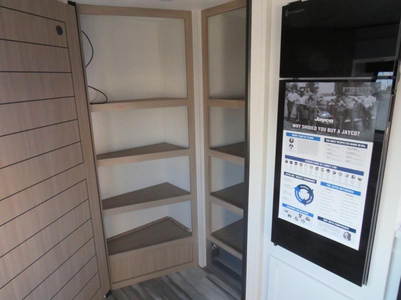 With any Eagle SLE fifth wheel by Jayco, you will enjoy a lighter tow weight, high-end finishes, and the same quality construction you've come to expect from Jayco! There is an Alpha Ply TPO roof membrane, a fully enclosed and heated underbelly, plus Stronghold VBL walls for added durability. There is also a rear 2" towing receiver outside, along with metal slam latch baggage doors, MORryde Step Above entry steps, and a Winegard Air 360 antenna with router prep if you want to stay connected as you camp. Once inside you'll enjoy the handcrafted door/drawer fronts, shower skylight, and residential vinyl flooring throughout with no carpet for an easier clean. The on-demand water heater, 30K BTU furnace, and 15K BTU "Whisper Quiet" A/C will ensure your comfort, and the Overland 1 Solar Package will provide off-grid capabilities!