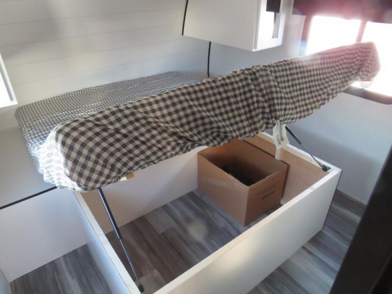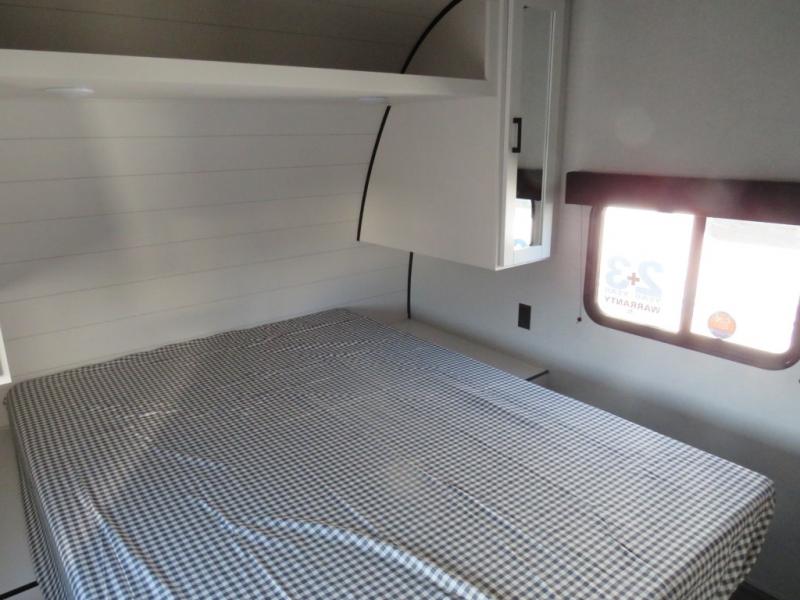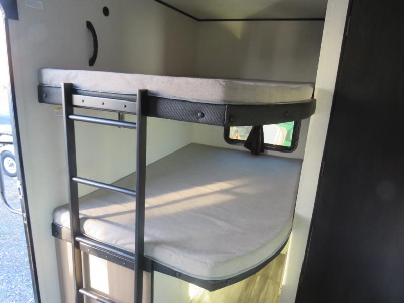 If you enjoy camping with a larger group, this fifth wheel is perfect for you! The rear bunkhouse includes double-size bunks, bunk storage and a wardrobe to keep this space tidy. You'll have the front private bedroom all to yourselves with a queen bed, and if you have any other guests, they can sleep on the tri-fold sofa and U-shaped dinette in the main living area. This space is also shared with the full kitchen, complete with a microwave and range, 12V refrigerator, and plenty of overhead cabinets for storage. After dinner, head outdoors to enjoy the 19' power awning with LED lights as you relax in your camp chairs!