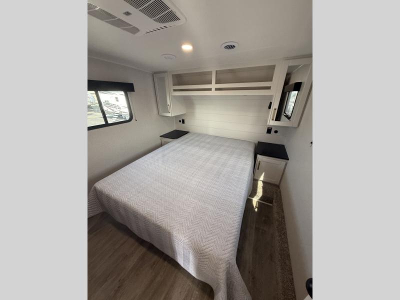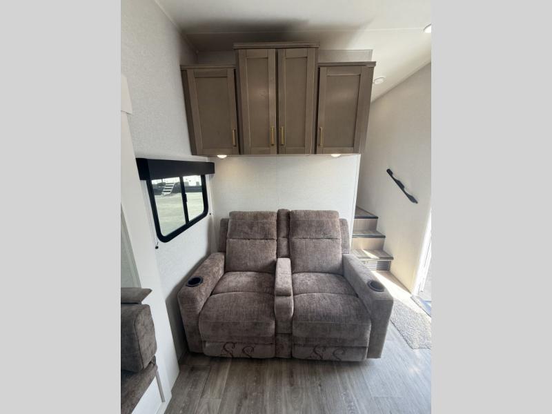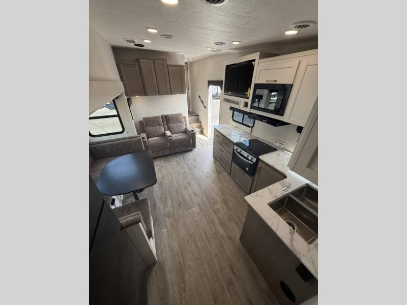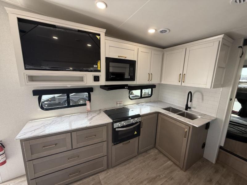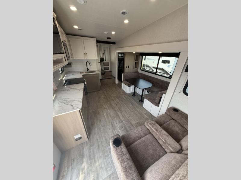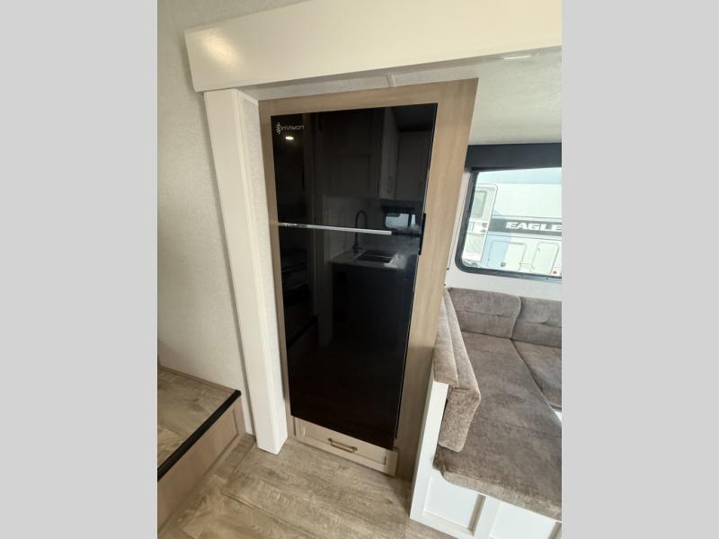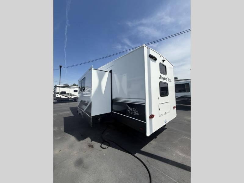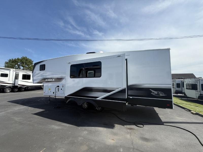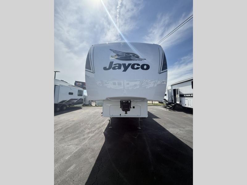 With any Eagle SLE fifth wheel by Jayco, you will enjoy a lighter tow weight, high-end finishes, and the same quality construction you've come to expect from Jayco! There is an Alpha Ply TPO roof membrane, a fully enclosed and heated underbelly, plus Stronghold VBL walls for added durability. There is also a rear 2" towing receiver outside, along with metal slam latch baggage doors, MORryde Step Above entry steps, and a Winegard Air 360 antenna with router prep if you want to stay connected as you camp. Once inside you'll enjoy the handcrafted and glazed door/drawer fronts, blackout pleated shades throughout, and residential vinyl flooring throughout with no carpet for an easier clean. The on-demand water heater, 30K BTU furnace, and 15K BTU "Whisper Quiet" A/C will ensure your comfort year around, and the optional Overland 1 Solar Package can be added if you need off-grid capabilities!