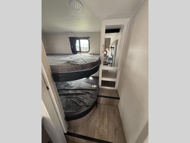 If you enjoy camping with a larger group, this fifth wheel is perfect for you! The rear bunkhouse includes double-size bunks, bunk storage and a wardrobe to keep this space tidy. You'll have the front private bedroom all to yourselves with a queen bed, and if you have any other guests, they can sleep on the tri-fold sofa and U-shaped dinette in the main living area. This space is also shared with the full kitchen, complete with a microwave and range, 12V refrigerator, and plenty of overhead cabinets for storage. After dinner, head outdoors to enjoy the 19' power awning with LED lights as you relax in your camp chairs!