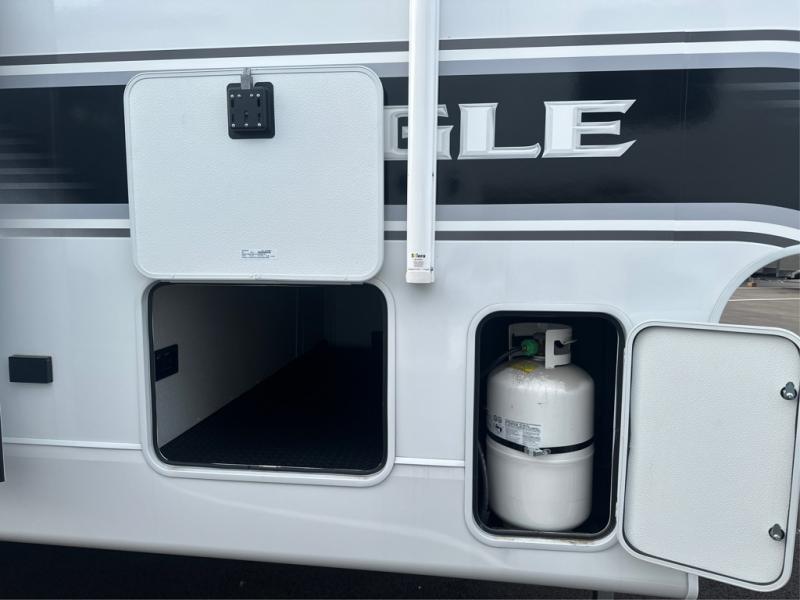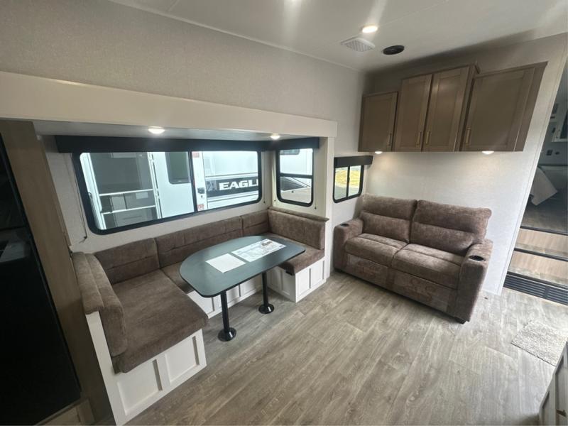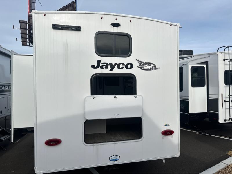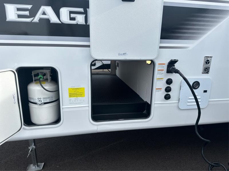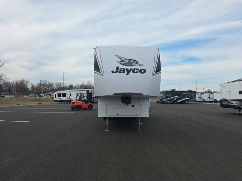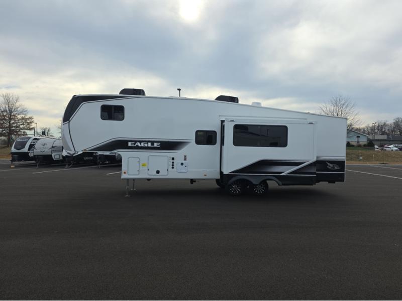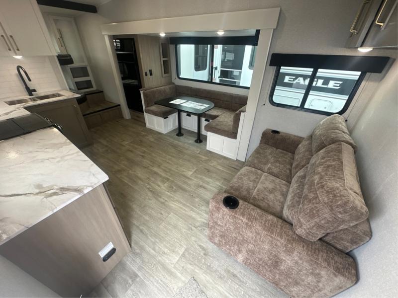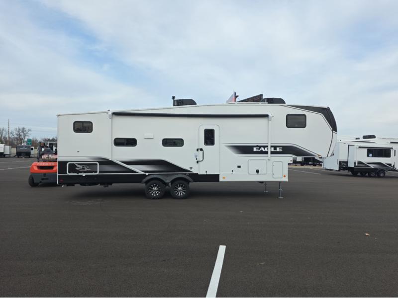 With any Eagle SLE fifth wheel by Jayco, you will enjoy a lighter tow weight, high-end finishes, and the same quality construction you've come to expect from Jayco! There is an Alpha Ply TPO roof membrane, a fully enclosed and heated underbelly, plus Stronghold VBL walls for added durability. There is also a rear 2" towing receiver outside, along with metal slam latch baggage doors, MORryde Step Above entry steps, and a Winegard Air 360 antenna with router prep if you want to stay connected as you camp. Once inside you'll enjoy the handcrafted door/drawer fronts, shower skylight, and residential vinyl flooring throughout with no carpet for an easier clean. The on-demand water heater, 30K BTU furnace, and 15K BTU "Whisper Quiet" A/C will ensure your comfort, and the Overland 1 Solar Package will provide off-grid capabilities!