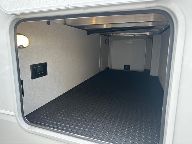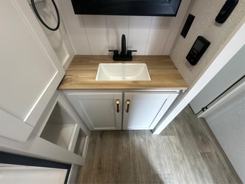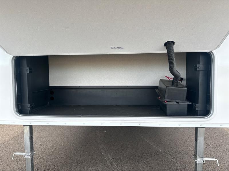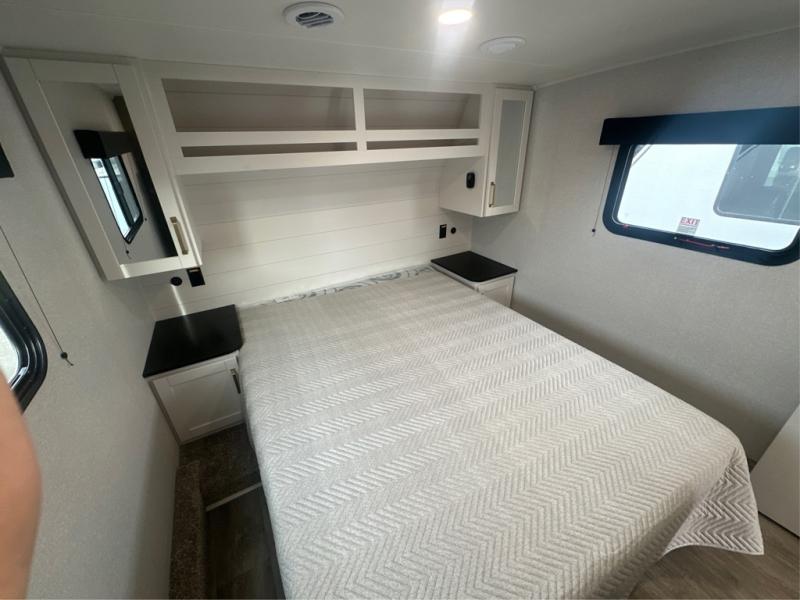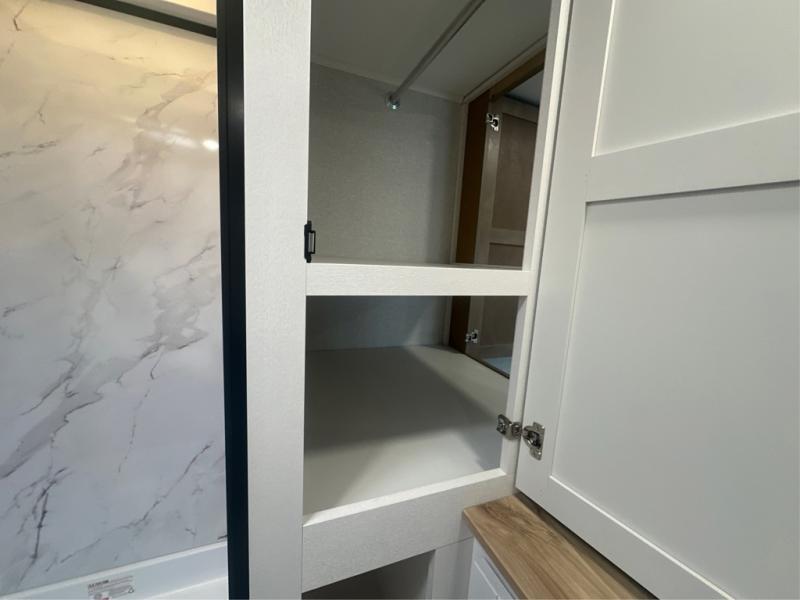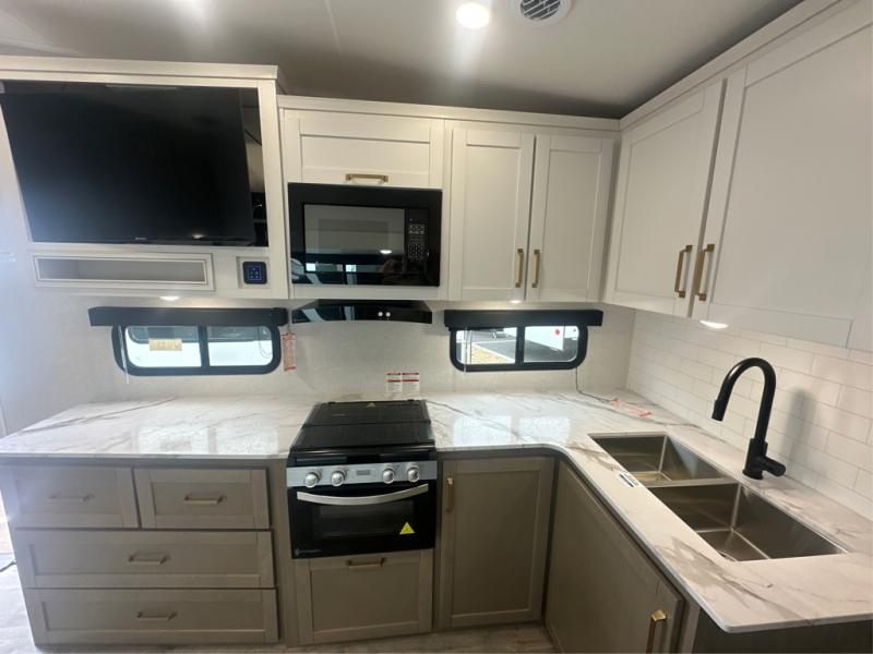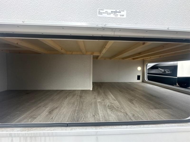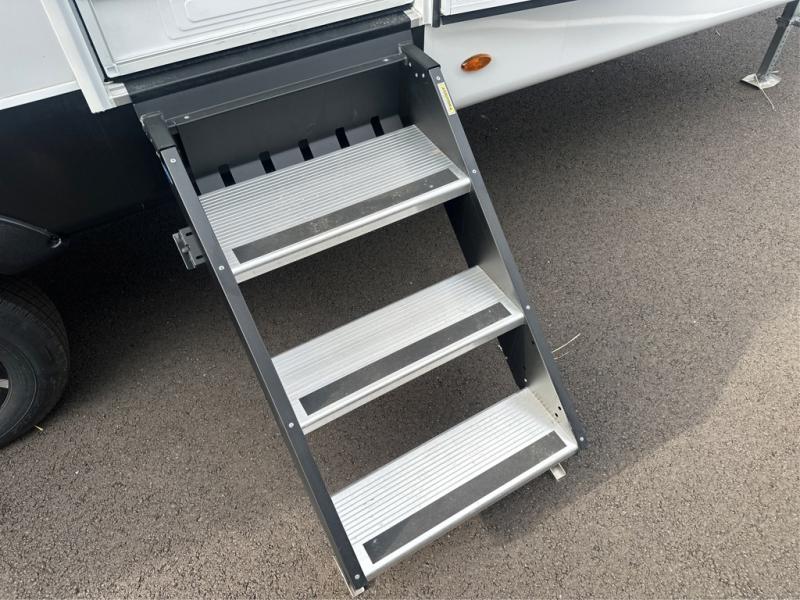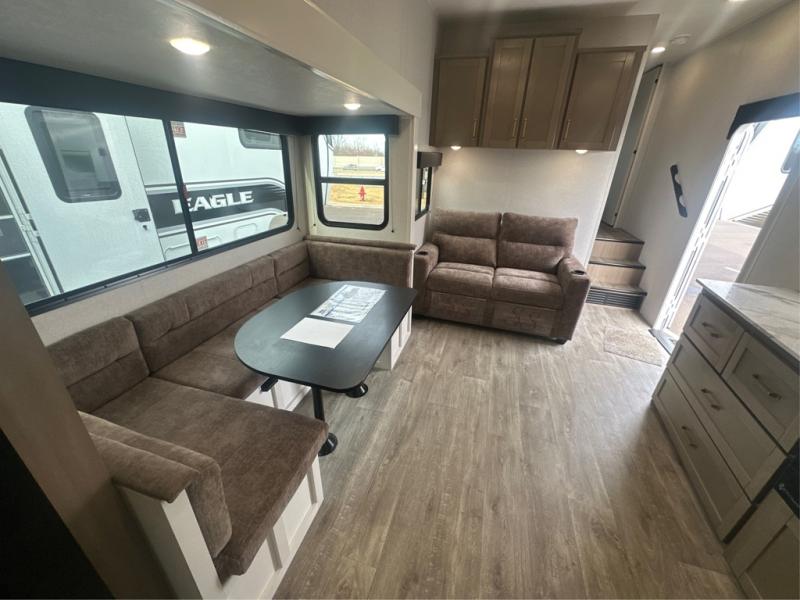 With any Eagle SLE fifth wheel by Jayco, you will enjoy a lighter tow weight, high-end finishes, and the same quality construction you've come to expect from Jayco! There is an Alpha Ply TPO roof membrane, a fully enclosed and heated underbelly, plus Stronghold VBL walls for added durability. There is also a rear 2" towing receiver outside, along with metal slam latch baggage doors, MORryde Step Above entry steps, and a Winegard Air 360 antenna with router prep if you want to stay connected as you camp. Once inside you'll enjoy the handcrafted door/drawer fronts, shower skylight, and residential vinyl flooring throughout with no carpet for an easier clean. The on-demand water heater, 30K BTU furnace, and 15K BTU "Whisper Quiet" A/C will ensure your comfort, and the Overland 1 Solar Package will provide off-grid capabilities!