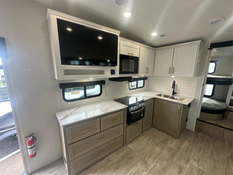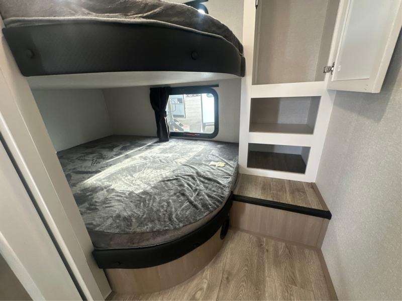 If you enjoy camping with a larger group, this fifth wheel is perfect for you! The rear bunkhouse includes double-size bunks, bunk storage and a wardrobe to keep this space tidy. You'll have the front private bedroom all to yourselves with a queen bed, and if you have any other guests, they can sleep on the tri-fold sofa and U-shaped dinette in the main living area. This space is also shared with the full kitchen, complete with a microwave and range, 12V refrigerator, and plenty of overhead cabinets for storage. After dinner, head outdoors to enjoy the 19' power awning with LED lights as you relax in your camp chairs!