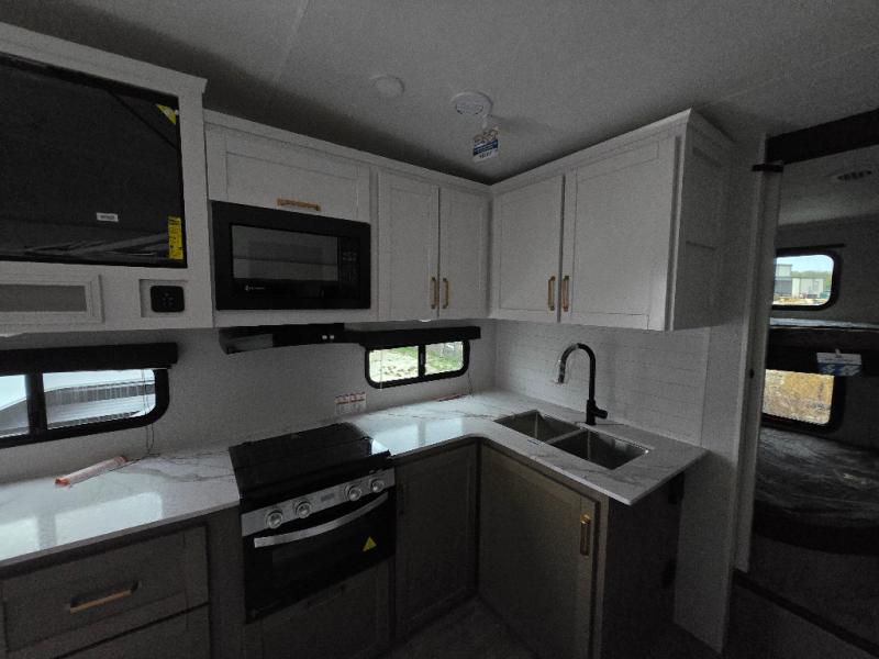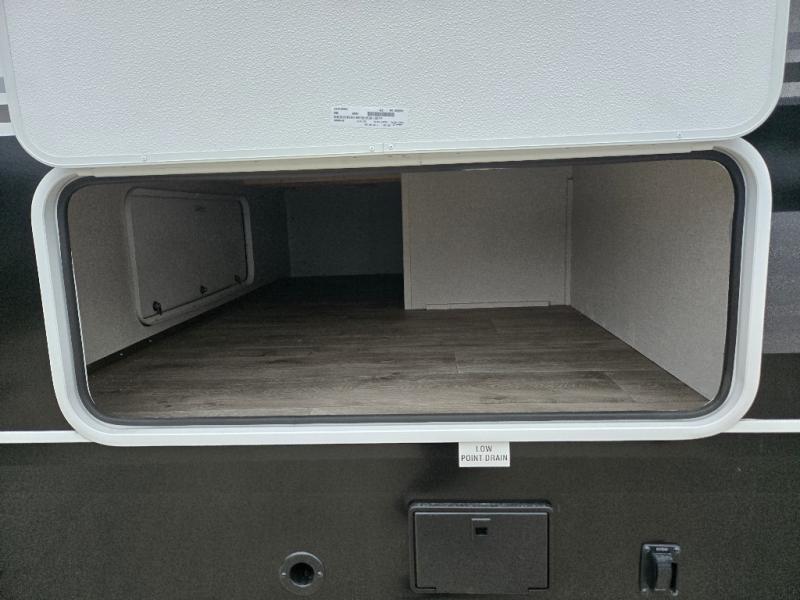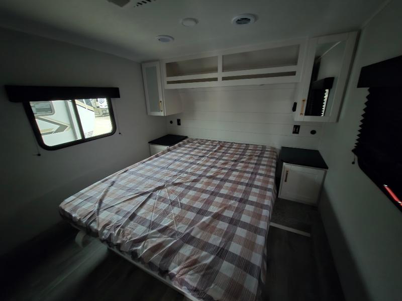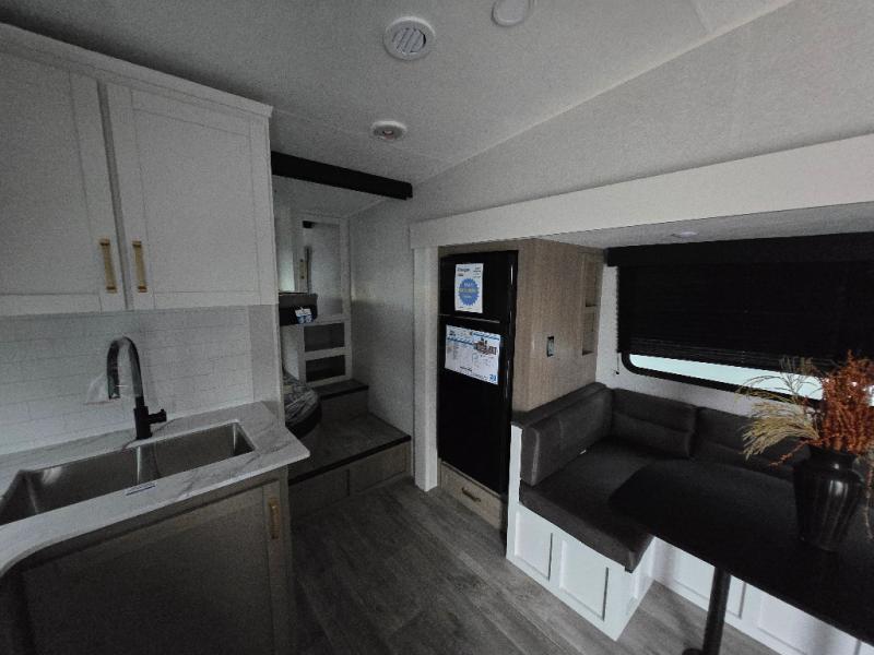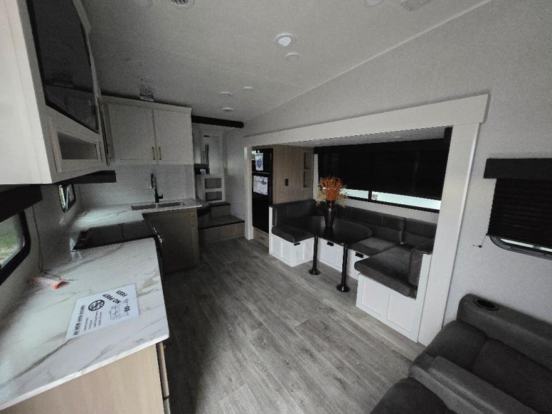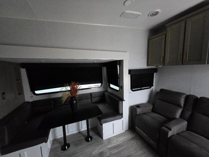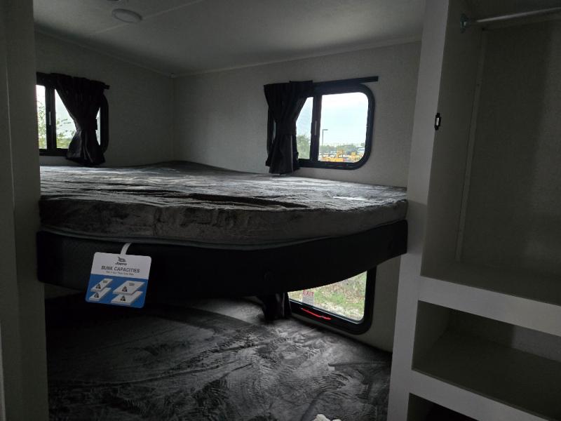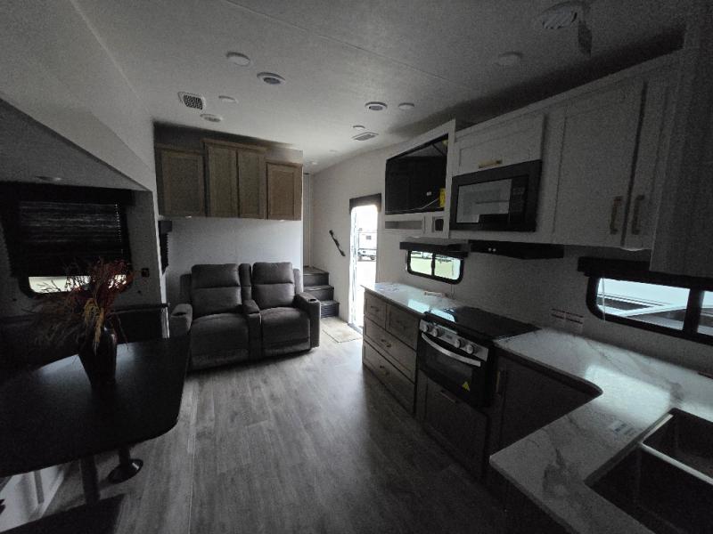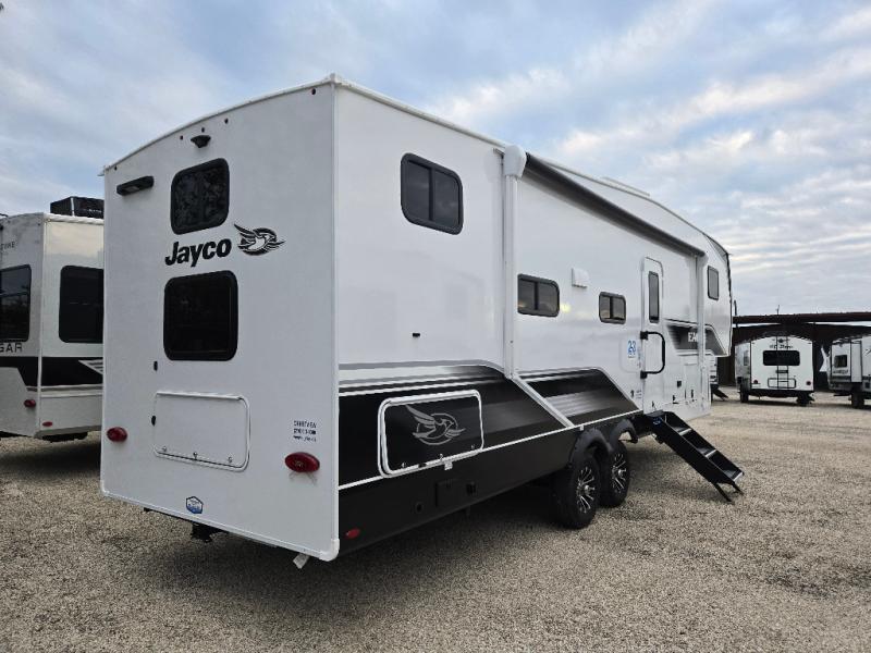 With any Eagle SLE fifth wheel by Jayco, you will enjoy a lighter tow weight, high-end finishes, and the same quality construction you've come to expect from Jayco! There is an Alpha Ply TPO roof membrane, a fully enclosed and heated underbelly, plus Stronghold VBL walls for added durability. There is also a rear 2" towing receiver outside, along with metal slam latch baggage doors, MORryde Step Above entry steps, and a Winegard Air 360 antenna with router prep if you want to stay connected as you camp. Once inside you'll enjoy the handcrafted door/drawer fronts, shower skylight, and residential vinyl flooring throughout with no carpet for an easier clean. The on-demand water heater, 30K BTU furnace, and 15K BTU "Whisper Quiet" A/C will ensure your comfort, and the Overland 1 Solar Package will provide off-grid capabilities!