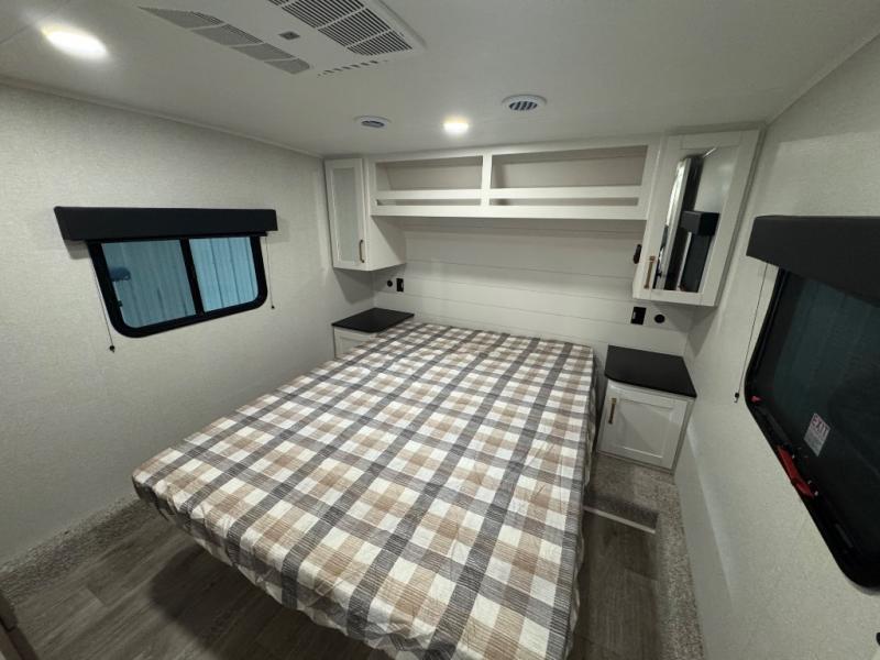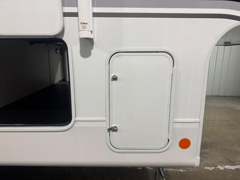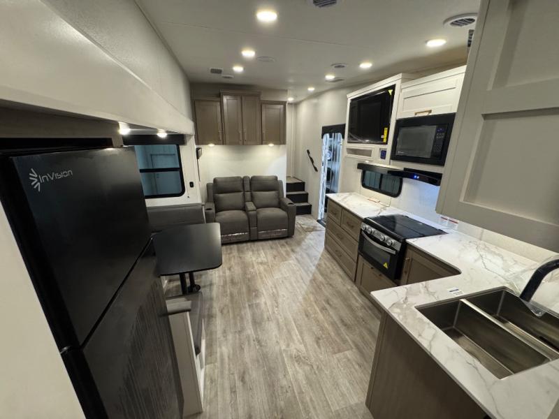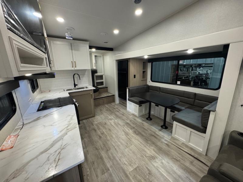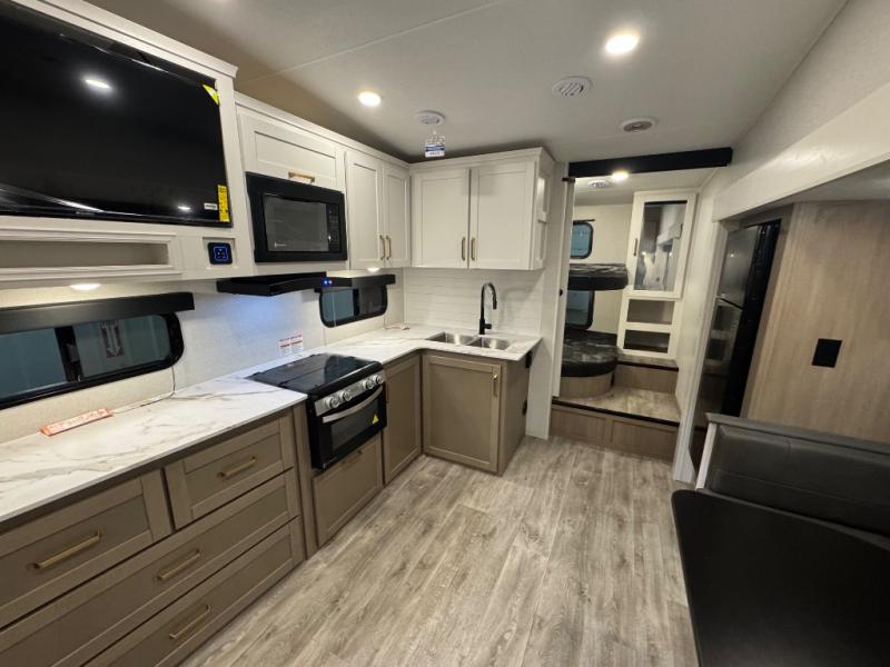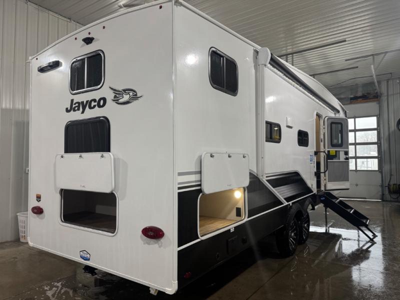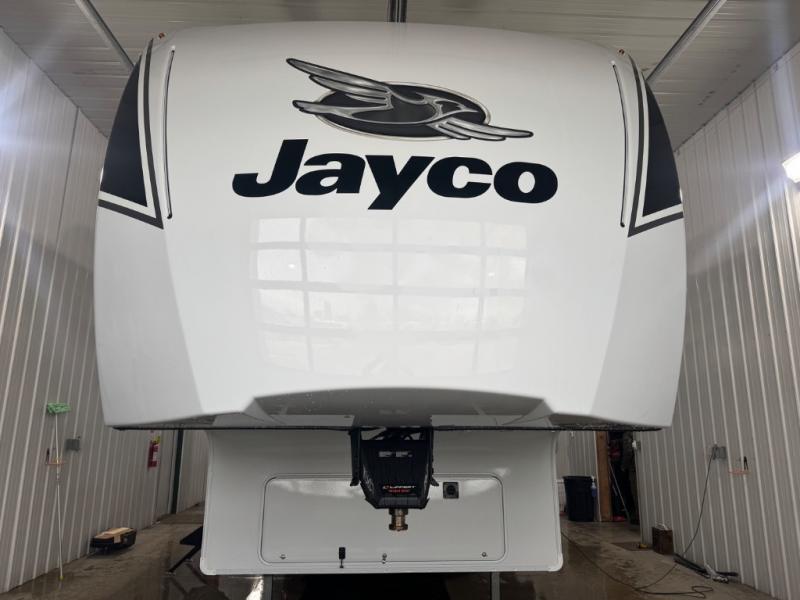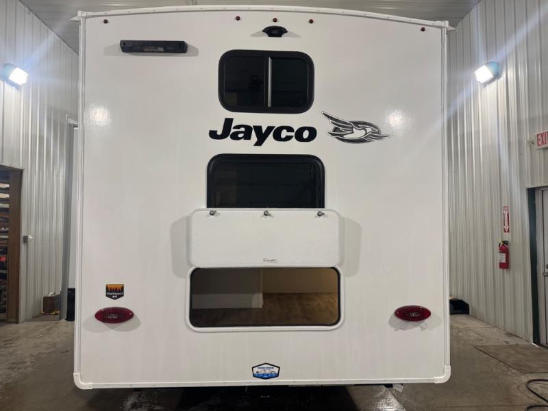 With any Eagle SLE fifth wheel by Jayco, you will enjoy a lighter tow weight, high-end finishes, and the same quality construction you've come to expect from Jayco! There is an Alpha Ply TPO roof membrane, a fully enclosed and heated underbelly, plus Stronghold VBL walls for added durability. There is also a rear 2" towing receiver outside, along with metal slam latch baggage doors, MORryde Step Above entry steps, and a Winegard Air 360 antenna with router prep if you want to stay connected as you camp. Once inside you'll enjoy the handcrafted door/drawer fronts, shower skylight, and residential vinyl flooring throughout with no carpet for an easier clean. The on-demand water heater, 30K BTU furnace, and 15K BTU "Whisper Quiet" A/C will ensure your comfort, and the Overland 1 Solar Package will provide off-grid capabilities!
