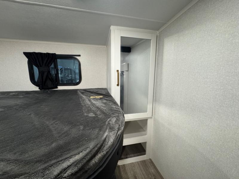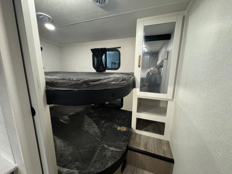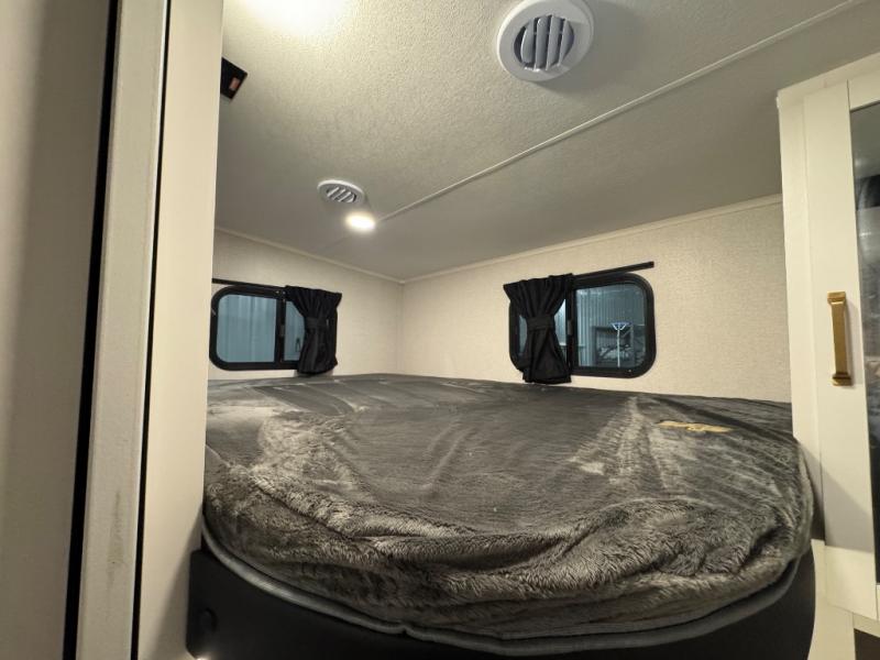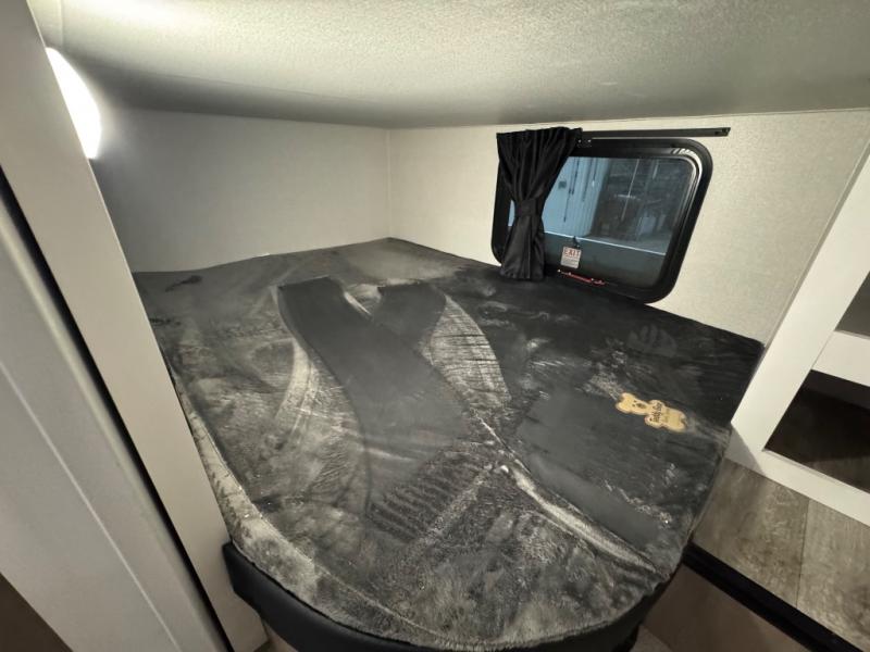 If you enjoy camping with a larger group, this fifth wheel is perfect for you! The rear bunkhouse includes double-size bunks, bunk storage and a wardrobe to keep this space tidy. You'll have the front private bedroom all to yourselves with a queen bed, and if you have any other guests, they can sleep on the tri-fold sofa and U-shaped dinette in the main living area. This space is also shared with the full kitchen, complete with a microwave and range, 12V refrigerator, and plenty of overhead cabinets for storage. After dinner, head outdoors to enjoy the 19' power awning with LED lights as you relax in your camp chairs!