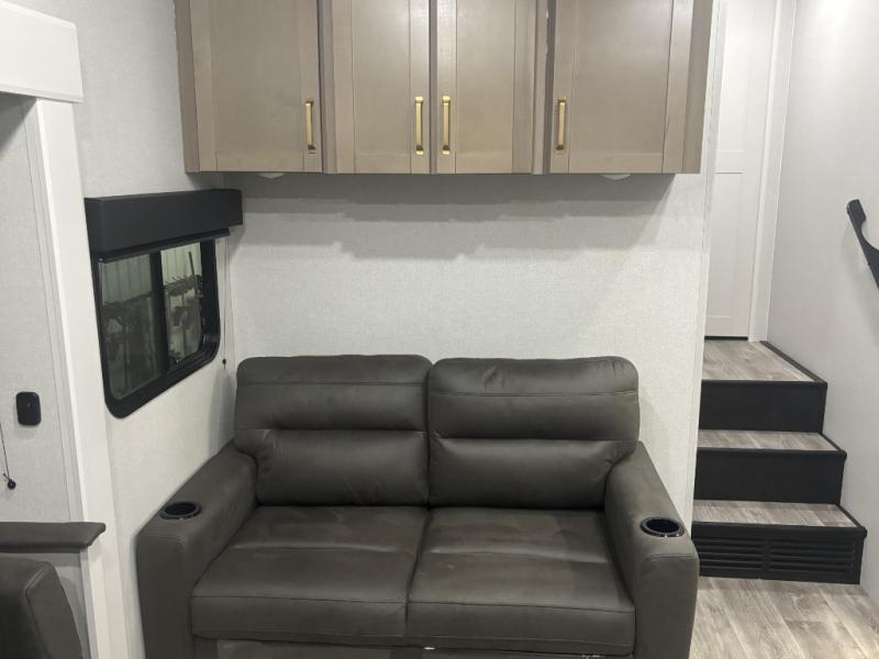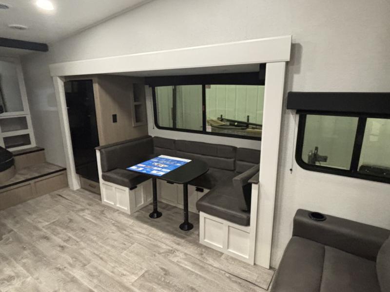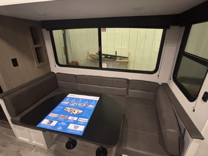 With any Eagle SLE fifth wheel by Jayco, you will enjoy a lighter tow weight, high-end finishes, and the same quality construction you've come to expect from Jayco! There is an Alpha Ply TPO roof membrane, a fully enclosed and heated underbelly, plus Stronghold VBL walls for added durability. There is also a rear 2" towing receiver outside, along with metal slam latch baggage doors, MORryde Step Above entry steps, and a Winegard Air 360 antenna with router prep if you want to stay connected as you camp. Once inside you'll enjoy the handcrafted door/drawer fronts, shower skylight, and residential vinyl flooring throughout with no carpet for an easier clean. The on-demand water heater, 30K BTU furnace, and 15K BTU "Whisper Quiet" A/C will ensure your comfort, and the Overland 1 Solar Package will provide off-grid capabilities!