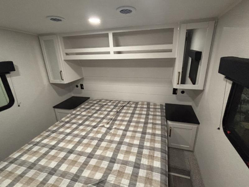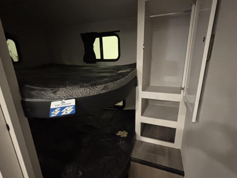 If you enjoy camping with a larger group, this fifth wheel is perfect for you! The rear bunkhouse includes double-size bunks, bunk storage and a wardrobe to keep this space tidy. You'll have the front private bedroom all to yourselves with a queen bed, and if you have any other guests, they can sleep on the tri-fold sofa and U-shaped dinette in the main living area. This space is also shared with the full kitchen, complete with a microwave and range, 12V refrigerator, and plenty of overhead cabinets for storage. After dinner, head outdoors to enjoy the 19' power awning with LED lights as you relax in your camp chairs!