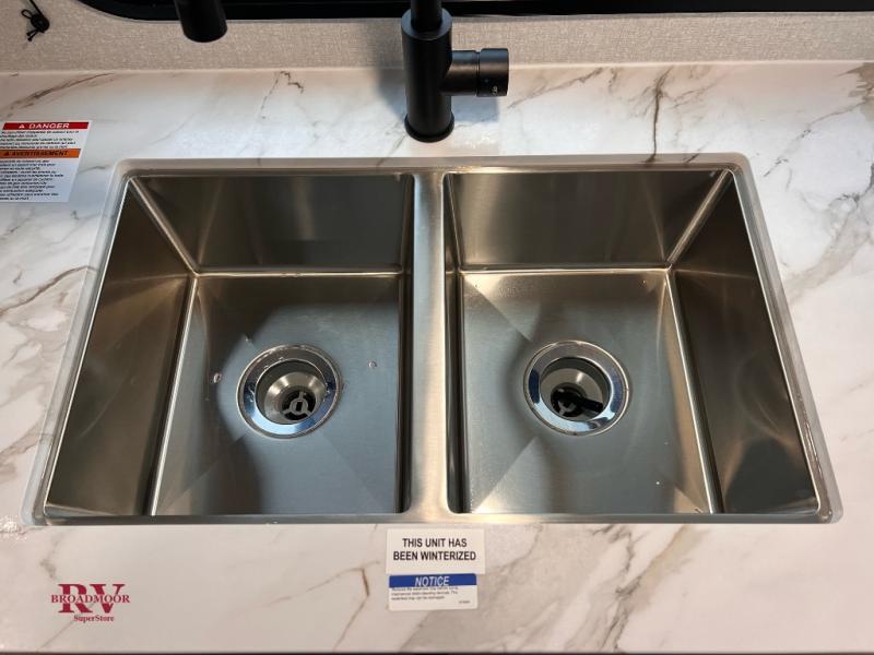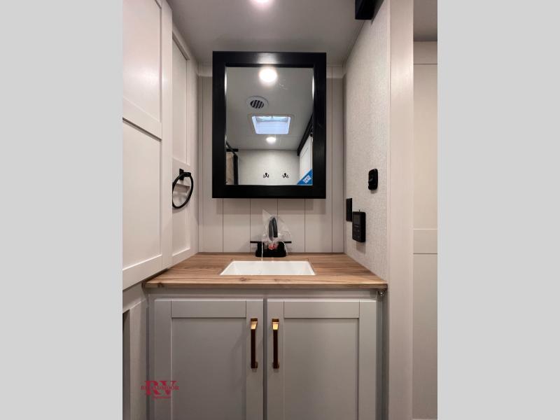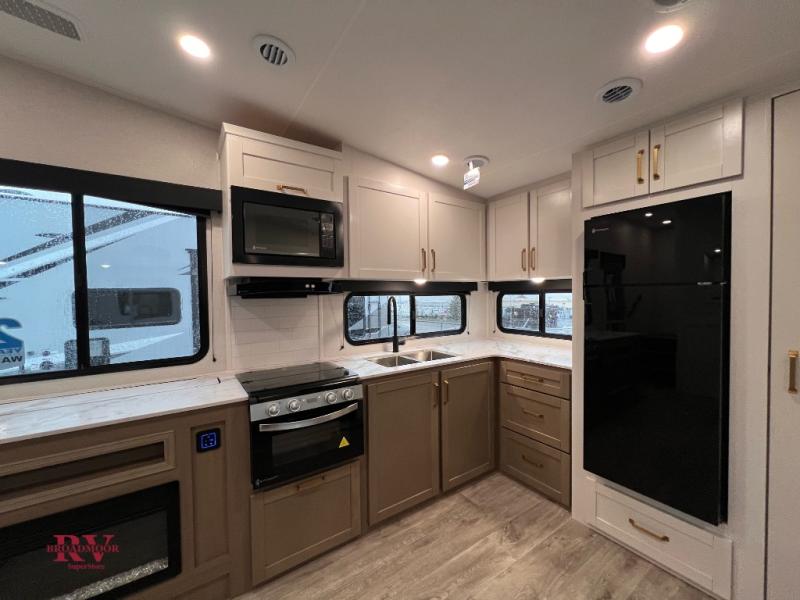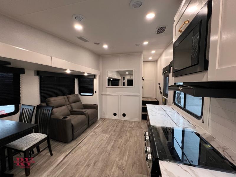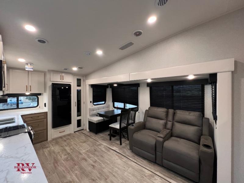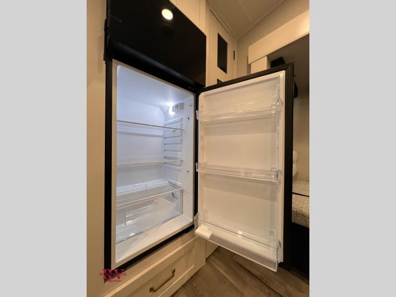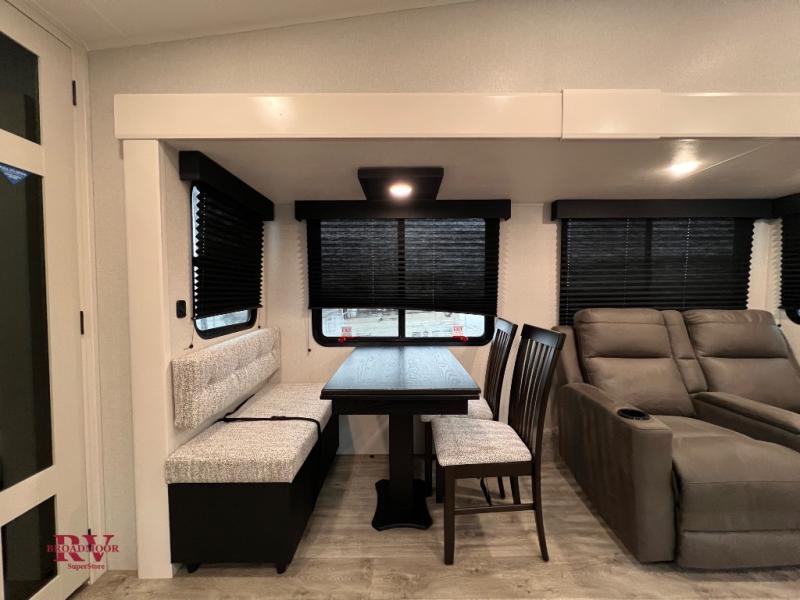 Camping just got a whole lot sweeter in this fifth wheel with double slides, a rear kitchen, and sleeping space for five to six. You'll love waking up each morning in the front private bedroom that includes a queen bed, overhead cabinets, plus a wardrobe and dresser slide. Your guests who slept on the tri-fold sofa and booth dinette can convert these back to seating space in the morning, and breakfast can be made in the rear kitchen. Here, you'll find ample counter space, a microwave and range, plus a pantry and 12V refrigerator for food storage. Outside, gear can be stored in the pass-thru storage area, and you're sure to enjoy the 17' power awning with LED Lights!