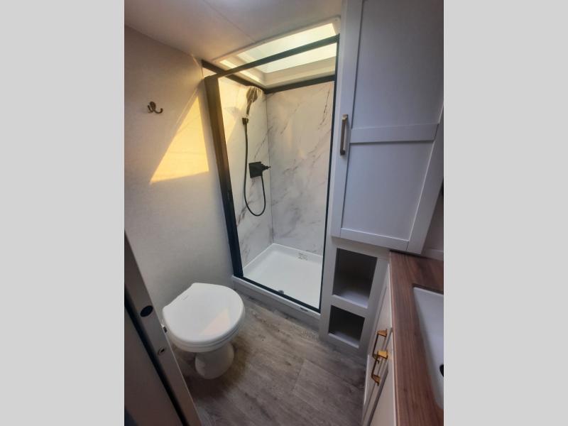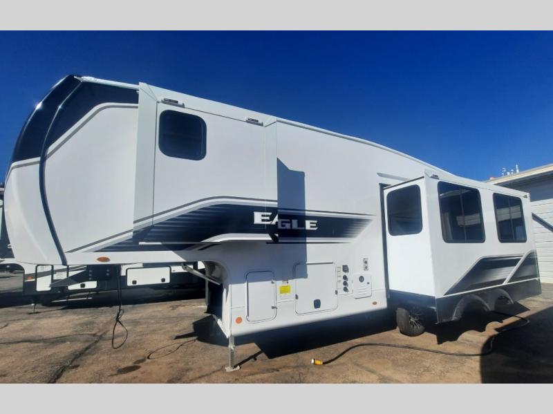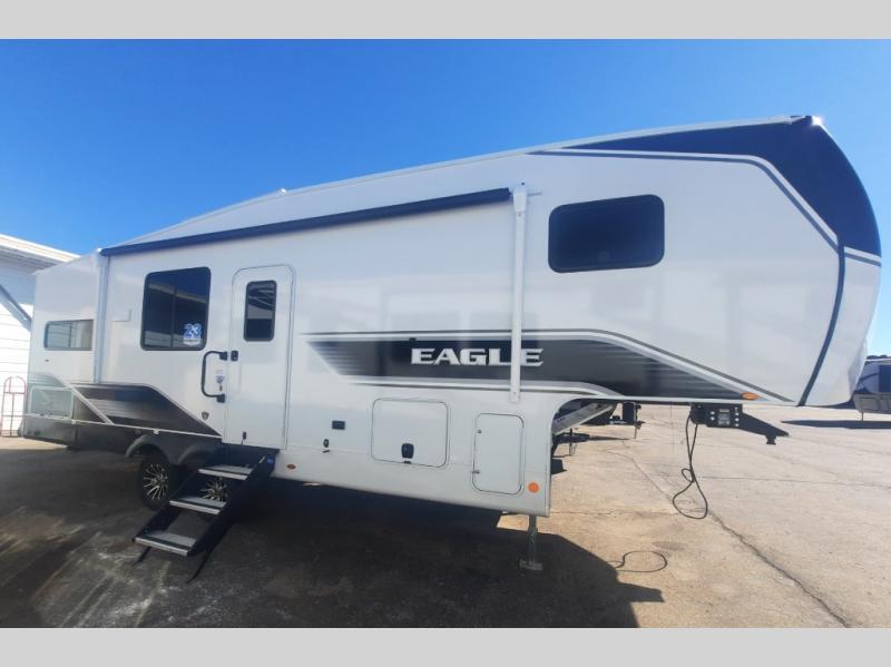 With any Eagle SLE fifth wheel by Jayco, you will enjoy a lighter tow weight, high-end finishes, and the same quality construction you've come to expect from Jayco! There is an Alpha Ply TPO roof membrane, a fully enclosed and heated underbelly, plus Stronghold VBL walls for added durability. There is also a rear 2" towing receiver outside, along with metal slam latch baggage doors, MORryde Step Above entry steps, and a Winegard Air 360 antenna with router prep if you want to stay connected as you camp. Once inside you'll enjoy the handcrafted door/drawer fronts, shower skylight, and residential vinyl flooring throughout with no carpet for an easier clean. The on-demand water heater, 30K BTU furnace, and 15K BTU "Whisper Quiet" A/C will ensure your comfort, and the Overland 1 Solar Package will provide off-grid capabilities!