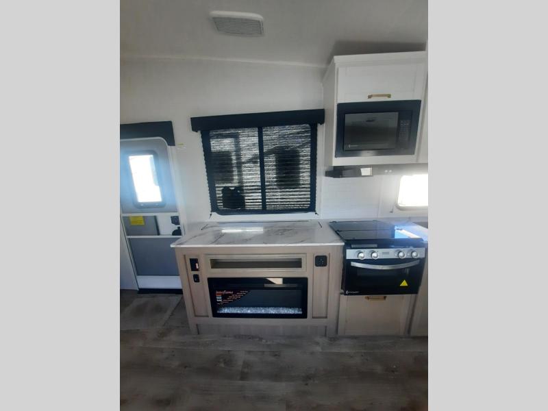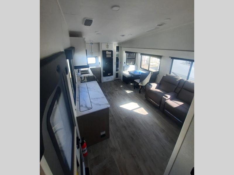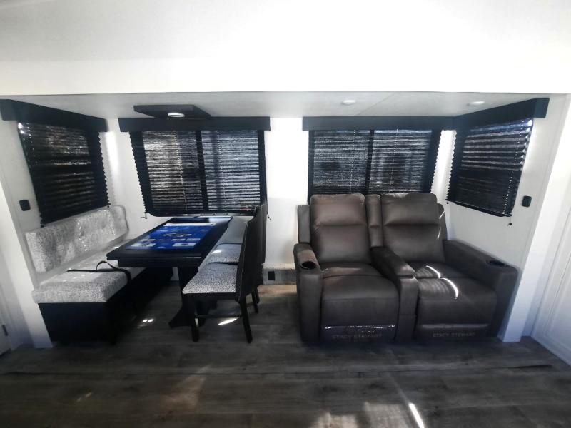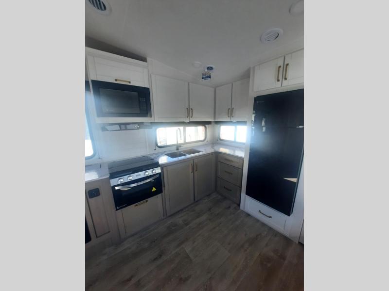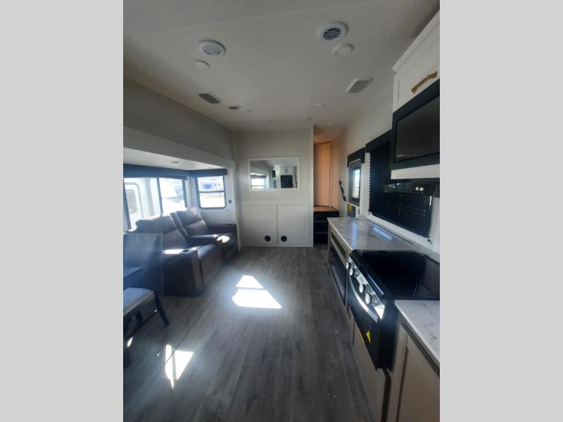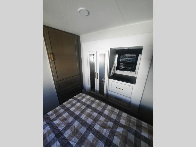 Camping just got a whole lot sweeter in this fifth wheel with double slides, a rear kitchen, and sleeping space for five to six. You'll love waking up each morning in the front private bedroom that includes a queen bed, overhead cabinets, plus a wardrobe and dresser slide. Your guests who slept on the tri-fold sofa and booth dinette can convert these back to seating space in the morning, and breakfast can be made in the rear kitchen. Here, you'll find ample counter space, a microwave and range, plus a pantry and 12V refrigerator for food storage. Outside, gear can be stored in the pass-thru storage area, and you're sure to enjoy the 17' power awning with LED Lights!
