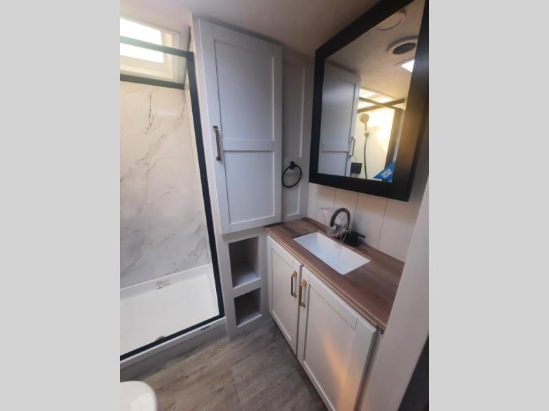 This 5th wheel has a spacious master suite with a queen bed—there is plenty of room to walk around both sides of the bed! There is also a spacious rear kitchen with plenty of storage that will make the most discerning chef happy!