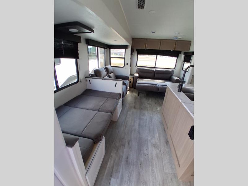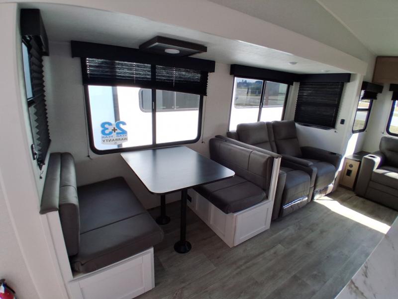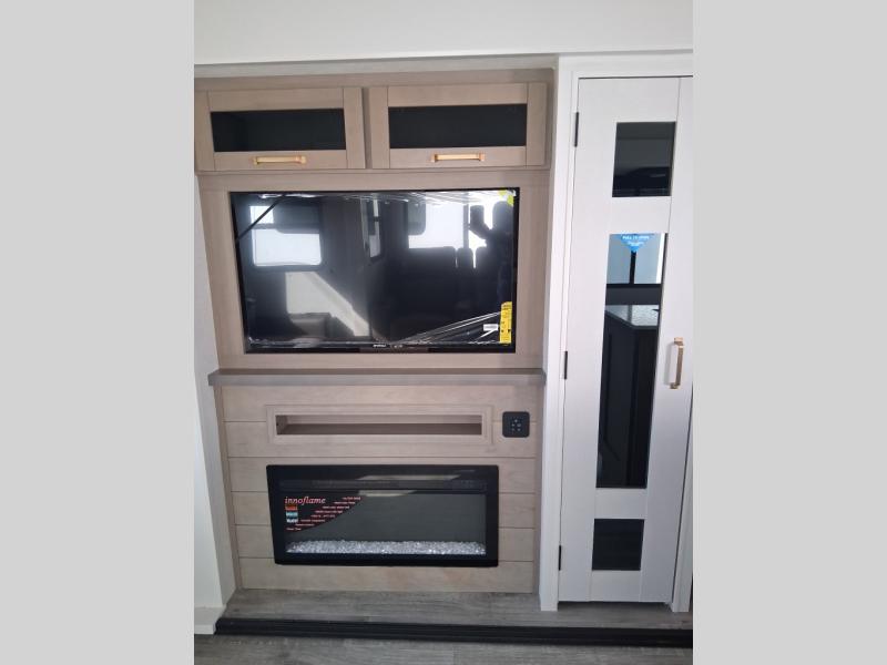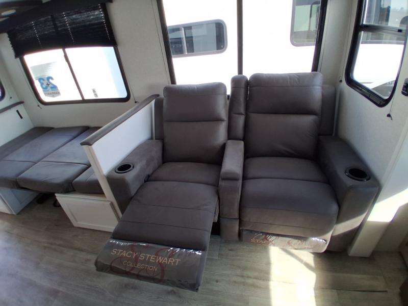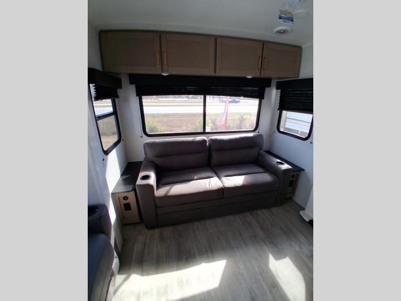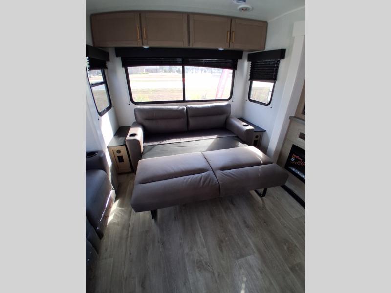 You can't go wrong when camping in this spacious fifth wheel! There are dual opposing slides in the living room, giving your crew plenty of space to prep dinner on the kitchen island, relax on the theater sofa, or dine at the booth dinette. There is also a rear tri-fold sofa where your guests can sleep! An entertainment center with a fireplace will make this space feel even more like home, and there are plenty of storage spaces for all your belongings. The full bath towards the front will let you freshen up each day, and the front private bedroom with a queen bed is sure to bring comfort. There are also dual nightstands, overhead cabinets, plus a wardrobe and dresser slide out, so everything has a place!