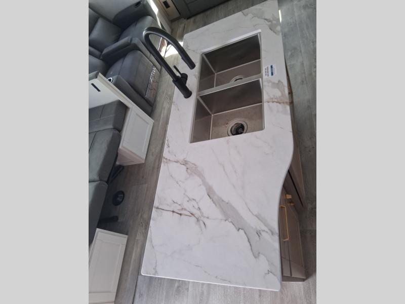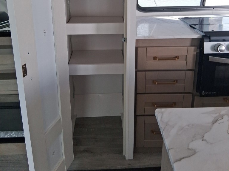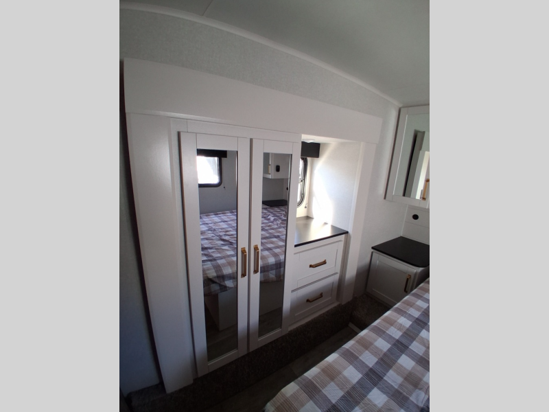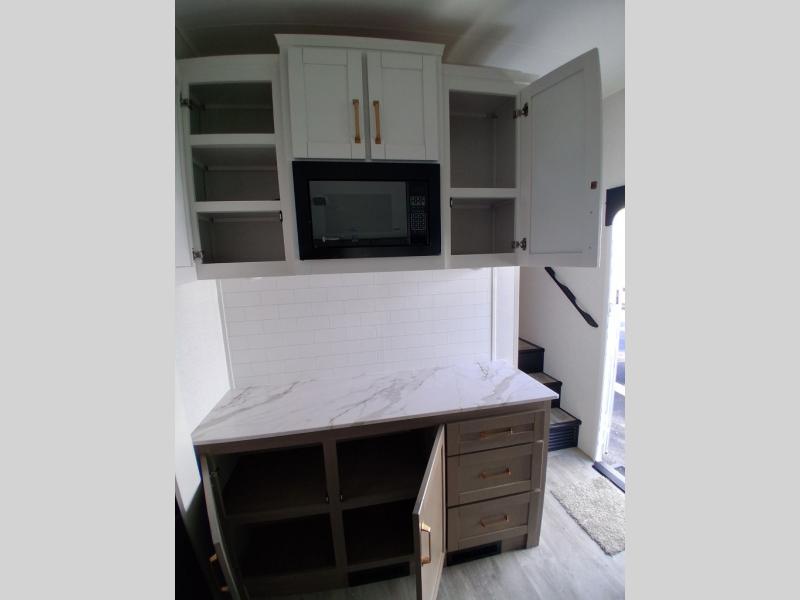 With any Eagle SLE fifth wheel by Jayco, you will enjoy a lighter tow weight, high-end finishes, and the same quality construction you've come to expect from Jayco! There is an Alpha Ply TPO roof membrane, a fully enclosed and heated underbelly, plus Stronghold VBL walls for added durability. There is also a rear 2" towing receiver outside, along with metal slam latch baggage doors, MORryde Step Above entry steps, and a Winegard Air 360 antenna with router prep if you want to stay connected as you camp. Once inside you'll enjoy the handcrafted door/drawer fronts, shower skylight, and residential vinyl flooring throughout with no carpet for an easier clean. The on-demand water heater, 30K BTU furnace, and 15K BTU "Whisper Quiet" A/C will ensure your comfort, and the Overland 1 Solar Package will provide off-grid capabilities!