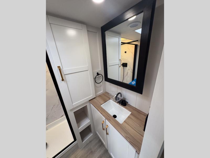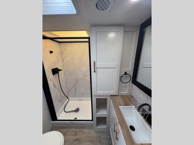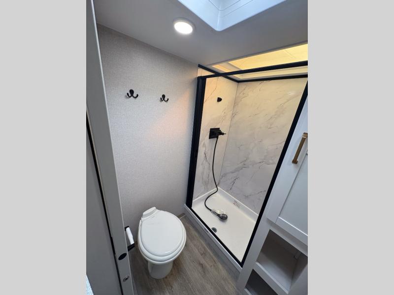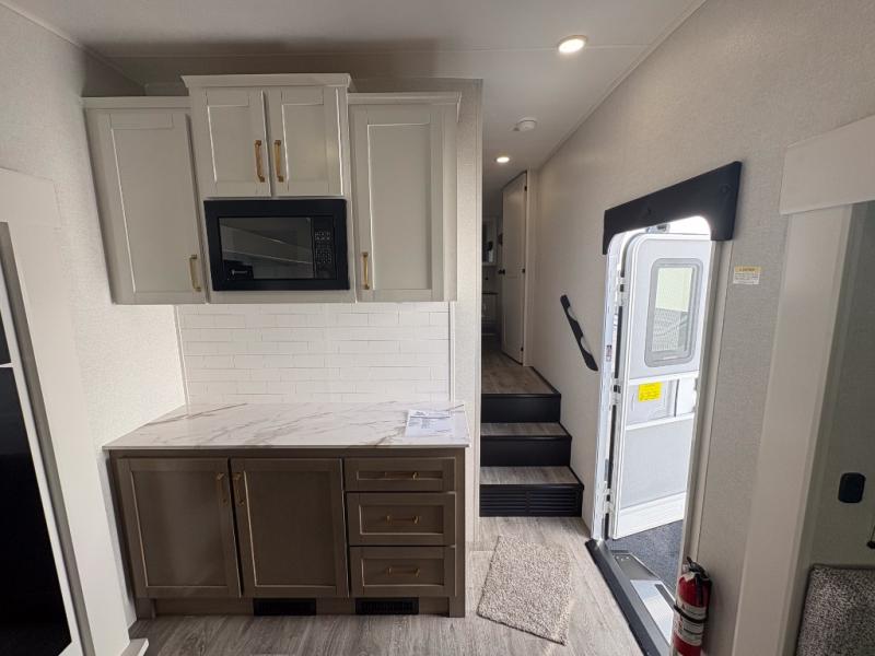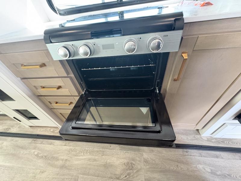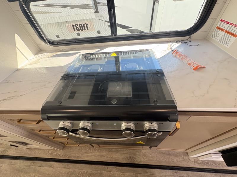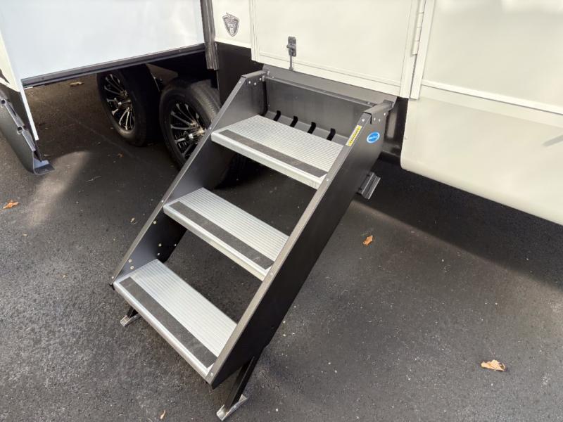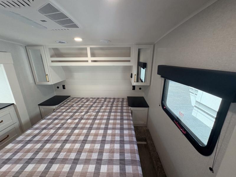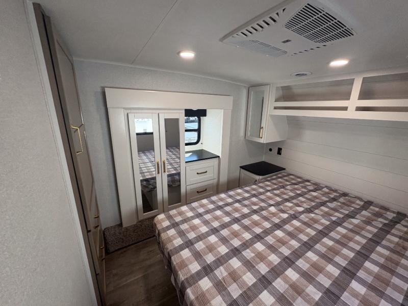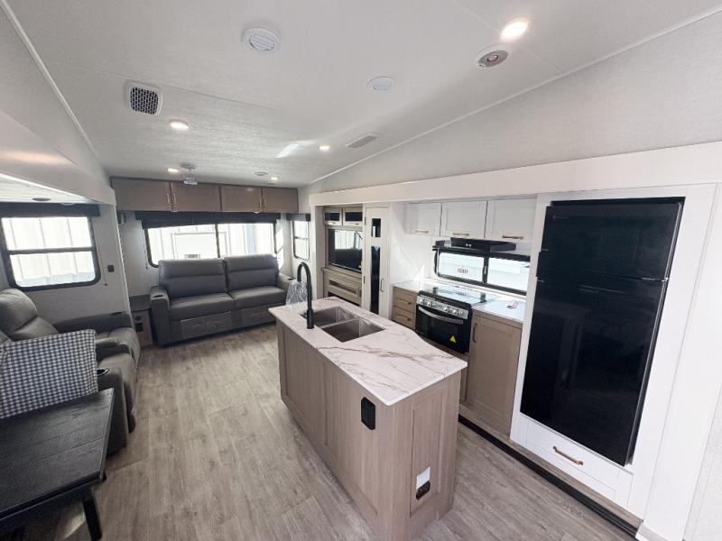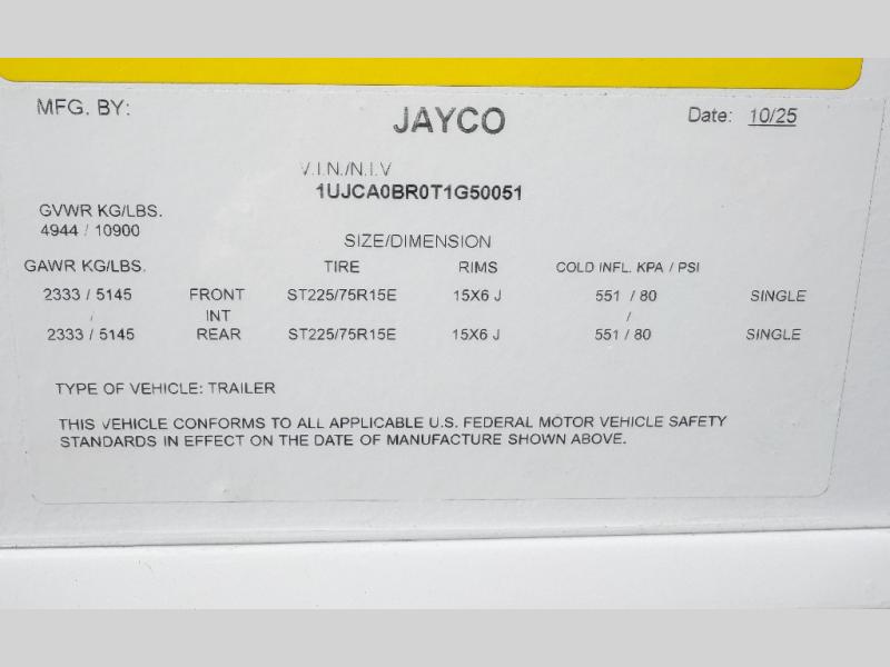 With any Eagle SLE fifth wheel by Jayco, you will enjoy a lighter tow weight, high-end finishes, and the same quality construction you've come to expect from Jayco! There is an Alpha Ply TPO roof membrane, a fully enclosed and heated underbelly, plus Stronghold VBL walls for added durability. There is also a rear 2" towing receiver outside, along with metal slam latch baggage doors, MORryde Step Above entry steps, and a Winegard Air 360 antenna with router prep if you want to stay connected as you camp. Once inside you'll enjoy the handcrafted door/drawer fronts, shower skylight, and residential vinyl flooring throughout with no carpet for an easier clean. The on-demand water heater, 30K BTU furnace, and 15K BTU "Whisper Quiet" A/C will ensure your comfort, and the Overland 1 Solar Package will provide off-grid capabilities!
