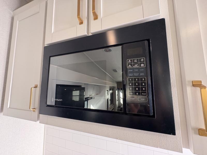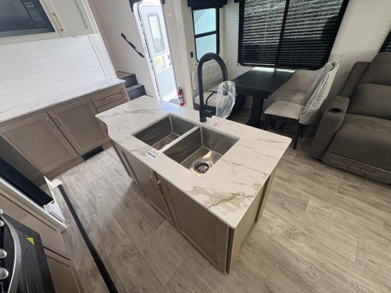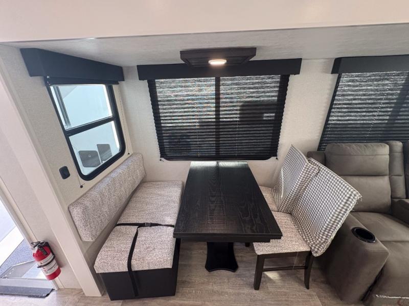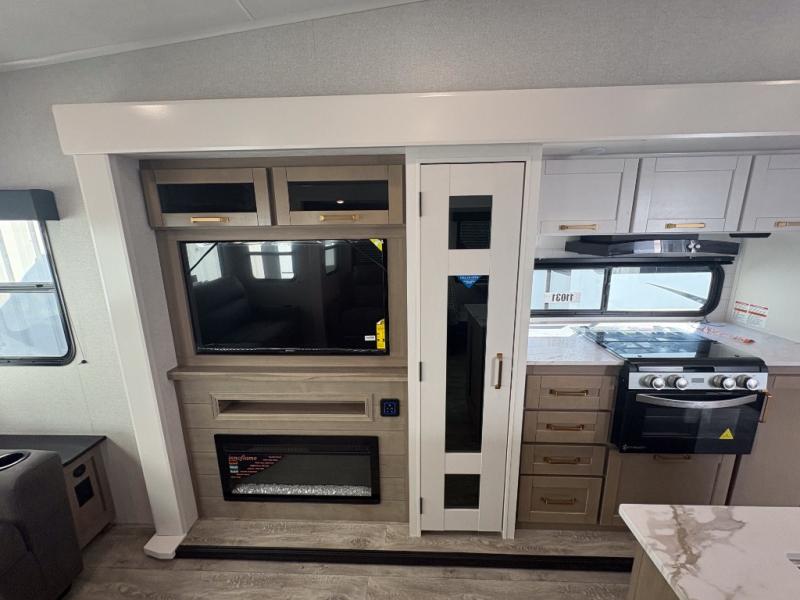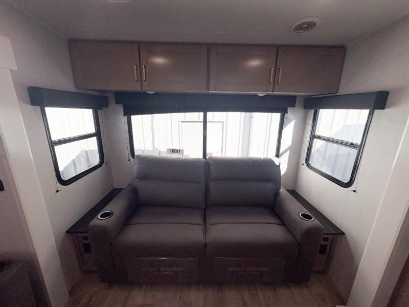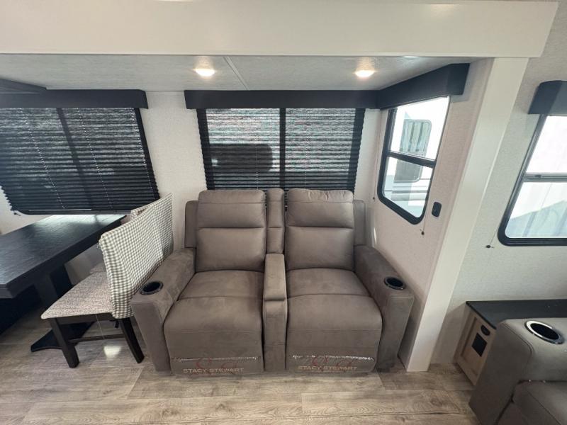 You can't go wrong when camping in this spacious fifth wheel! There are dual opposing slides in the living room, giving your crew plenty of space to prep dinner on the kitchen island, relax on the theater sofa, or dine at the booth dinette. There is also a rear tri-fold sofa where your guests can sleep! An entertainment center with a fireplace will make this space feel even more like home, and there are plenty of storage spaces for all your belongings. The full bath towards the front will let you freshen up each day, and the front private bedroom with a queen bed is sure to bring comfort. There are also dual nightstands, overhead cabinets, plus a wardrobe and dresser slide out, so everything has a place!