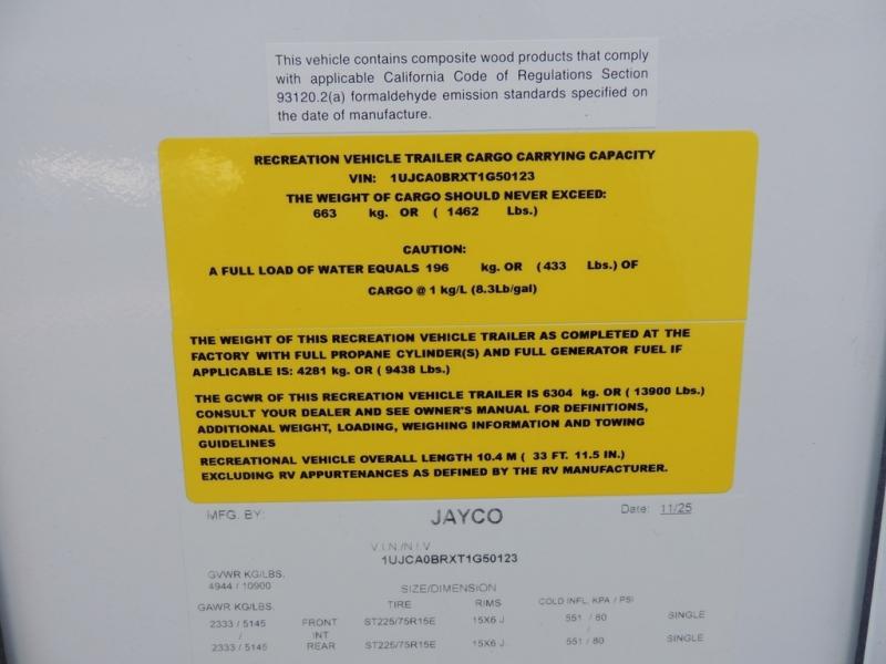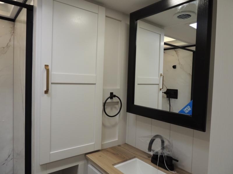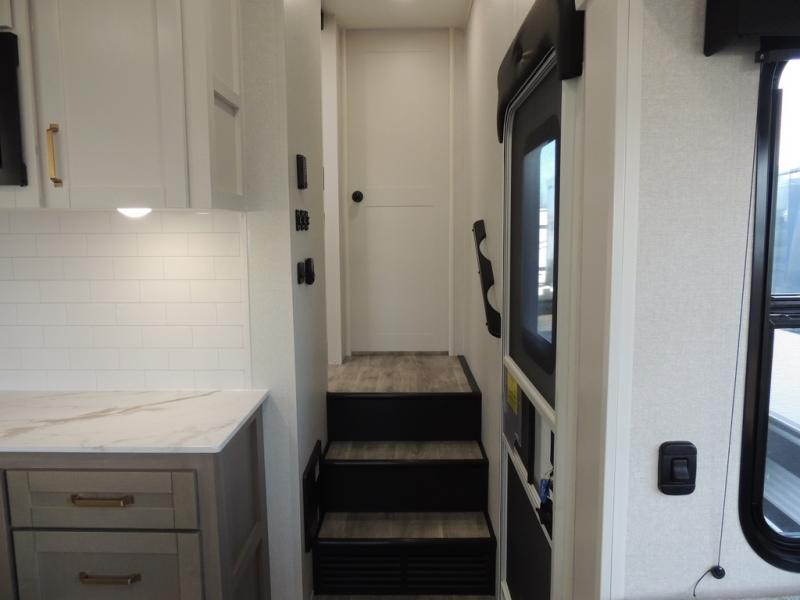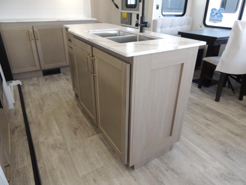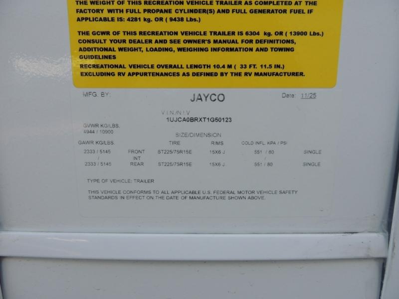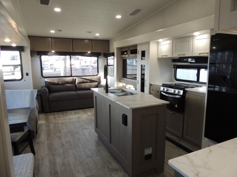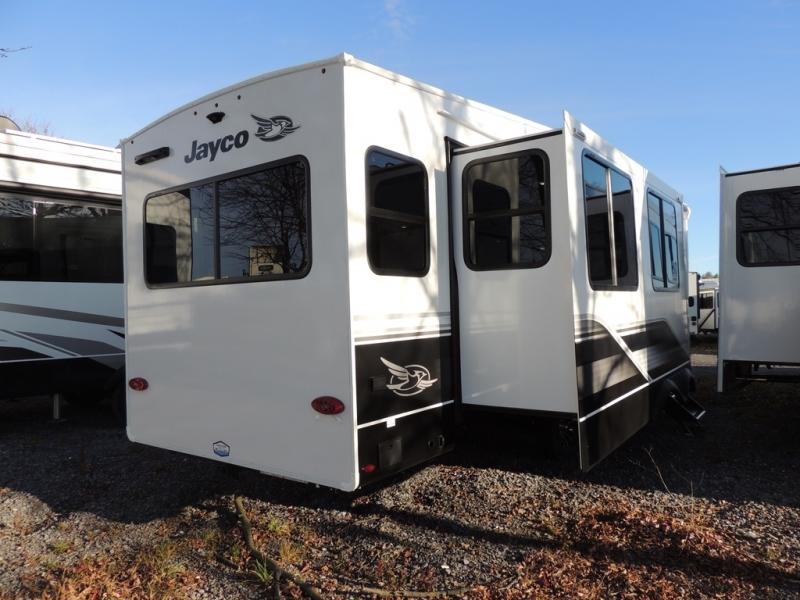 With any Eagle SLE fifth wheel by Jayco, you will enjoy a lighter tow weight, high-end finishes, and the same quality construction you've come to expect from Jayco! There is an Alpha Ply TPO roof membrane, a fully enclosed and heated underbelly, plus Stronghold VBL walls for added durability. There is also a rear 2" towing receiver outside, along with metal slam latch baggage doors, MORryde Step Above entry steps, and a Winegard Air 360 antenna with router prep if you want to stay connected as you camp. Once inside you'll enjoy the handcrafted door/drawer fronts, shower skylight, and residential vinyl flooring throughout with no carpet for an easier clean. The on-demand water heater, 30K BTU furnace, and 15K BTU "Whisper Quiet" A/C will ensure your comfort, and the Overland 1 Solar Package will provide off-grid capabilities!