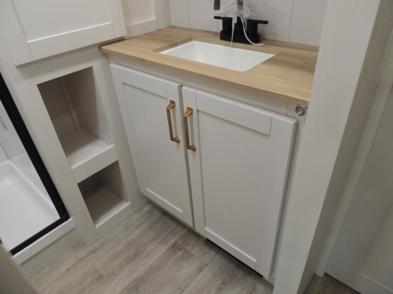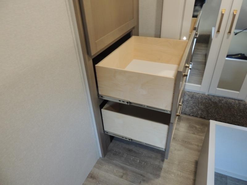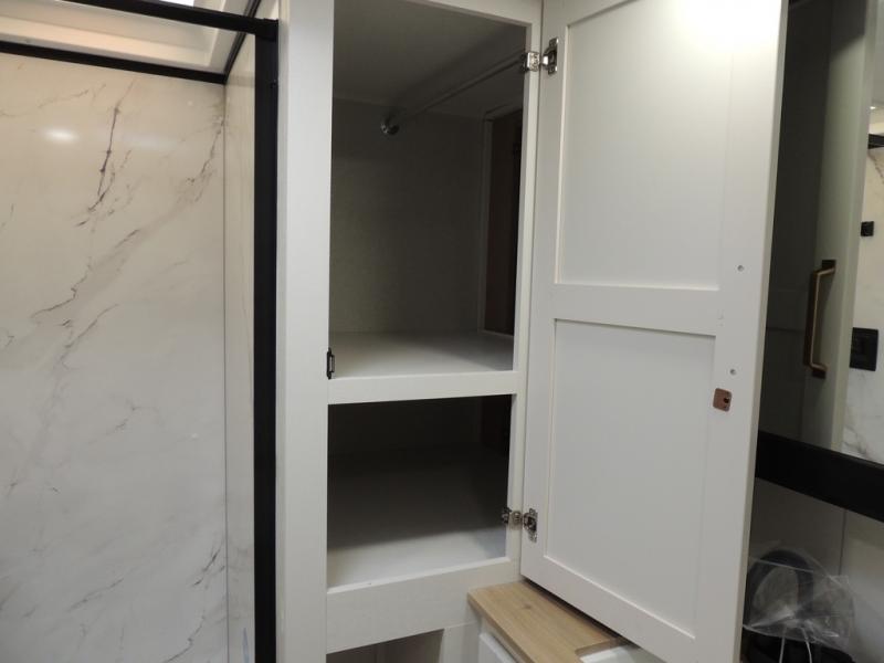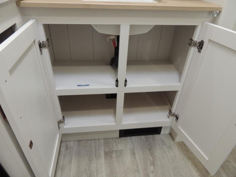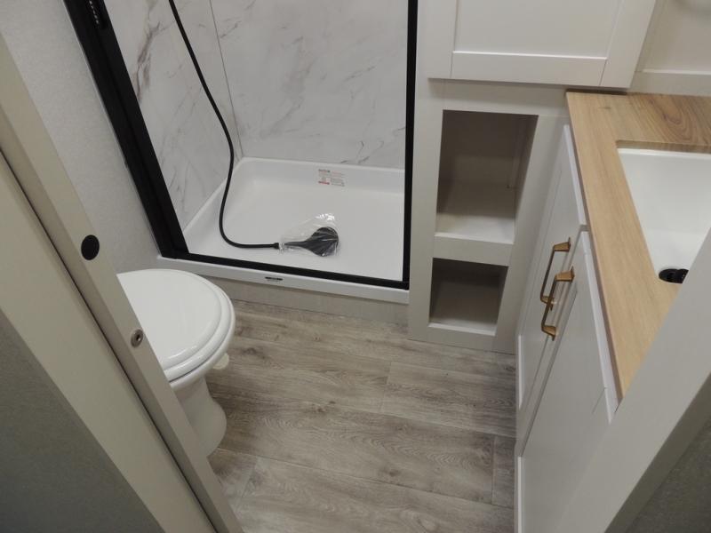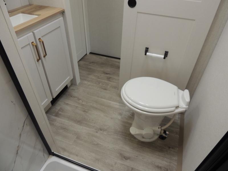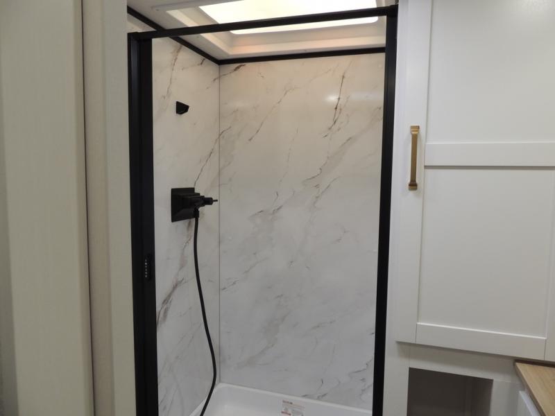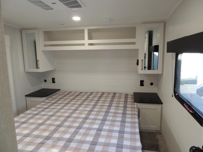 With any Eagle SLE fifth wheel by Jayco, you will enjoy a lighter tow weight, high-end finishes, and the same quality construction you've come to expect from Jayco! There is an Alpha Ply TPO roof membrane, a fully enclosed and heated underbelly, plus Stronghold VBL walls for added durability. There is also a rear 2" towing receiver outside, along with metal slam latch baggage doors, MORryde Step Above entry steps, and a Winegard Air 360 antenna with router prep if you want to stay connected as you camp. Once inside you'll enjoy the handcrafted door/drawer fronts, shower skylight, and residential vinyl flooring throughout with no carpet for an easier clean. The on-demand water heater, 30K BTU furnace, and 15K BTU "Whisper Quiet" A/C will ensure your comfort, and the Overland 1 Solar Package will provide off-grid capabilities!
