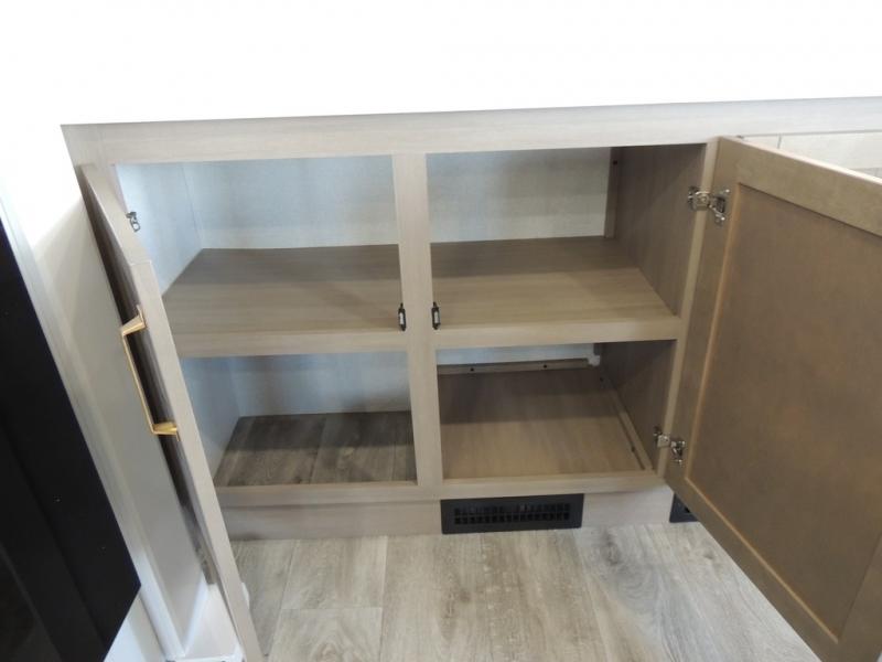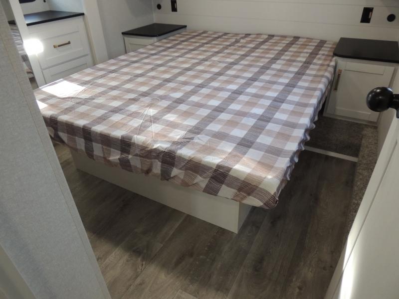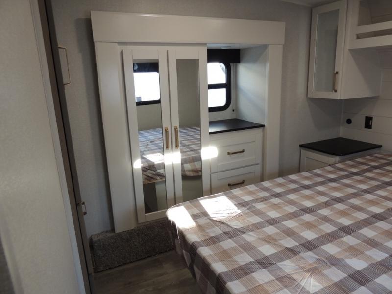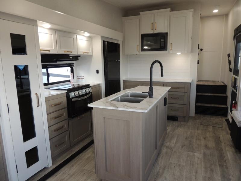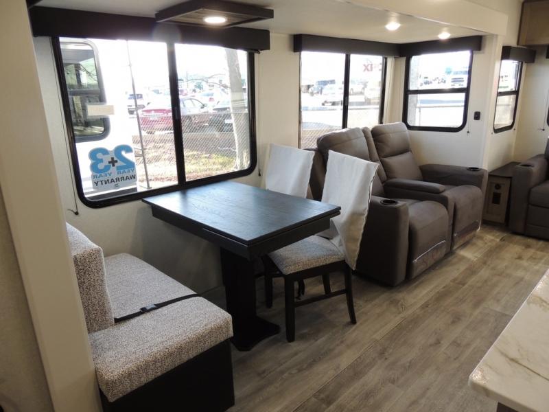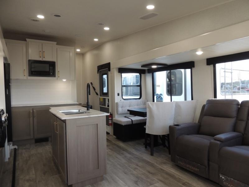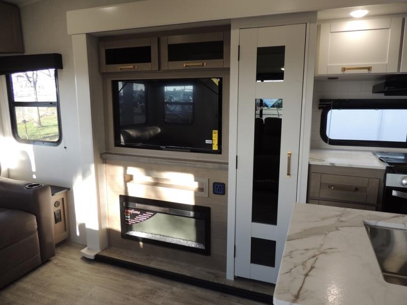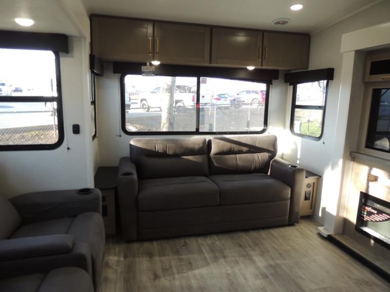 You can't go wrong when camping in this spacious fifth wheel! There are dual opposing slides in the living room, giving your crew plenty of space to prep dinner on the kitchen island, relax on the theater sofa, or dine at the booth dinette. There is also a rear tri-fold sofa where your guests can sleep! An entertainment center with a fireplace will make this space feel even more like home, and there are plenty of storage spaces for all your belongings. The full bath towards the front will let you freshen up each day, and the front private bedroom with a queen bed is sure to bring comfort. There are also dual nightstands, overhead cabinets, plus a wardrobe and dresser slide out, so everything has a place!