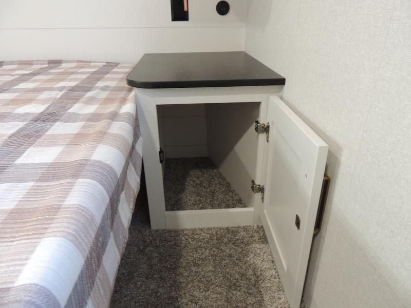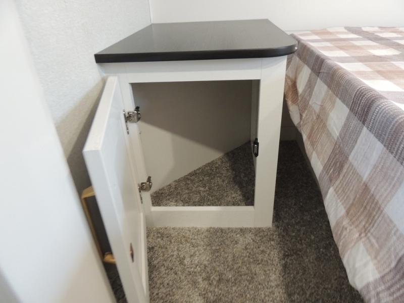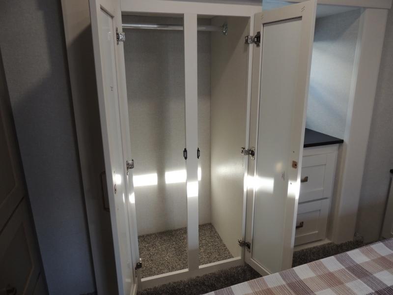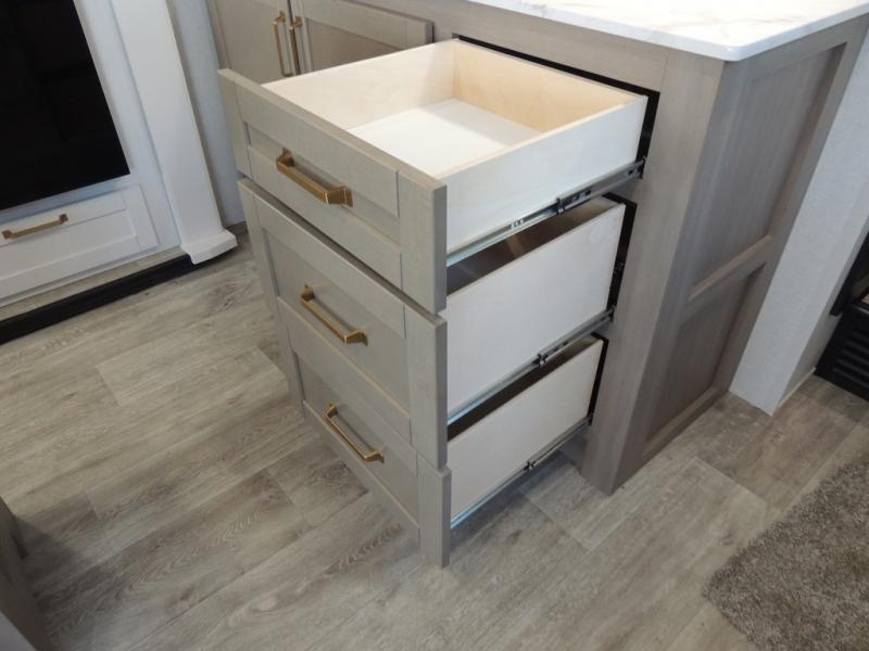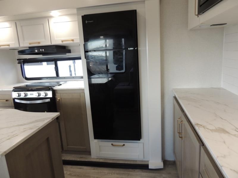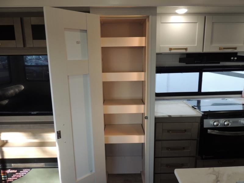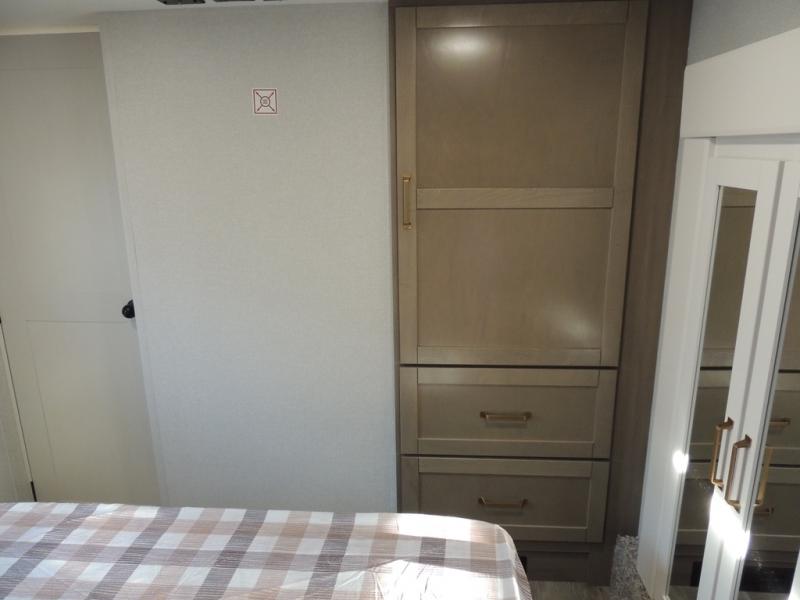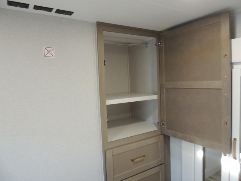 You can't go wrong when camping in this spacious fifth wheel! There are dual opposing slides in the living room, giving your crew plenty of space to prep dinner on the kitchen island, relax on the theater sofa, or dine at the booth dinette. There is also a rear tri-fold sofa where your guests can sleep! An entertainment center with a fireplace will make this space feel even more like home, and there are plenty of storage spaces for all your belongings. The full bath towards the front will let you freshen up each day, and the front private bedroom with a queen bed is sure to bring comfort. There are also dual nightstands, overhead cabinets, plus a wardrobe and dresser slide out, so everything has a place!