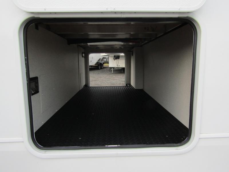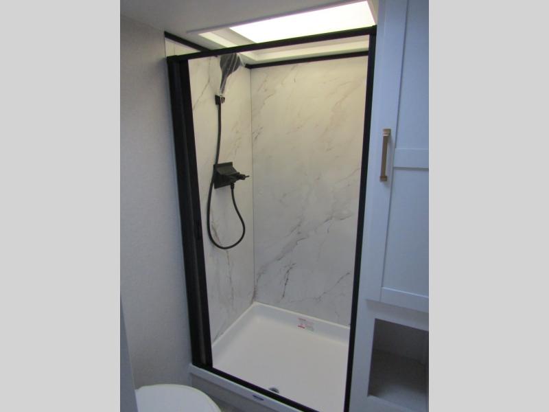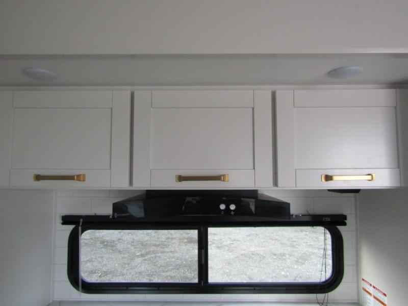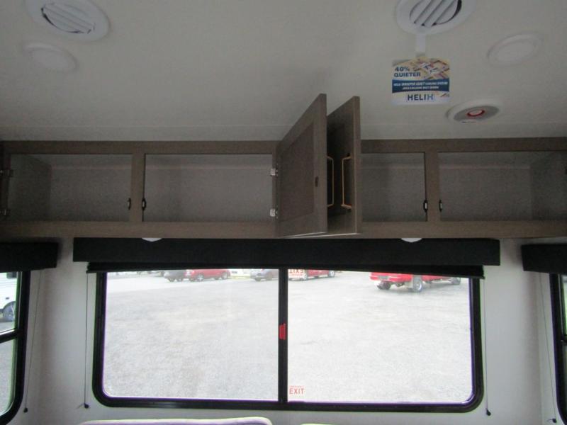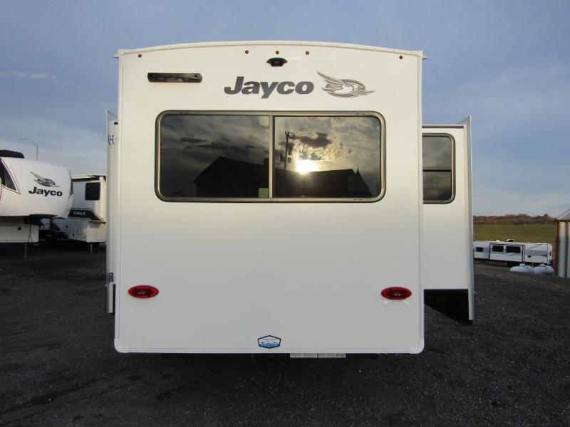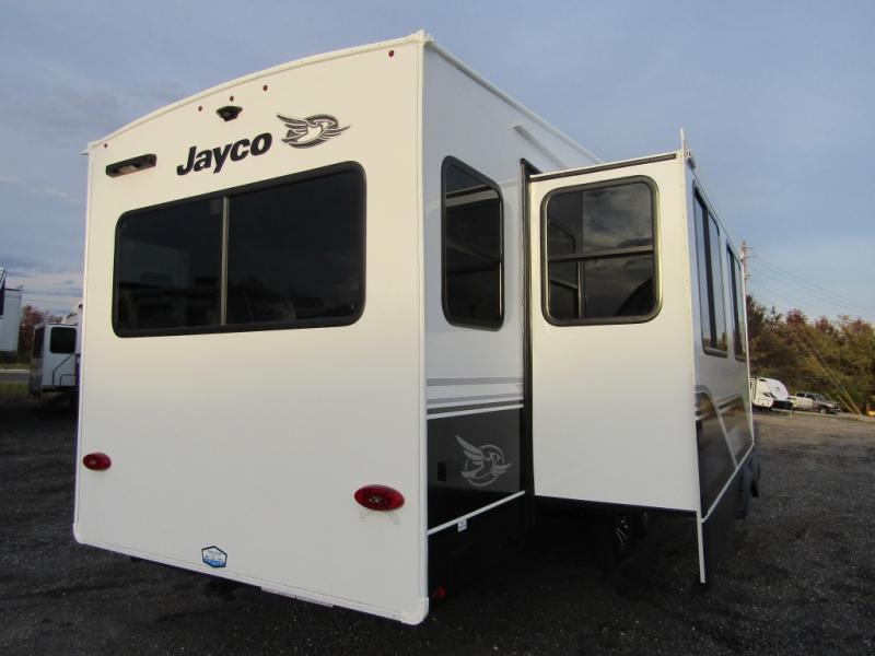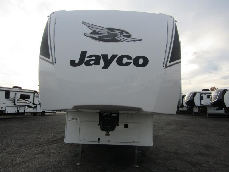 With any Eagle SLE fifth wheel by Jayco, you will enjoy a lighter tow weight, high-end finishes, and the same quality construction you've come to expect from Jayco! There is an Alpha Ply TPO roof membrane, a fully enclosed and heated underbelly, plus Stronghold VBL walls for added durability. There is also a rear 2" towing receiver outside, along with metal slam latch baggage doors, MORryde Step Above entry steps, and a Winegard Air 360 antenna with router prep if you want to stay connected as you camp. Once inside you'll enjoy the handcrafted door/drawer fronts, shower skylight, and residential vinyl flooring throughout with no carpet for an easier clean. The on-demand water heater, 30K BTU furnace, and 15K BTU "Whisper Quiet" A/C will ensure your comfort, and the Overland 1 Solar Package will provide off-grid capabilities!