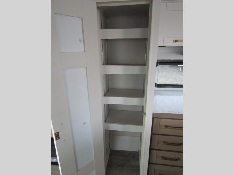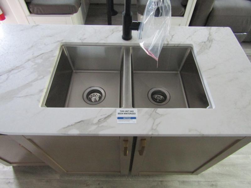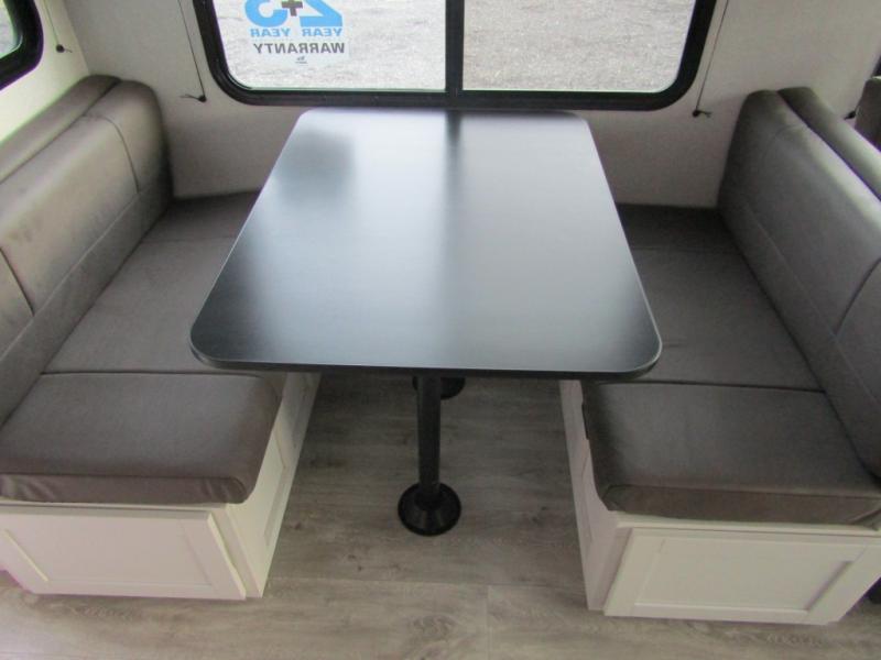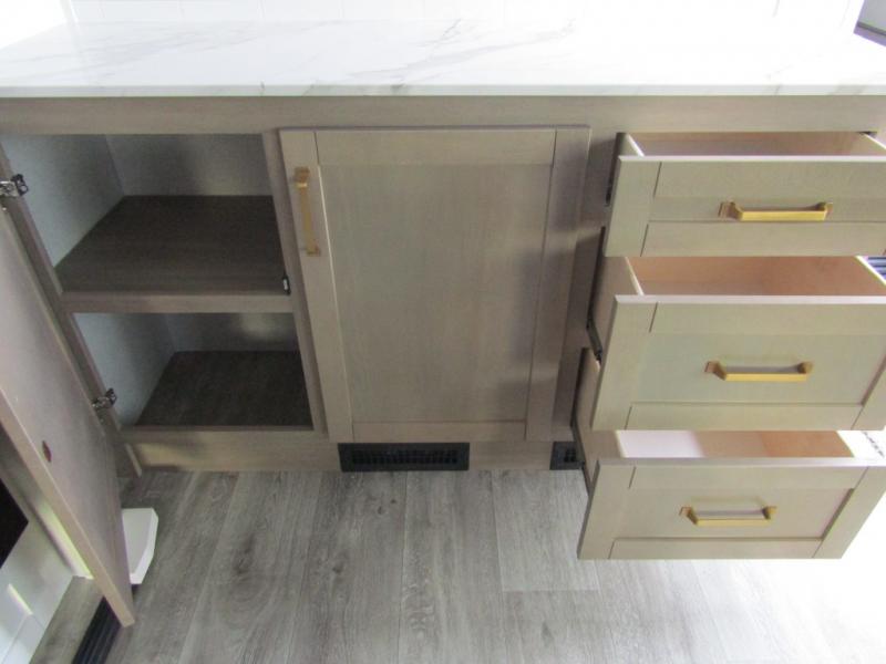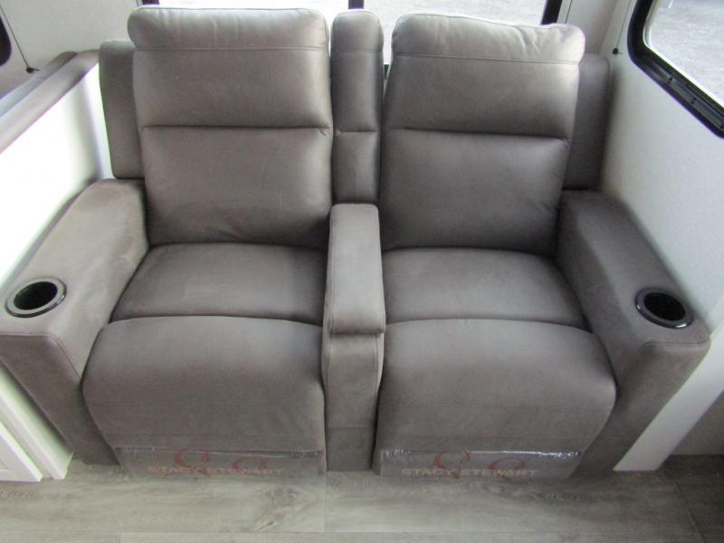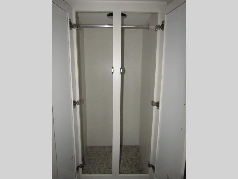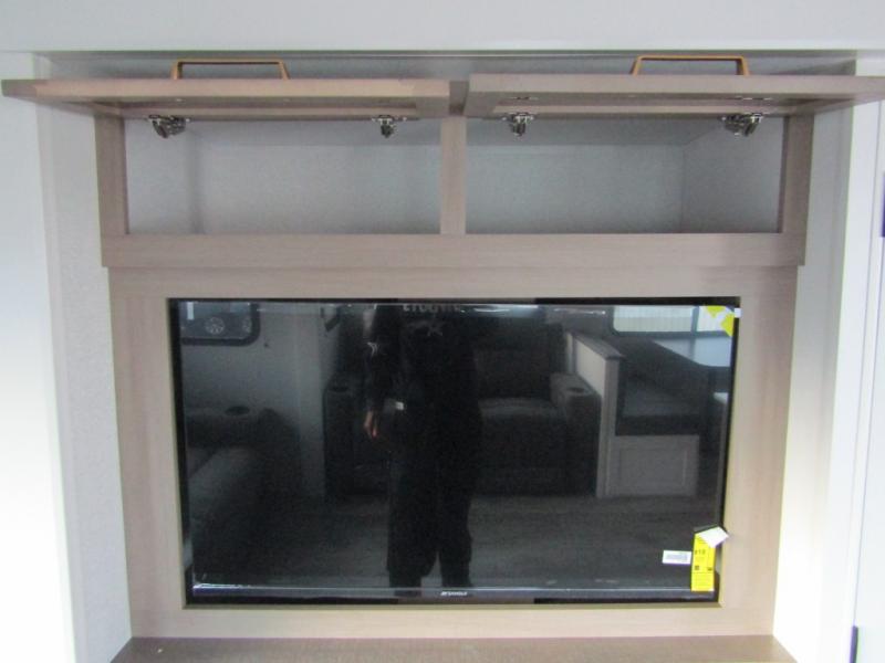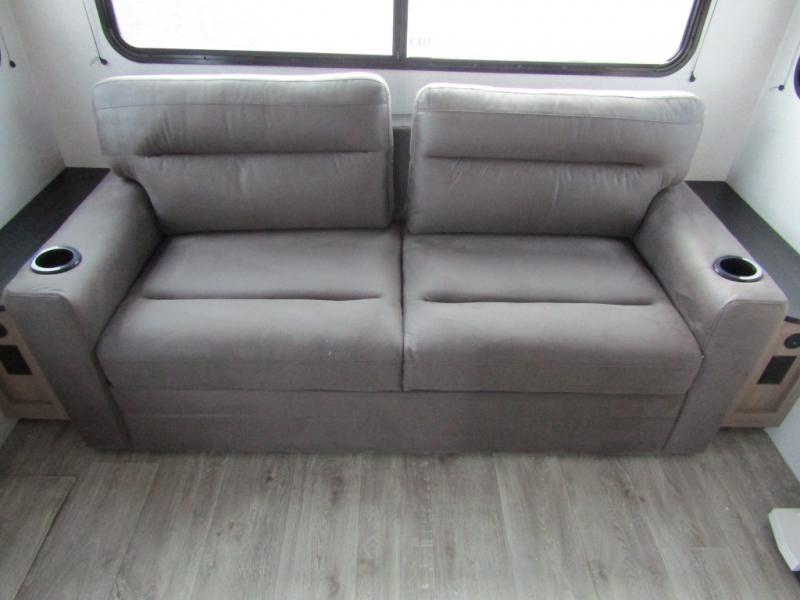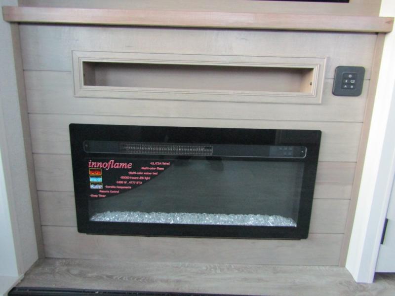 You can't go wrong when camping in this spacious fifth wheel! There are dual opposing slides in the living room, giving your crew plenty of space to prep dinner on the kitchen island, relax on the theater sofa, or dine at the booth dinette. There is also a rear tri-fold sofa where your guests can sleep! An entertainment center with a fireplace will make this space feel even more like home, and there are plenty of storage spaces for all your belongings. The full bath towards the front will let you freshen up each day, and the front private bedroom with a queen bed is sure to bring comfort. There are also dual nightstands, overhead cabinets, plus a wardrobe and dresser slide out, so everything has a place!