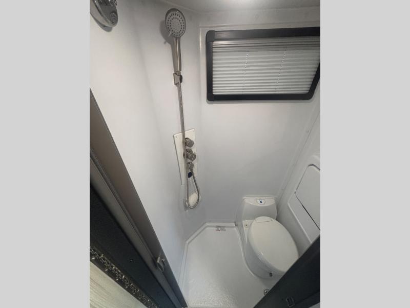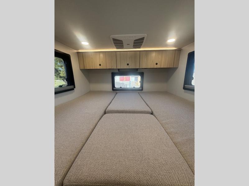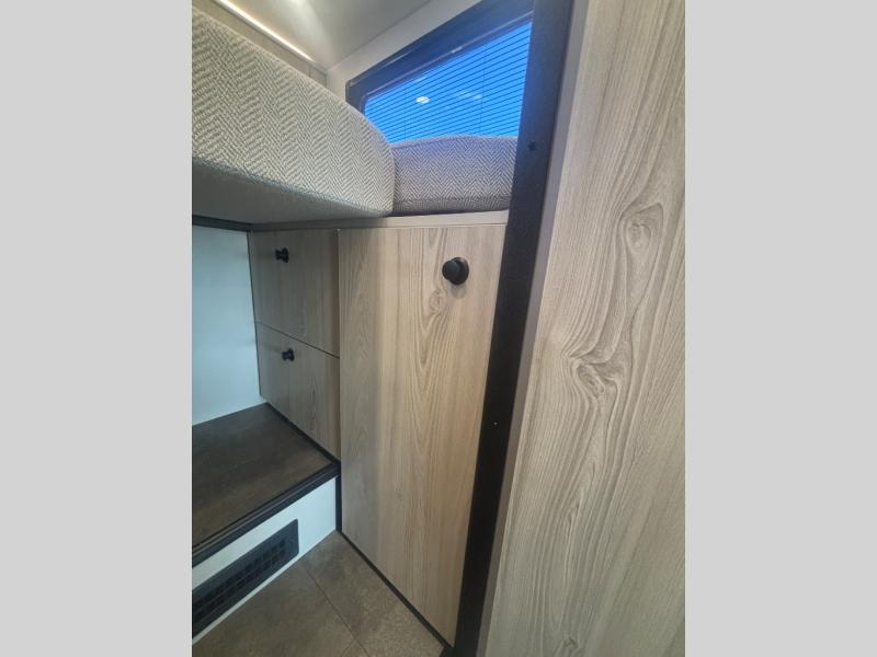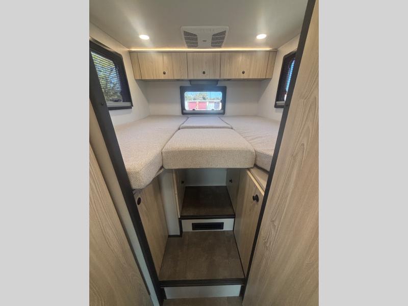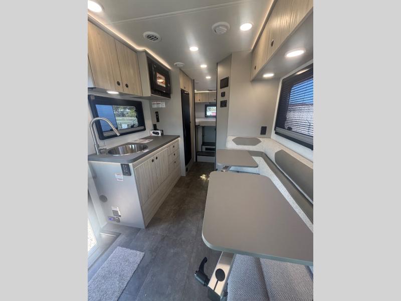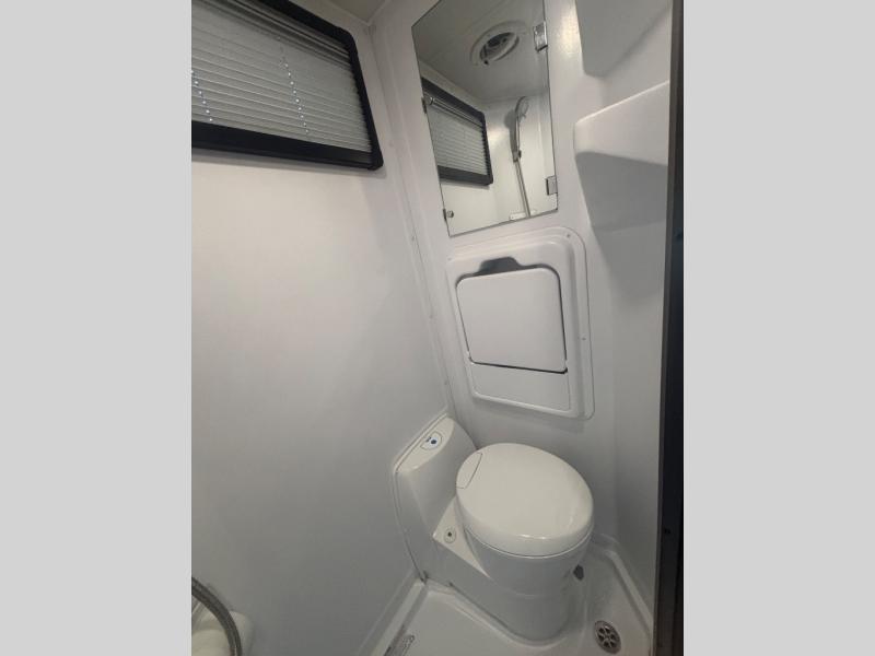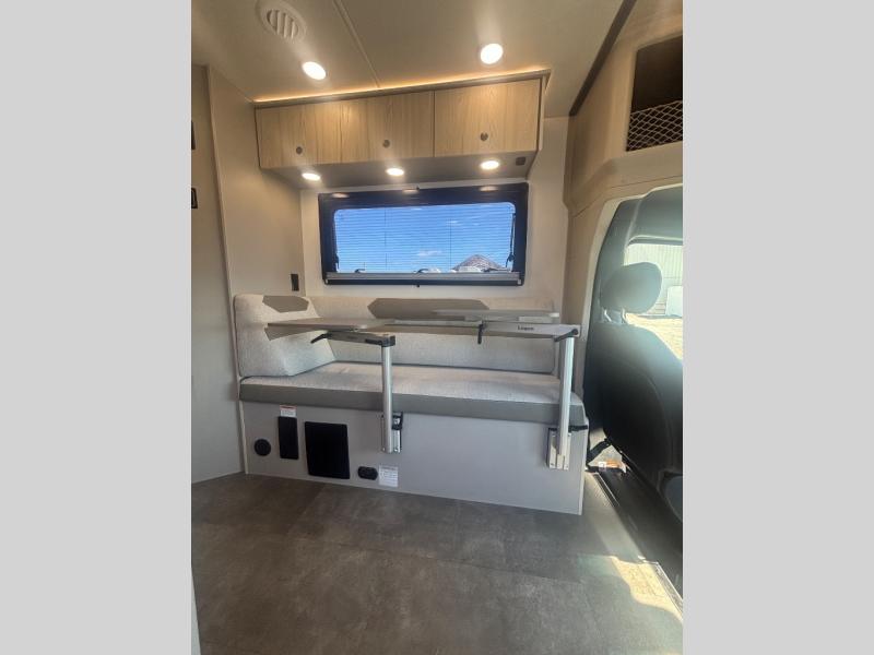 Whether you're roughing it in the mountains or relaxing in the woods, this coach is sure to meet all your needs. The swivel seats can turn around once you're parked to become a part of the living space, and you'll also find a 68" bench with removable tables here where you can enjoy your coffee at each morning. There is an induction cooktop and a convection microwave to prepare dinner, a 5.3 cu. ft. 12V refrigerator to store cold items, and even a pantry for snacks! This van is perfect for couples or friends since there are twin beds with a king bed conversion so you can choose two beds or one big bed, and the optional pop-top can be added if you're needing additional sleeping space!