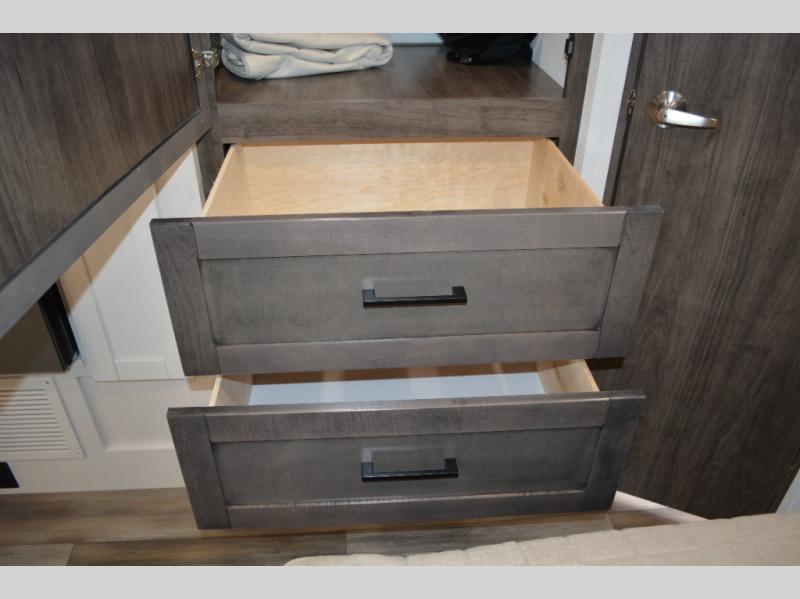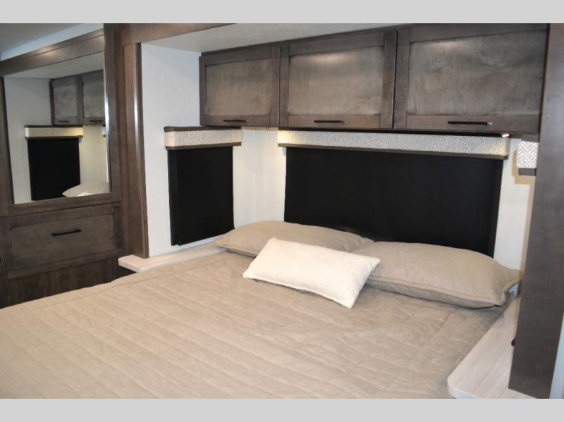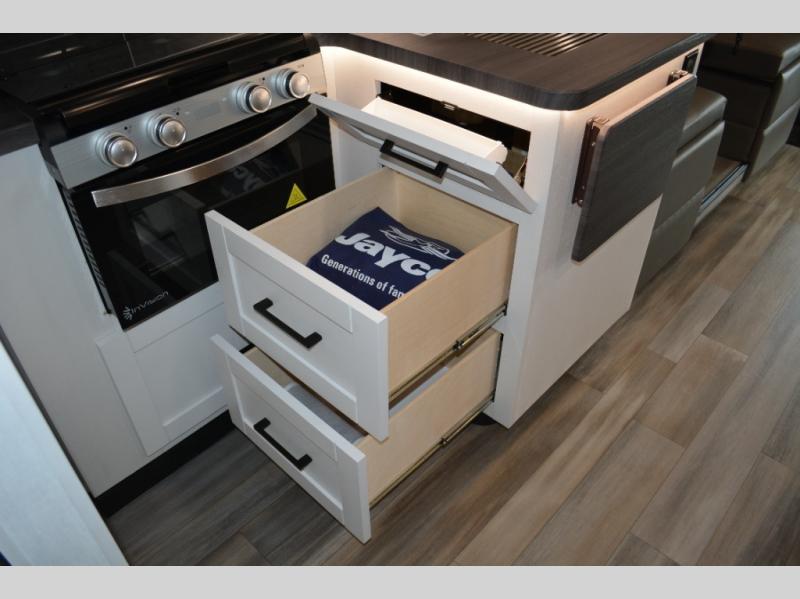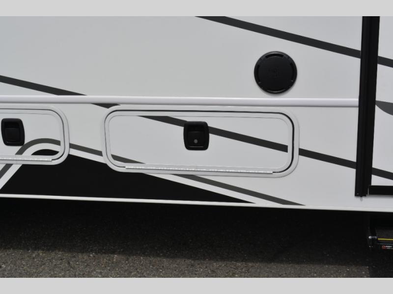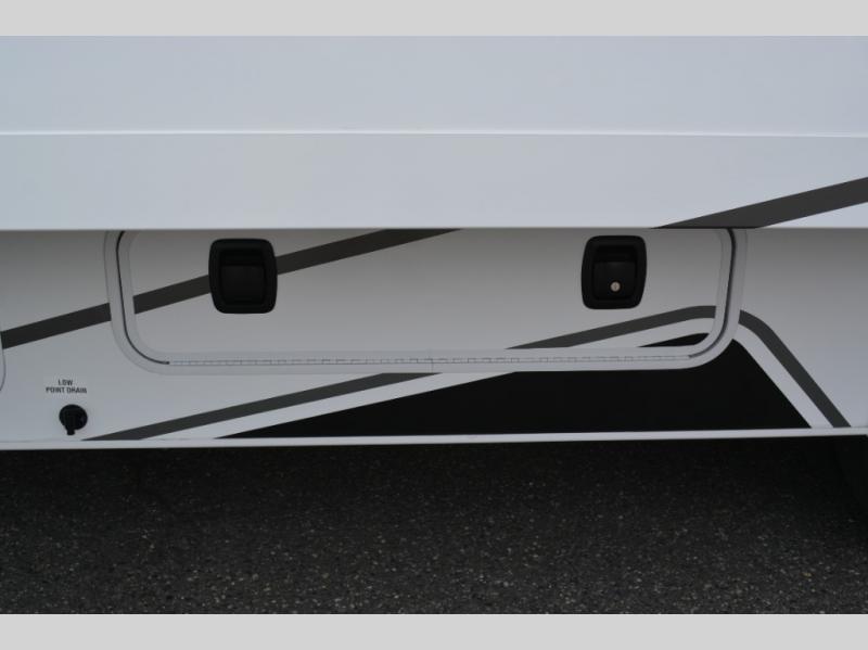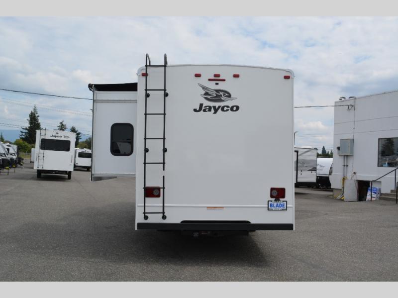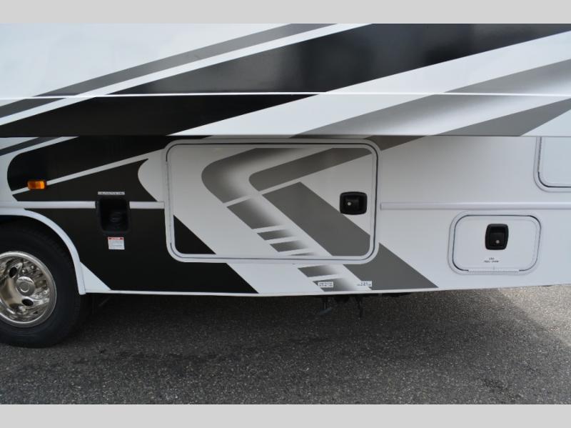 With any Greyhawk Class C gas motorhome by Jayco you will experience smooth sailing thanks to the JRIDE PLUS that comes with Koni shock absorbers, a computer-balanced driveshaft, Hellwig helper springs, and more. The Ford E-450 chassis with a 7.3L V8 325 HP engine will power your excursions, and you'll appreciate the added safety features for your peace of mind. Each model features a Sony infotainment center with Apple CarPlay and Android Auto, backup and side-view cameras, and a tire pressure monitor system the driver is sure to appreciate. Durable construction begins with Stronghold VBL roof, floor and sidewalls, bead-foam insulation, and a one-piece seamless fiberglass front cap. Head inside to find blackout night roller shades, LED-lit pressed countertops, an 84" interior ceiling height, and hardwood cabinet doors and drawers.