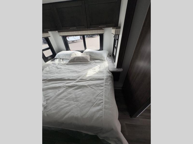 With any Greyhawk Class C gas motorhome by Jayco you will experience smooth sailing thanks to the JRIDE PLUS that comes with Koni shock absorbers, a computer-balanced driveshaft, Hellwig helper springs, and more. The Ford E-450 chassis with a 7.3L V8 325 HP engine will power your excursions, and you'll appreciate the added safety features for your peace of mind. Each model features a Sony infotainment center with Apple CarPlay and Android Auto, backup and side-view cameras, and a tire pressure monitor system the driver is sure to appreciate. Durable construction begins with Stronghold VBL roof, floor and sidewalls, bead-foam insulation, and a one-piece seamless fiberglass front cap. Head inside to find blackout night roller shades, LED-lit pressed countertops, an 84" interior ceiling height, and hardwood cabinet doors and drawers.