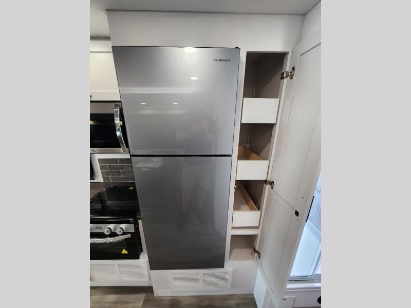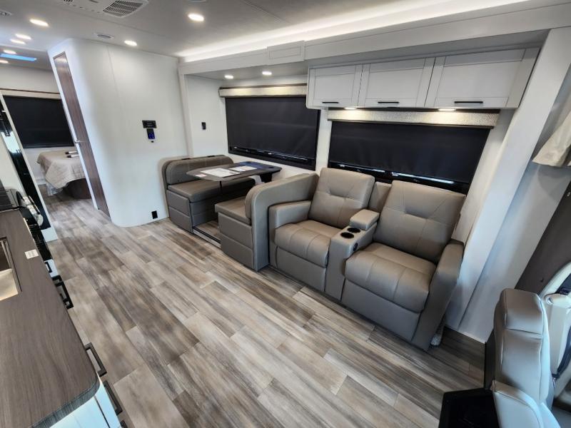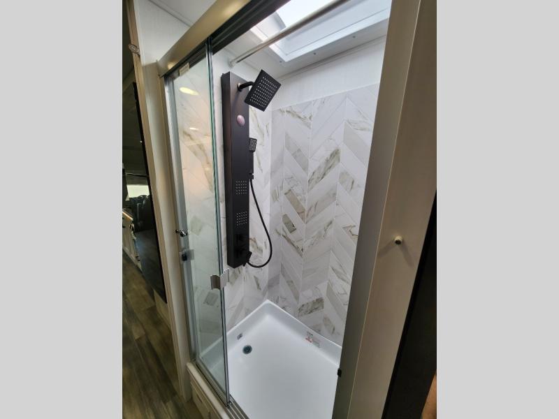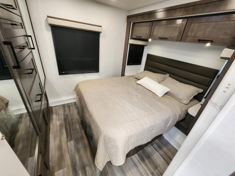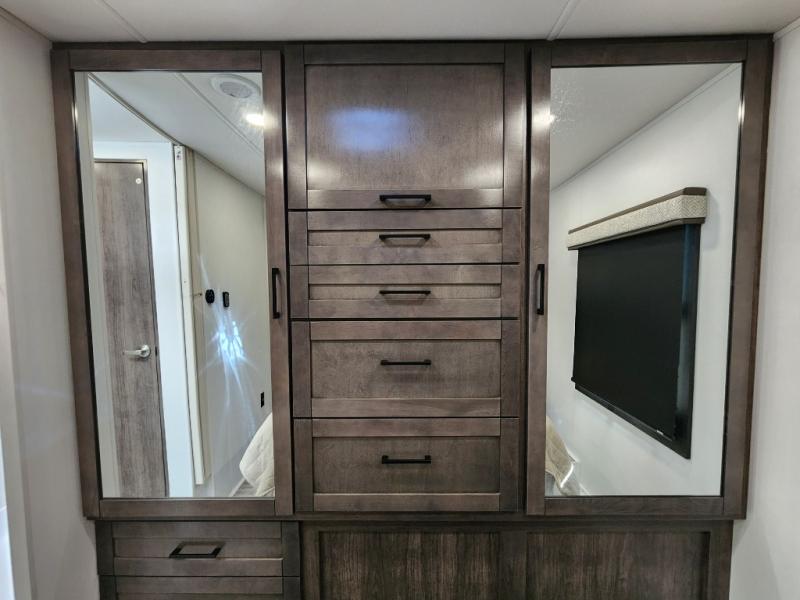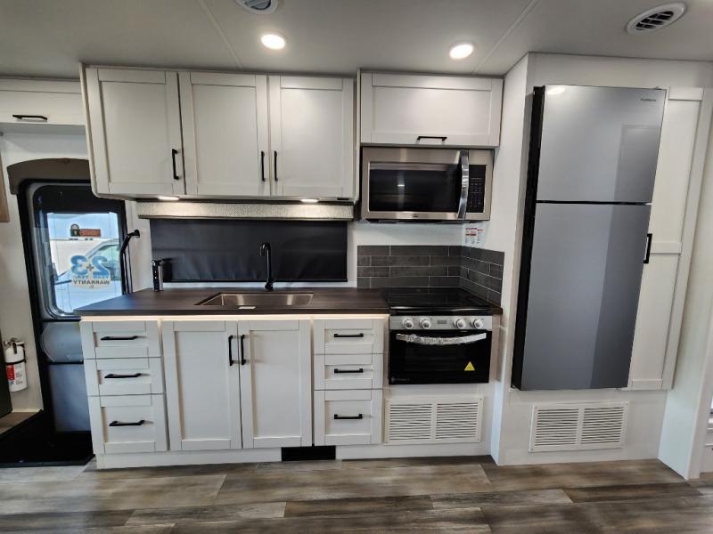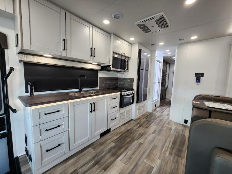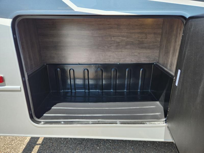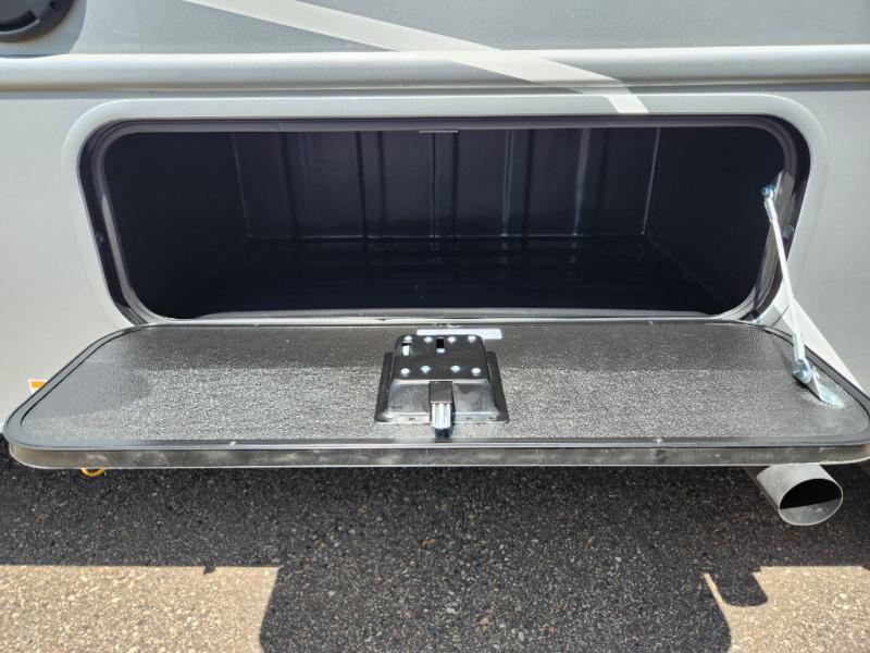 This motorhome includes double slides so you can enjoy more interior space, just like at home! The 42" x 70" booth dinette and 60" tri-fold sofa are in great view of the LED HD Smart TV, and your guests can sleep here, as well as on the cab-over bunk. This Greyhawk kitchen includes a Furrion all-in-one cooktop and oven, a residential-size microwave, and a pantry to store dry goods. You will find a convenient 30" x 36" shower, with the private toilet and sink across the hall so two people can freshen up at once. And don't overlook the rear bedroom with its queen bed slide out, dual bedroom wardrobes, and cabinet!