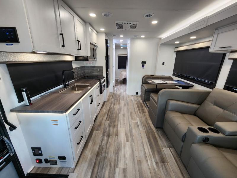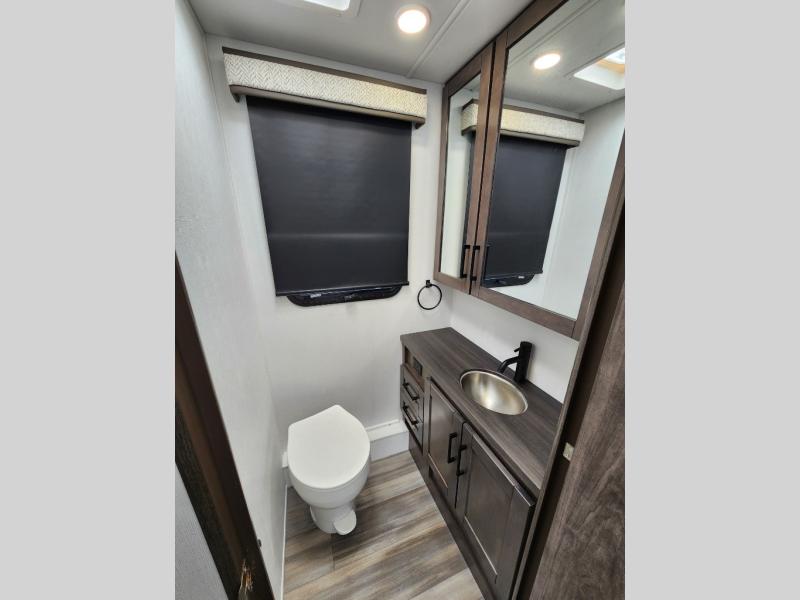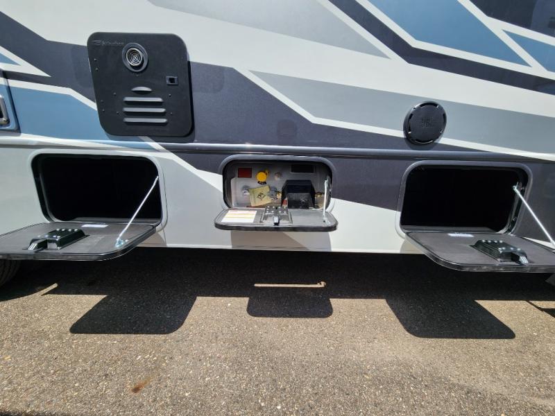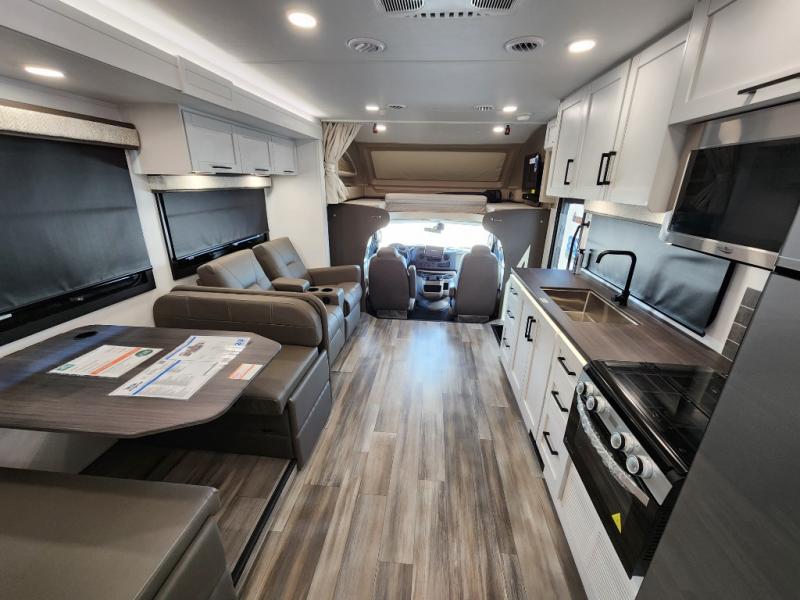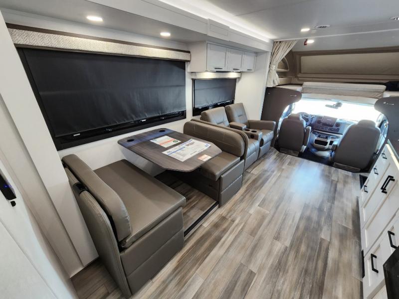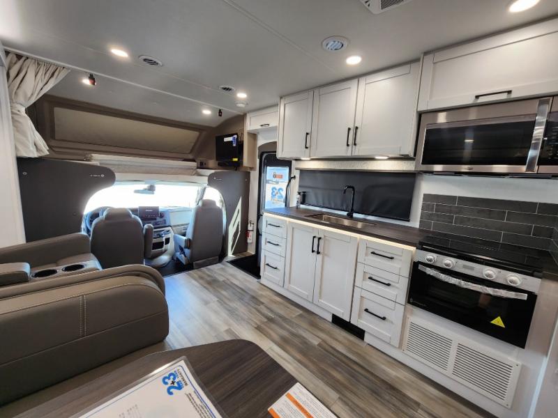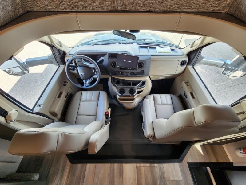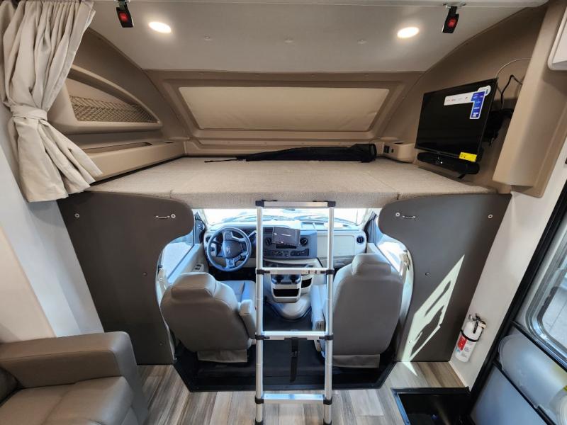 With any Greyhawk Class C gas motorhome by Jayco you will experience smooth sailing thanks to the JRIDE PLUS that comes with Koni shock absorbers, a computer-balanced driveshaft, Hellwig helper springs, and more. The Ford E-450 chassis with a 7.3L V8 325 HP engine will power your excursions, and you'll appreciate the added safety features for your peace of mind. Each model features a Sony infotainment center with Apple CarPlay and Android Auto, backup and side-view cameras, and a tire pressure monitor system the driver is sure to appreciate. Durable construction begins with Stronghold VBL roof, floor and sidewalls, bead-foam insulation, and a one-piece seamless fiberglass front cap. Head inside to find blackout night roller shades, LED-lit pressed countertops, an 84" interior ceiling height, and hardwood cabinet doors and drawers.