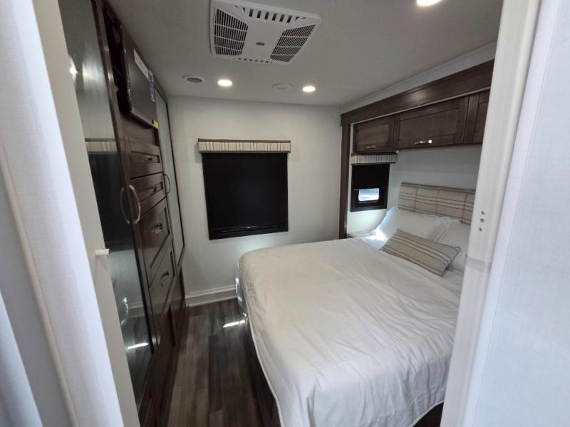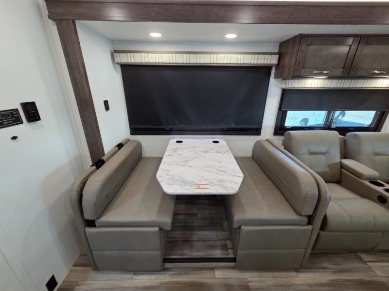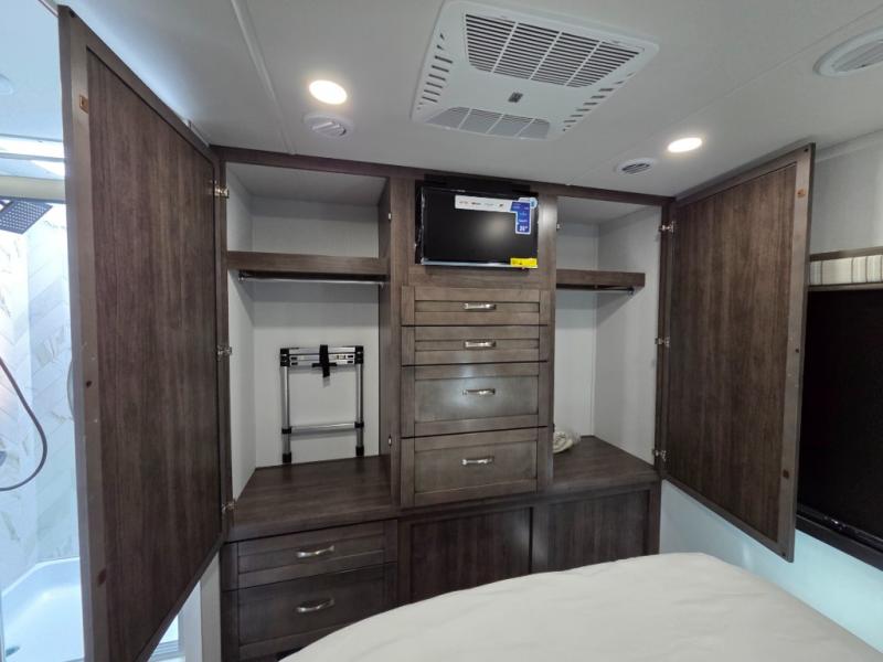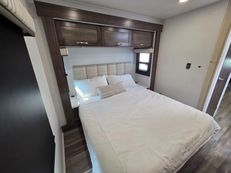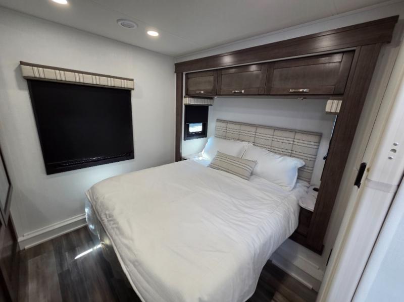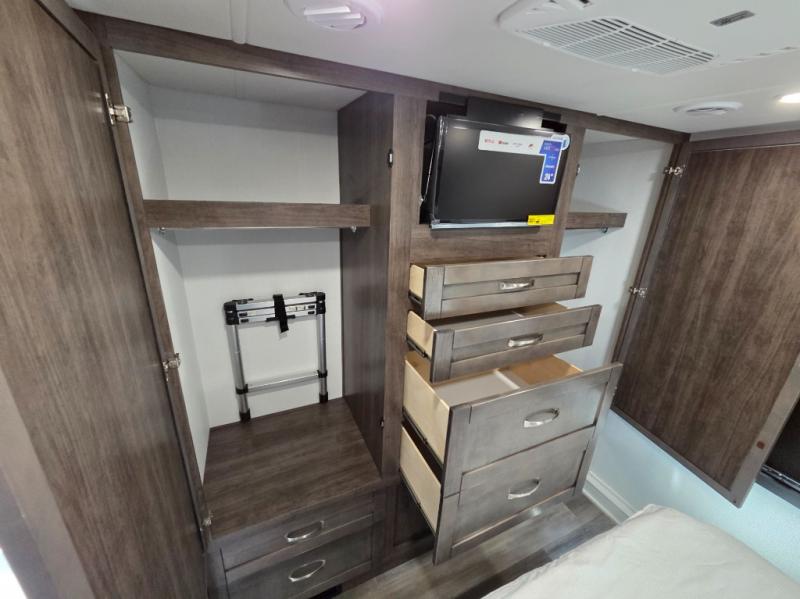 This motorhome includes double slides so you can enjoy more interior space, just like at home! The 42" x 70" booth dinette and 60" tri-fold sofa are in great view of the LED HD Smart TV, and your guests can sleep here, as well as on the cab-over bunk. This Greyhawk kitchen includes a Furrion all-in-one cooktop and oven, a residential-size microwave, and a pantry to store dry goods. You will find a convenient 30" x 36" shower, with the private toilet and sink across the hall so two people can freshen up at once. And don't overlook the rear bedroom with its queen bed slide out, dual bedroom wardrobes, and cabinet!